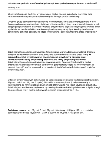 Jak dokonać podziału kosztów w budynku częściowo podnajmowanym innemu podmiotowi? Wpisany przez W przypadku części budynku wynajmowanej osobie trzeciej, przychody z czynszu oraz refakturowane koszty eksploatacji stanowią dla firmy przychód podatkowy. Do jakiej grupy zakwalifikować zakupioną nieruchomość, która jest wykorzystywana w 11% (biorąc pod uwagę powierzchnię użytkową obiektu) na biuro firmy, a w pozostałej części w celu osiągnięcia przychodów z czynszu? Oprócz przychodów z czynszu otrzymujemy również zwrot wydatków za media (refakturowanie energii elektrycznej, wody itp.). Według jakich zasad powinniśmy dokonać podziału na część inwestycyjną i część zajmowaną przez właściciela? Jeżeli nieruchomość stanowi własność firmy i została wprowadzona do ewidencji środków trwałych, to wszelkie czynności z nią związane powinny być rozliczane przez firmę. W przypadku części wynajmowanej osobie trzeciej przychody z czynszu oraz refakturowane koszty eksploatacji stanowią dla firmy przychód podatkowy. Jeżeli nieruchomość stanowi własność prywatną osoby fizycznej (nie firmy) i ta osoba przekazała na prowadzenie swojej działalności gospodarczej część tej nieruchomości, to również tę część można wprowadzić do ewidencji środków trwałych i dokonywać odpisów amortyzacyjnych. Odpisów amortyzacyjnych dokonujesz od ustalonej proporcjonalnie wartości początkowej (art. 22g ust. 10 lub art. 22g ust. 3 updof). Wszelkie koszty eksploatacji związane wtedy z wprowadzoną do firmy częścią nieruchomości stanowią dla niej koszt uzyskania przychodu. Jeżeli nie jest możliwe wyodrębnienie np. według liczników dokładnych kosztów zużycia energii itp. przez biuro firmy, można dokonywać rozliczeń proporcjonalnie (11%). Podstawa prawna: art. 22g ust. 3 i art. 22g ust. 10 ustawy z 26 lipca 1991 r. o podatku dochodowym od osób fizycznych - Dz.U. z 2000 r. nr 14, poz. 176 z późn. zm. 1/1