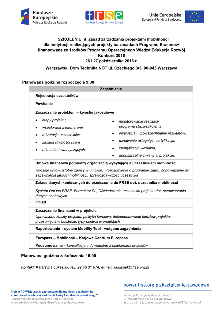 SZKOLENIE nt. zasad zarządzania projektami mobilności dla instytucji realizujących projekty na zasadach Programu Erasmus+ finansowane ze środków Programu Operacyjnego Wiedza Edukacja Rozwój Konkurs 2016 26 i 27 października 2016 r. Warszawski Dom Technika NOT ul. Czackiego 3/5, 00-043 Warszawa Planowana godzina rozpoczęcia 9:30 Zagadnienia Rejestracja uczestników Powitanie Zarządzanie projektem – kwestie jakościowe etapy projektu, współpraca z partnerami, monitorowanie realizacji programu stażu/szkolenia rekrutacja uczestników, ewaluacja i upowszechnianie rezultatów, zasada równości szans, uznawanie osiągnięć, certyfikacja, rola osób towarzyszących, identyfikacja wizualna, dopuszczalne zmiany w projekcie. Umowa finansowa pomiędzy organizacją wysyłającą a uczestnikiem mobilności Rodzaje umów, istotne zapisy w umowie, Porozumienie o programie zajęć, Zobowiązanie do zapewnienia jakości mobilności, sprawozdawczość uczestnika Zakres danych koniecznych do przekazania do FRSE dot. uczestnika mobilności System OnLine FRSE, Formularz SL, Oświadczenie uczestnika projektu dot. przetwarzania danych osobowych Obiad Zarządzanie finansami w projekcie Uprawnione koszty projektu; polityka kursowa; dokumentowanie kosztów projektu; przesunięcia w budżecie; typy kontroli w projektach Raportowanie – system Mobility Tool - wstępne zagadnienia Europass – Mobilność – Krajowe Centrum Europass Podsumowanie – konsultacje indywidualne z opiekunami projektów Planowana godzina zakończenia 16:00 Kontakt: Katarzyna Łukasiak, tel.: 22 46 31 674, e-mail: [email protected]