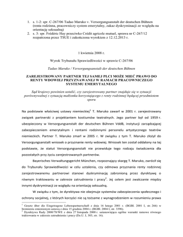 1. s. 1-2: spr. C-267/06 Tadao Maruko v. Versorgungsanstalt der deutschen Bühnen (renta rodzinna, pracowniczy system emerytalny, zakaz dyskryminacji ze względu na orientację seksualną) 2. s. 3: spr. Frédéric Hay przeciwko Crédit agricole mutuel, sprawa nr C-267/12 rozpatrzona przez TSUE i zakończona wyrokiem z 12.12.2013 r. 1 kwietnia 2008 r. Wyrok Trybunału Sprawiedliwości w sprawie C-267/06 Tadao Maruko / Versorgungsanstalt der deutschen Bühnen ZAREJESTROWANY PARTNER TEJ SAMEJ PŁCI MOŻE MIEĆ PRAWO DO RENTY WDOWIEJ PRZYZNAWANEJ W RAMACH PRACOWNICZEGO SYSTEMU EMERYTALNEGO Sąd krajowy powinien ustalić, czy zarejestrowany partner znajduje się w sytuacji porównywalnej z sytuacją małżonka korzystającego z renty rodzinnej będącej przedmiotem sporu Na podstawie właściwej ustawy niemieckiej1 T. Maruko zawarł w 2001 r. zarejestrowany związek partnerski z projektantem kostiumów teatralnych. Jego partner był od 1959 r. ubezpieczony w Versorgungsanstalt der deutschen Bühnen VddB, instytucji zarządzającej zabezpieczeniem emerytalnym i rentami rodzinnymi personelu artystycznego teatrów niemieckich. Partner T. Maruko zmarł w 2005 r. W związku z tym T. Maruko złożył do Versorgungsanstalt wniosek o przyznanie renty wdowiej. Wniosek ten został oddalony na tej podstawie, że statut Versorgungsanstalt nie przewiduje tego rodzaju świadczenia dla pozostałych przy życiu zarejestrowanych partnerów. Bayerisches Verwaltungsgericht München, rozpoznający skargę T. Maruko, zwrócił się do Trybunału Sprawiedliwości w celu ustalenia, czy odmowa przyznania renty rodzinnej zarejestrowanemu partnerowi stanowi dyskryminację zabronioną przez dyrektywę o równym traktowaniu w zakresie zatrudnienia i pracy2. Jej celem jest zwalczanie między innymi dyskryminacji ze względu na orientację seksualną. W związku z tym, że dyrektywa nie obejmuje systemów zabezpieczenia społecznego i ochrony socjalnej, z których korzyści nie są tożsame z wynagrodzeniem w rozumieniu prawa 1 Gesetz über die Eingetragene Lebenspartnerschaft z dnia 16 lutego 2001 r. (BGBl. 2001 I, str. 266) w brzmieniu zmienionym ustawą z dnia 15 grudnia 2004 r. (BGBl. 2004 I, str. 3396). 2 Dyrektywa Rady 2000/78/WE z dnia 27 listopada 2000 r. ustanawiająca ogólne warunki ramowe równego traktowania w zakresie zatrudnienia i pracy (Dz.U. L 303, str. 16). wspólnotowego, do Trybunału zwrócono się o ustalenie, czy będąca przedmiotem sporu renta rodzinna może byd uważana za wynagrodzenie. W tej kwestii Trybunał wskazuje, że źródłem pracowniczego systemu emerytalnego zarządzanego przez VddB jest układ zbiorowy pracy, a jego celem – uzupełnianie świadczeo socjalnych należnych na podstawie powszechnie obowiązujących uregulowao krajowych. System ten jest finansowany wyłącznie przez pracowników i pracodawców, z całkowitym wyłączeniem jakiegokolwiek publicznego udziału finansowego. Ponadto, emerytura, na podstawie której jest obliczana renta rodzinna, dotyczy jedynie szczególnej kategorii pracowników, a jej wysokośd jest ustalana w zależności od okresu ubezpieczenia pracownika i wartości uiszczonych składek. Renta rodzinna wywodzi się zatem ze stosunku pracy zmarłego pracownika, a w konsekwencji należy zakwalifikowad ją jako wynagrodzenie. Z tej przyczyny dyrektywa znajduje zastosowanie. Następnie, przystępując do ustalenia, czy odmowa przyznania renty rodzinnej zarejestrowanemu partnerowi stanowi dyskryminację ze względu na orientację seksualną, Trybunał – w świetle treści postanowienia odsyłającego – stwierdził, że zastrzegając instytucję małżeostwa dla osób odmiennej płci, Niemcy stworzyły jednak instytucję zarejestrowanego związku partnerskiego, którego warunki były stopniowo upodabniane do warunków obowiązujących przy małżeostwie. W tej sytuacji odmowa przyznania renty rodzinnej zarejestrowanym partnerom oznacza, że są oni traktowani w sposób mniej korzystny niż pozostali przy życiu małżonkowie. W konsekwencji Trybunał orzekł, że odmowa przyznania renty rodzinnej zarejestrowanemu partnerowi stanowi bezpośrednią dyskryminację ze względu na orientację seksualną przy założeniu, że pozostali przy życiu małżonkowie i pozostali przy życiu zarejestrowani partnerzy znajdują się w porównywalnej sytuacji w odniesieniu do tej renty rodzinnej. Do Bayerisches Verwaltungsgericht München należy ustalenie, czy warunek ten jest spełniony. Sprawa Frédéric Hay przeciwko Crédit agricole mutuel, sprawa nr C-267/12 rozpatrzona przez TSUE i zakończona wyrokiem z 12.12.2013 r. (szerzej: http://wytrop.homopedia.pl/out/trybunal-sprawiedliwosci-unii-europejskiej-komunikatprasowy-nr-15913-/ komunikat // treść orzeczenia: http://curia.europa.eu/juris/document/document.jsf?text=&docid=145530&pageIndex=0&doclang=PL &mode=req&dir=&occ=first&part=1&cid=723559 ) Przedmiot sprawy Frédéric Hay przeciwko Crédit agricole mutuel W czasie, gdy zaistniały okoliczności będące przedmiotem sporu ustawodawstwo francuskie zastrzegało możliwość zawarcia związku małżeńskiego dla par odmiennej płci. Frédéric Hay był pracownikiem Crédit agricole mutuel, którego układ zbiorowy przyznawał pracownikom z okazji zawarcia przez nich związku małżeńskiego określone korzyści takie jak prawo do urlopu okolicznościowego oraz dodatku płacowego. Frédéricowi Hayowi, który zawarł związek PACS ze swym partnerem tej samej płci, odmówiono tych korzyści z tym uzasadnieniem, że zgodnie z porozumieniem zbiorowym, pracownikowi przysługują one tylko w przypadku zawarcia związku małżeńskiego. Wyrok Trybunału w sprawie Frédéric Hay przeciwko Crédit agricole mutuel Trybunał stwierdził m.in., że sytuacja osób zawierających związek małżeński i sytuacja osób tej samej płci, które wobec braku możliwości zawarcia związku małżeńskiego zawierają PACS, są porównywalne w świetle przyznawania rozpatrywanych ko