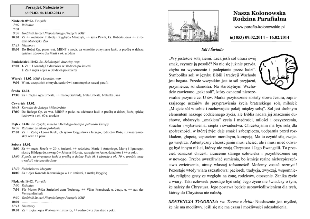 Porządek Nabożeństw Nasza Kolonowska Rodzina Parafialna od 09.02. do 16.02.2014 r. Niedziela 09.02. V zwykła 7:00 Różaniec 7:30 …………………………….. 9:30 Godzinki ku czci Niepokalanego Poczęcia NMP 10:00 Za ++ rodziców Elżbietę i Zygfryda Mańczyk, ++ syna Pawła, ks. Huberta, oraz ++ z rodzin Mańczyk i Żak 17:15 Nieszpory 18:00 Do Bożej Op. przez wst. MBNP z podz. za wszelkie otrzymane łaski, z prośbą o dalszą opiekę i zdrowie dla Marii z ok. urodzin Poniedziałek 10.02. św. Scholastyki, dziewicy, wsp. 17:00 1. Za + Leonardę Dudarewicz w 30 dzień po śmierci 2. Za + męża i ojca w 30 dzień po śmierci Wtorek 11.02. NMP z Lourdes, wsp. 9:00 W int. wszystkich chorych, seniorów i samotnych z naszej parafii Środa 12.02. 17:00 Za + męża i ojca Ernesta, ++ matkę Gertrudę, brata Ernesta, bratanka Jana Czwartek 13.02. 16:45 Koronka do Bożego Miłosierdzia 17:00 Do Bożego Op. za wst. MBNP z podz. za odebrane łaski z prośbą o dalszą Bożą opiekę i zdrowie z ok. 60 r. urodzin Piątek 14.02. św. Cyryla, mnicha i Metodego biskupa, patronów Europy 16:30 Różaniec za młode pokolenie 17:00 Za ++ Zofię i Leona Kruk, ich synów Bogusława i Jerzego, rodziców Różę i Franza Smieskol oraz ++ pokr. Sobota 15.02. 8:00 Za ++ męża Józefa w 20 r. śmierci, ++ rodziców Marię i Antoniego, Marię i Ignacego, siostrę Hildegardę, szwagrów Johana i Horsta, szwagierkę Annę, dziadków i ++ z pokr. 15:00 Z podz. za otrzymane łaski z prośbą o dalsze Boże bł. i zdrowie z ok. 70 r. urodzin oraz o radość wieczną dla żony —–————–——————–—————–—————————–––—— 17:30 Nabożeństwo Maryjne 18:00 Za + ojca Konrada Kozarskiego w 1 r. śmierci, + matkę Brygidę Niedziela 16.02. V zwykła 7:00 Różaniec 7:30 Für Mutter Róża Smieskol zum Todestag, ++ Väter Franciszek u. Jerzy, u. ++ aus der Verwandtschaft 9:30 Godzinki ku czci Niepokalanego Poczęcia NMP 10:00 ……………………… 17:15 Nieszpory 18:00 Za + męża i ojca Wiktora w r. śmierci, ++ rodziców z obu stron i pokr. www.parafia-kolonowskie.pl 6(1053) 09.02.2014 – 16.02.2014 Sól i Światło „Wy jesteście solą ziemi. Lecz jeśli sól utraci swój smak, czymże ją posolić? Na nic się już nie przyda, chyba na wyrzucenie i podeptanie przez ludzi”. Symbolika soli w języku Biblii i tradycji Wschodu jest bogata. Przede wszystkim jest to sól przyjaźni, przymierza, solidarności. Na starożytnym Wschodzie zawierano „pakt soli”, który oznaczał nierozerwalne przymierze. U św. Marka przytoczone zostały słowa Jezusa, zapraszającego uczniów do przyprawienia życia braterskiego solą miłości: „Miejcie sól w sobie i zachowujcie pokój między sobą”. Sól jest drobnym elementem naszego codziennego życia, ale Biblia nadała jej znaczenie duchowe, obdarzyła „smakiem” życia i mądrości, miłości i oczyszczenia, strachu i wybawienia, ciepła i świadectwa. Chrześcijanin ma być solą dla społeczności, w której żyje: daje smak i zabezpiecza, uodparnia przed rozkładem, głupotą, zepsuciem moralnym, korupcją. Ma to czynić siłą swojego wnętrza. Autentyczny chrześcijanin musi chcieć, ale i musi mieć odwagę być innym niż ci, którzy nie znają Chrystusa i Jego Ewangelii. To przecież oznaczał chrzest: zrzucenie starego człowieka i przyobleczenie się w nowego. Trzeba uwrażliwiać sumienia, bo istnieje realne niebezpieczeństwo zwietrzenia, utraty własnej tożsamości! Możemy zostać rozmyci! Pozostaje wtedy wiara szczątkowa: paciorek, tradycja, zwyczaj, wspomnienie, religijne gesty ze względu na żonę, rodziców, otoczenie. Zanika życie z wiary. Taki człowiek przestaje być solą! Jego życie nie świadczy o tym, że należy do Chrystusa. Jego postawa będzie usprawiedliwieniem dla tych, którzy do Chrystusa nie należą. SENTENCJA TYGODNIA: św. Teresa z Ávila: Niesłusznie jest myśleć, że nie ma modlitwy, jeśli się nie ma czasu i możliwości odosobnienia. 6/2014 Rozliczenie Parafialnego Zespołu Caritas za 2013 rok Przychody: saldo z 2013 r. członkowie wspierający bezimienni darczyńcy sponsorzy kiermasz wielkanocny sprzedaż kwiatów (15.08) kolekta urodzinowa kiermasz adwentowy Wydatki: jubilaci, odwiedziny chorych dzień chorych, tydzień miłosierdzia zakup żywności, lekarstw zapomogi okolicznościowe wakacje z Bogiem (wycieczka) upominki dla dzieci komunijnych spotkania i uroczystości paczki wielkanocne wigilia dla chorych, samotnych paczki bożonarodzeniowe dopłata do wycieczki, pielgrzymki koszty własne, nowy sprzęt 1.410,05 965,00 97,10 7.000,00 1.617,00 411,10 421,50 1.447,20 Razem: 13.368,95 2.292,85 495,14 49,97 1.695,00 1.865,71 247,39 1.043,50 987,99 -811,54 231,74 247,72 2.061,50 Razem: 12.030,05 Wydano 5,5 ton żywności. Odwiedzano urodzinowych jubilatów i chorych w ich domach. Za pracę, poświęcony czas, otwarte serce wszystkim członkom Zespołu Caritas składamy gorące Bóg zapłać. Dziękujemy wszystkim przyjaciołom i wspierającym to dzieło. Zachęcamy nowe osoby do odważnej decyzji i wsparcia swoją osobą Nasz Zespół Caritas. Dziś Nieszpory o 17:15. Kolekta na ubezpieczenie naszych obiektów parafialnych - Bóg zapłać. ———————————————————————————— We wtorek wspomnienie MB z Lourdes, Dzień Chorego. Zapraszamy chorych, samotnych, starszych na Mszę św. o godz. 9:00, z błogosławieństwem Lurdzkim oraz udzielanym sakramentem namaszczenia chorych. Po Mszy św. Caritas parafii zaprasza na spotkanie do salki. Będzie dowóz i odwóz busem. ———————————————————————————— W środę o 17:00 Msza św. szkolna. O 18:00 w salce, spotkanie rodziców kandydatów do I komunii. ———————————————————————————— W piątek o 17:45 zapraszam młodzież gimnazjalną na film pt. „
