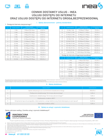 CENNIK DOSTAWCY USŁUG - INEA USŁUGI DOSTĘPU DO