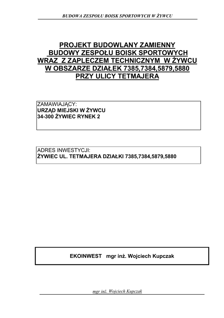 BUDOWA ZESPOŁU BOISK SPORTOWYCH W śYWCU PROJEKT BUDOWLANY ZAMIENNY BUDOWY ZESPOŁU BOISK SPORTOWYCH WRAZ Z ZAPLECZEM TECHNICZNYM W śYWCU W OBSZARZE DZIAŁEK 7385,7384,5879,5880 PRZY ULICY TETMAJERA ZAMAWIAJĄCY: URZĄD MIEJSKI W śYWCU 34-300 śYWIEC RYNEK 2 ADRES INWESTYCJI: śYWIEC UL. TETMAJERA DZIAŁKI 7385,7384,5879,5880 EKOINWEST mgr inŜ. Wojciech Kupczak mgr inŜ. Wojciech Kupczak BUDOWA ZESPOŁU BOISK SPORTOWYCH W śYWCU OŚWIADCZENIE ZGODNIE Z ART.20 UST.4 USTAWY PRAWO BUDOWLANE /DZ.U. NR 207Z 2003R. POZ. 2016 ZE ZMIANAMI/ OSWIADCZAM, śE DOKUMENTACJA JEST WYKONANA ZGODNIE Z UMOWĄ, OBOWIAZUJĄCYMI PRZEPISAMI ORAZ NORMAMI I ZOSTAJE WYDANA W STANIE KOMPLETNYM Z PUNKTU WIDZENIA CELU, KTÓREMU MA SŁUśYĆ. AUTOR PROJEKTU: LUTY 2010 mgr inŜ. Wojciech Kupczak Cisiec, ul.Sarnia 2 34-350 Węgierska Górka upr. budowlane 46/98 BB mgr inŜ. Wojciech Kupczak BUDOWA ZESPOŁU BOISK SPORTOWYCH W śYWCU ZAWARTOŚC OPRACOWANIA I. A. B. C. D. CZĘŚĆ OPISOWA PODSTAWA OPRACOWANIA OPIS TECHNICZNY INFORMACJA BIOZ PRZEDMIAR ROBÓT II.CZĘŚĆ RYSUNKOWA STANOWIĄCA UZUPEŁNIENIE DO POPRZEDNICH RYSUNKÓW • • • • • • • • • ZAPLECZE TECH. ,USYTUOWANIE KONTENERÓW SKALA 1:50 NR RYS. 1 KONT ZAPLECZE TECH. ,RZUT POZIOMY KONTENER PN SKALA 1:50 NR RYS. 2 KONT ZAPLECZE TECH. ,RZUT POZIOMY KONTENER PD SKALA 1:50 NR RYS. 3 KONT ZAPLECZE TECH. ,PRZEKROJE POPRZECZNE KONTENERU SKALA 1:50 NR RYS. 4 KONT BOISKO NAW. SZTUCZNA TRAWA, KOLORYSTYKA SKALA 1:500 NR RYS. 1K BOISKO NAW. SZTUCZNA TRAWA, KOLORYSTYKA SKALA 1:500 NR RYS. 2K PRZEKRÓJ TYPOWY A-A SKALA 1:20 NR RYS. 3Z PRZEKRÓJ TYPOWY B-B SKALA 1:20 NR RYS. 4Z PRZEKRÓJ TYPOWY WJAZDU SKALA 1:25 NR RYS. 12Z POZOSTAŁE RYSUNKI Z OPRACOWANIA BAZOWEGO: BEZ ZMIAN. mgr inŜ. Wojciech Kupczak BUDOWA ZESPOŁU BOISK SPORTOWYCH W śYWCU CZĘŚĆ OPISOWA A. PODSTAWA OPRACOWANIA 1. Umowa zawarta pomiędzy Gminą śywiec reprezentowaną przez Burmistrza Miasta , a Wojciechem Kupczakiem „EKOINWEST” nr 41/10/IM z dnia 01.02.2010r. 2. Zaktualizowany plan sytuacyjno wysokościowy w skali 1:500 3. Niezbędne wywiady i uzgodnienia branŜowe w sprawie uzbrojenia terenu. 4. Wizje lokalne w terenie oraz uzgodnienie z inwestorem. 5. Wytyczne programowo funkcjonalne projektowania szkolnych terenowych urządzeń kultury fizycznej wydane przez MOIW. 6. Literatura pomocnicza – Peter Neufert Podręcznik Projektowania Architektoniczno – Budowlanego B. OPIS TECHNICZNY 1. Inwestor: Inwestorem dla przedmiotowego zadania jest: URZĄD MIEJSKI W śYWCU 34-300 śYWIEC RYNEK 2 2. Cel i zakres opracowania: Celem niniejszego opracowania jest aktualizacja dokumentacji projektowo – kosztorysowej budowy budowy zespołu boisk sportowych w śywcu oraz aneks do pierwotnego projektu wprowadzający następujące zmiany: • • • • • • Zmiana rodzaju pierwotnie projektowanych nawierzchni boiska oraz warstw podbudowy. Wprowadzenie dodatkowych funkcji dla projektowanych boisk /tenis , badminton. Wprowadzenie zdefiniowania kolorystyki linii. Określenie zakresu remontu kontenerów dla zaplecza technicznego. Dobór wyposaŜenia pomocniczego dla obiektu Aktualizacja pozostałych elementów przedmiotowej dokumentacji projektowo – kosztorysowej : kosztorysy inwestorskie, przedmiary oraz specyfikacje techniczne. mgr inŜ. Wojciech Kupczak BUDOWA ZESPOŁU BOISK SPORTOWYCH W śYWCU 3. Przedmiot opracowania 3.1 Lokalizacja Projektowana inwestycja usytuowana jest w śywcu przy ulicy Tetmajera – obszar działek 7385,7384,5879,5880. 3.2 Istniejący stan zagospodarowania W chwili obecnej przedmiotowy teren jest nie zagospodarowany przylega do drogi miejskiej ul. Tetmajera oraz do obiektu hydrotechnicznego tzw. Młynówki. Teren jest nieutwardzony, nie ogrodzony i nie uzbrojony. 4. Stan projektowany 4.1 ZałoŜenia projektowe Budowa zespołu boisk sportowych tj. boisko do piłki noŜnej o wym. 30,mx60,0m, oraz boisko do piłki koszykowej i siatkowej o wym. 15,0mx28,0m, które wykorzystywane będzie równieŜ do gry tenisa oraz badmintona. Projekt przewiduje równieŜ lokalizację zaplecza technicznego kontenerowego, tj. posadowienie kontenerów będących w posiadaniu zamawiającego oraz remont tych kontenerów wraz z wykonaniem zadaszenia. Ponadto projektuje się wykonanie przyłączy /opracowania według projektów branŜowych/ 4.2 Projektowana geometria i usytuowanie obiektów Projektowaną sytuację i geometrię projektowanego obiektu sportowego przedstawia rysunek Pt „Projekt zagospodarowania terenu”. Niniejszy aneks do projektu nie wprowadza zmian w zakresie geometrii i usytuowania boisk. 4.3 Projektowana kolorystyka boisk Projektowaną kolorystykę boisk wraz z szerokościami linii przedstawiają rysunki nr 1K oraz 2K. Szerokość wszystkich linii boiska do piłki noŜnej 10cm, a ich kolor: biały. Szerokość linii boiska do piłki siatkowej i koszykowej 10cm - linie zewnętrzne, natomiast pozostałe 5cm. 4.4 Konstrukcja nawierzchni obiektów sportowych NAWIERZCHNIA „SZTUCZNA TRAWA” /Boisko do piłki noŜnej/ parametry główne konstrukcji nawierzchni: Grunt rodzimy dogęszczony do Is = 0,95. Warstwa piasku gruboziarnistego gr. 23cm, zagęszczana warstwowo do Is = 0,95. Geowłóknina drenarsko-separująca z włókien ciągłych, o wodoprzepuszczalności min. 95 mm/s. mgr inŜ. Wojciech Kupczak BUDOWA ZESPOŁU BOISK SPORTOWYCH W śYWCU Warstwa profilowa z kruszywa kamiennego łamanego stabilizowanego mechanicznie frakcja 4-30 mm, gr. 15cm. Miał kamienny frakcja 0,5-5mm, gr. 5cm Nawierzchnia z trawy syntetycznej wys. min. 6cm OPIS SZCZEGÓŁÓW NAWIERZCHNI: Wykładzina typu trawa syntetyczna przeznaczona jest do wykonywania nawierzchni sportowych na otwartej przestrzeni obiektów sportowych . Kolorystyka trawy: dwa kolory w kaŜdym pęczku trawy - jasnozielony oraz oliwkowy. Nawierzchnia posiadać winna Aprobatę Techniczną ITB, Atest Higieniczny PZH. Wykładzinę ułoŜoną i zamocowaną zgodnie z instrukcją producenta naleŜy zasypać suszonym i sortowanym pia