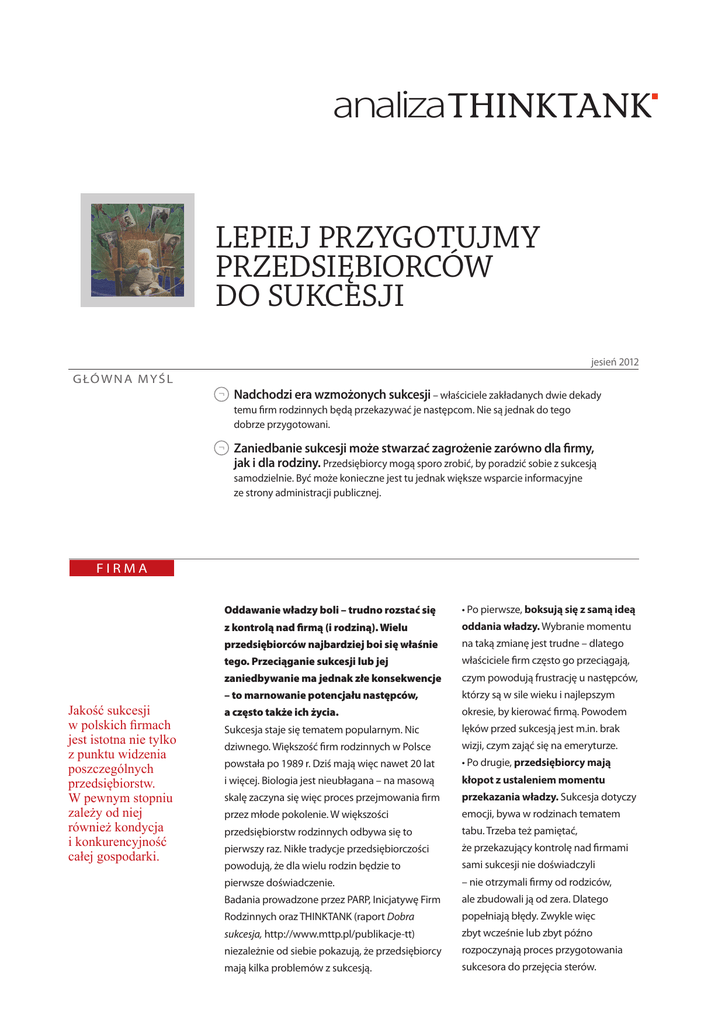analiza LEPIEJ PRZYGOTUJMY PRZEDSIĘBIORCÓW DO SUKCESJI jesień 2012 G ŁÓ W N A M Y Ś L ¬ Nadchodzi era wzmożonych sukcesji – właściciele zakładanych dwie dekady temu firm rodzinnych będą przekazywać je następcom. Nie są jednak do tego dobrze przygotowani. ¬ Z aniedbanie sukcesji może stwarzać zagrożenie zarówno dla firmy, jak i dla rodziny. Przedsiębiorcy mogą sporo zrobić, by poradzić sobie z sukcesją samodzielnie. Być może konieczne jest tu jednak większe wsparcie informacyjne ze strony administracji publicznej. FIRMA Jakość sukcesji w polskich firmach jest istotna nie tylko z punktu widzenia poszczególnych przedsiębiorstw. W pewnym stopniu zależy od niej również kondycja i konkurencyjność całej gospodarki. Oddawanie władzy boli – trudno rozstać się • Po pierwsze, boksują się z samą ideą z kontrolą nad firmą (i rodziną). Wielu oddania władzy. Wybranie momentu przedsiębiorców najbardziej boi się właśnie na taką zmianę jest trudne – dlatego tego. Przeciąganie sukcesji lub jej właściciele firm często go przeciągają, zaniedbywanie ma jednak złe konsekwencje czym powodują frustrację u następców, – to marnowanie potencjału następców, którzy są w sile wieku i najlepszym a często także ich życia. okresie, by kierować firmą. Powodem Sukcesja staje się tematem popularnym. Nic lęków przed sukcesją jest m.in. brak dziwnego. Większość firm rodzinnych w Polsce wizji, czym zająć się na emeryturze. powstała po 1989 r. Dziś mają więc nawet 20 lat • Po drugie, przedsiębiorcy mają i więcej. Biologia jest nieubłagana – na masową kłopot z ustaleniem momentu skalę zaczyna się więc proces przejmowania firm przekazania władzy. Sukcesja dotyczy przez młode pokolenie. W większości emocji, bywa w rodzinach tematem przedsiębiorstw rodzinnych odbywa się to tabu. Trzeba też pamiętać, pierwszy raz. Nikłe tradycje przedsiębiorczości że przekazujący kontrolę nad firmami powodują, że dla wielu rodzin będzie to sami sukcesji nie doświadczyli pierwsze doświadczenie. – nie otrzymali firmy od rodziców, Badania prowadzone przez PARP, Inicjatywę Firm ale zbudowali ją od zera. Dlatego Rodzinnych oraz THINKTANK (raport Dobra popełniają błędy. Zwykle więc sukcesja, http://www.mttp.pl/publikacje-tt) zbyt wcześnie lub zbyt późno niezależnie od siebie pokazują, że przedsiębiorcy rozpoczynają proces przygotowania mają kilka problemów z sukcesją. sukcesora do przejęcia sterów. • Po trzecie, właściciele firm często nie mają Jest ona ważna, by chronić interes pewności, kogo obsadzić na swoje miejsce. majątkowy rodziny w przyszłości Niejednokrotnie nie są też w stanie obiektywnie i jednocześnie zapewnić optymalne ocenić umiejętności zarządczych i społecznych warunki do rozwoju firmy. swoich dzieci (naturalnych następców), nawet 31% Tylko taki odsetek właścicieli firm rodzinnych myśli o uruchomieniu procesów sukcesyjnych. Źródło: „Badanie firm rodzinnych”, PARP, Warszawa (XII 2009) gdy te ewidentnie nie nadają się do kierowania Jest wiele modeli sukcesji i zależą one czymkolwiek. Niektórzy zaniedbują etap od typu i wielkości prowadzonego sprawdzania tych umiejętności np. poprzez biznesu, struktury zarządczej firmy praktykę w strukturach rodzimego biznesu, i relacji w rodzinie. Jest także wiele ale i poza nimi, najlepiej w innej firmie rodzinnej. dobrych praktyk, zarówno z rynku • Po czwarte, nie wiedzą, jak zbudować proces rodzimego, jak i podobnych do polskiego. oddawania władzy, zwłaszcza w firmach, Mogą być one źródłem idei i rozwiązań. gdzie następców jest wielu. Wątpliwości może W sukcesji najważniejsza jest oczywiście rozwiać np. spisanie planu sukcesji, a nawet wola właściciela. To od jego decyzji powołanie formalnego dokumentu konstytucji zależy, czy firma trafi w ręce rodziny, firmy rodzinnej. Taka konstytucja, stosowana zewnętrznego menedżera, czy zostanie już m.in. z powodzeniem w firmach takich jak sprzedana. Biorąc jednak pod uwagę Roleski i Łapaj, umożliwia skuteczną kontrolę znaczenie przedsiębiorstw rodzinnych nad przedsiębiorstwem rodzinnym poprzez dla gospodarki, trudno obronić tezę, wdrożenie funkcji rodzinnego nadzoru że jakość ich sukcesji jest tylko właścicielskiego (ang. family governance). wewnętrzną sprawą firm. • Po piąte, w procesie sukcesji przedsiębiorcy W interesie społecznym jest, zapominają o niepokoju pracowników. by planujący sukcesję dysponowali Zmiana jest bolesna nie tylko dla seniora i rodziny, dużą wiedzą na temat mechanizmów, wywołuje również obawę w zatrudnionych. Jeśli modeli i wyzwań procesu przedsiębiorstwa rodzinne nie zadbają o klarowną przekazywania władzy. Z tego punktu informację, mogą stracić cennych pracowników. widzenia być może potrzebne byłoby • Po szóste, przedsiębiorcy mają kłopoty szersze wsparcie informacyjne ze strony z prawno-podatkowym wymiarem sukcesji. administracji. Polskie firmy rodzinne będą Przekazanie przedsiębiorstwa to dobry moment przechodzić sukcesję po raz pierwszy, na zmiany struktury działania. W przypadku i to od razu w olbrzymiej skali. Jakość śmierci właściciela dziedziczenie ustawowe tej sukcesji jest z punktu widzenia i testamentowe nie gwarantuje sprawnej konkurencyjności polskiej gospodarki działalności firmy i naraża firmę na ryzyko nie mniej istotna niż stymulowanie nieodpowiedzialnego podziału pomiędzy innowacyjności czy rozwijanie kapitału spadkobierców. Przedsiębiorcy zbyt mało wiedzą ludzkiego w firmach. Warto zadbać, o możliwościach takich jak zapis windykacyjny, by przedsiębiorcy przeprowadzili ją ustanowienie rodzinnej fundacji lub trustu, najlepiej jak można. nie znają wszystkich rozwiązań podatkowych i prawnych z nimi związanych, a mających istotne znaczenie dla kondycji finansowej rodziny. • Po siódme, przedsiębiorcy zani