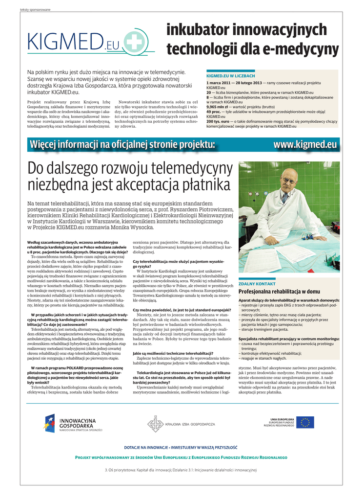 teksty sponsorowane inkubator innowacyjnych technologii dla e-medycyny Na polskim rynku jest dużo miejsca na innowacje w telemedycynie. Szansę we wsparciu nowej jakości w systemie opieki zdrowotnej dostrzegła Krajowa Izba Gospodarcza, która przygotowała nowatorski inkubator KIGMED.eu. Projekt realizowany przez Krajową Izbę Gospodarczą zakłada finansowe i merytoryczne wsparcie dla osób ze środowiska naukowego i akademickiego, którzy chcą komercjalizować innowacyjne rozwiązania związane z telemedycyną, telediagnostyką oraz technologiami medycznymi. Nowatorski inkubator stawia sobie za cel nie tylko wsparcie transferu technologii i wiedzy, ale również pobudzenie przedsiębiorczości oraz optymalizację istniejących rozwiązań technologicznych na potrzeby systemu ochrony zdrowia. KIGMED.EU W LICZBACH 1 marca 2011 — 28 lutego 2013 — ramy czasowe realizacji projektu KIGMED.eu 20 — liczba biznesplanów, które powstaną w ramach KIGMED.eu 8 — liczba firm i przedsiębiorstw, które powstaną i zostaną dokapitalizowane w ramach KIGMED.eu 9,965 mln zł — wartość projektu (brutto) 49 proc. — tyle udziałów w inkubowanym przedsiębiorstwie może objąć KIGMED.eu 200 tys. euro — o takie dofinansowanie mogą starać się pomysłodawcy chcący komercjalizować swoje projekty w ramach KIGMED.eu Więcej informacji na oficjalnej stronie projektu: www.kigmed.eu Do dalszego rozwoju telemedycyny niezbędna jest akceptacja płatnika Na temat telerehabilitacji, która ma szansę stać się europejskim standardem postępowania z pacjentami z niewydolnością serca, z prof. Ryszardem Piotrowiczem, kierownikiem Kliniki Rehabilitacji Kardiologicznej i Elektrokardiologii Nieinwazyjnej w Instytucie Kardiologii w Warszawie, kierownikiem komitetu technologicznego w Projekcie KIGMED.eu rozmawia Monika Wysocka. Według szacunkowych danych, wczesna ambulatoryjna rehabilitacja kardiologiczna jest w Polsce wdrażana zaledwie u 8 proc. pacjentów kardiologicznych. Dlaczego tak się dzieje? To czasochłonna metoda. Sporo czasu zajmują zazwyczaj dojazdy, które dla wielu osób są uciążliwe. Rehabilitacja to przecież dodatkowe zajęcie, które ciężko pogodzić z czasowym rozkładem aktywności rodzinnej i zawodowej. Często pojawiają się trudności finansowe związane z ograniczeniem możliwości zarobkowania, a także z koniecznością udziału własnego w kosztach rehabilitacji. Nierzadko samym pacjentom brakuje motywacji, co wynika z niedostatecznej wiedzy o konieczności rehabilitacji i korzyściach z niej płynących. Niestety, zdarza się też niedostateczne zaangażowanie lekarzy, którzy po prostu nie kierują pacjentów na rehabilitację. oceniona przez pacjentów. Dlatego jest alternatywą dla tradycyjnie realizowanej kompleksowej rehabilitacji kardiologicznej. Czy telerehabilitacja może służyć pacjentom wysokiego ryzyka? W Instytucie Kardiologii realizowany jest unikatowy w skali światowej program kompleksowej telerehabilitacji pacjentów z niewydolnością serca. Wyniki tej rehabilitacji opublikowano nie tylko w Polsce, ale również w prestiżowych czasopismach europejskich. Grupa robocza Europejskiego Towarzystwa Kardiologicznego uznała tę metodę za niezwykle obiecującą. Czy można powiedzieć, że jest to już standard europejski? W przypadku jakich schorzeń i w jakich sytuacjach tradycyjną rehabilitację kardiologiczną można zastąpić telerehabilitacją? Co daje jej zastosowanie? Telerehabilitacja jest metodą alternatywną, ale pod względem efektywności i bezpieczeństwa równoważną z tradycyjną ambulatoryjną rehabilitacją kardiologiczną. Osobiście jestem zwolennikiem rehabilitacji hybrydowej, która uwzględnia etap realizowany metodami tradycyjnymi (około jednej czwartej okresu rehabilitacji) oraz etap telerehabilitacji. Dzięki temu pacjenci nie rezygnują z rehabilitacji po pierwszym etapie. Niestety, nie jest to jeszcze metoda zalecana w standardach. Aby tak się stało, nasze doświadczenia muszą być potwierdzone w badaniach wieloośrodkowych. Przygotowaliśmy już projekt programu, ale jego realizacja zależy od decyzji instytucji finansujących takie badania w Polsce. Byłoby to pierwsze tego typu badanie na świecie. Jakie są możliwości techniczne telerehabiltacji? Zaplecze techniczno-logistyczne do wprowadzenia telerehabilitacji jest dostępne jedynie w kilku ośrodkach w kraju. W ramach programu POLKARD przeprowadzono ocenę pilotażowego, wzorcowego projektu telerehabilitacji kardiologicznej u pacjentów bez niewydolności serca. Jakie były wnioski? Telekardiologia jest stosowana w Polsce już od kilkunastu lat. Co stoi na przeszkodzie, aby ten sposób opieki był bardziej powszechny? Telerehabilitacja kardiologiczna okazała się metodą efektywną i bezpieczną, została także bardzo dobrze Upowszechnianie każdej metody musi uwzględniać merytoryczne uzasadnienie, możliwości techniczne i logi- ZDALNY KONTAKT Profesjonalna rehabilitacja w domu Aparat służący do telerehabilitacji w warunkach domowych: – rejestruje i przesyła zapis EKG z trzech odprowadzeń podsercowych; – mierzy ciśnienie, tętno oraz masę ciała pacjenta; – przesyła do specjalisty informację o przyjętych przez pacjenta lekach i jego samopoczuciu; – steruje treningiem pacjenta. Specjalista rehabilitant pracujący w centrum monitoringu: – czuwa nad bezpieczeństwem i poprawnością przebiegu treningu; – kontroluje efektywność rehabilitacji; – reaguje w stanach nagłych. styczne. Musi być akceptowane zarówno przez pacjentów, jak i przez środowisko medyczne. Powinno mieć uzasadnienie ekonomiczne oraz uregulowania prawne. A nade wszystko musi uzyskać akceptację przez płatnika. I to jest właśnie odpowiedź na pytanie: na przeszkodzie stoi brak akceptacji przez płatnika.