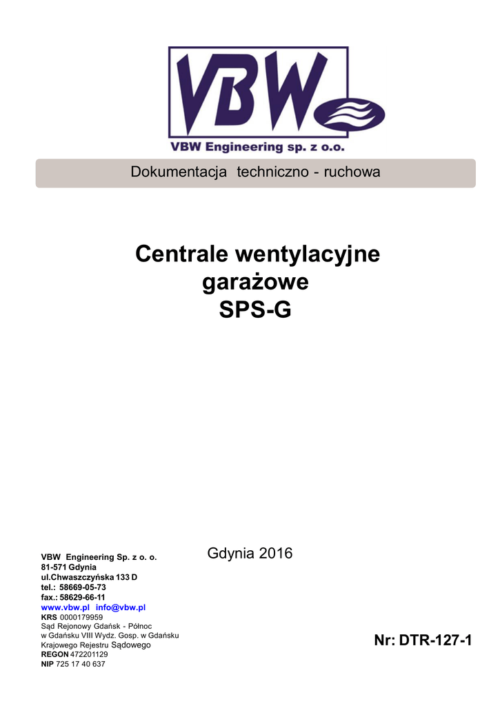 Dokumentacja techniczno - ruchowa Centrale wentylacyjne garażowe SPS-G VBW Engineering Sp. z o. o. 81-571 Gdynia ul.Chwaszczyńska 133 D tel.: 58669-05-73 fax.: 58629-66-11 www.vbw.pl [email protected] KRS 0000179959 Sąd Rejonowy Gdańsk - Północ w Gdańsku VIII Wydz. Gosp. w Gdańsku Krajowego Rejestru Sądowego REGON 472201129 NIP 725 17 40 637 Gdynia 2016 Nr: DTR-127-1 Dokumentacja techniczno - ruchowa VBW Engineering Sp. z o.o. 81-571 Gdynia ul. Chwaszczyńska 133 D Spis treści I. Wstęp........................................................................................................................................................................................3 Przeznaczenie .......................................................................................................................................................................3 II. Montaż ............................................................................................................................................................................3 Podłączenie kanałów wentylacyjnych..............................................................................................................................3 Sekcja wentylatorowa..........................................................................................................................................................3 Schematy połączeń............................................................................................................................................................3 Podłączenie przewodów elektrycznych..........................................................................................................................4 Zabezpieczenia elektryczne............................................................................................................................................5 Sprawdzenie oporności izolacji.....................................................................................................................................5 Sprawdzenie kierunku obrotów wentylatora..........................................................................................................................5 III. Uruchomienie....................................................................................................................................................................5 Przepustnice......................................................................................................................................................................5 Sekcja wentylatorowa......................................................................................................................................................5 Naciąg i wymiana pasków.............................................................................................................................................5 IV. Eksploatacja................................................................................................................................................................6 Wentylatory .........................................................................................................................................................................6 Inne..........................................................................................................................................................................................6 V. Instrukcja BHP związana z obsługą urządzeń...........................................................................................................6 VI. Transport i składowanie.................................................................................................................................................7 Poziom hałasu....................................................................................................................................................................7 VII. Serwis..................................................................................................................................................................................7 strona 2 Dokumentacja techniczna VBW Engineering VBW Engineering Sp. z o.o. 81-571 Gdynia ul. Chwaszczyńska 133 D Dokumentacja techniczno - ruchowa I. Wstęp Podłączenie kanałów wentylacyjnych. Dokumentacja Techniczno - Ruchowa zawiera informacje o montażu, uruchomieniu i eksploatacji central wentylacyjnych garażowych SPS-G produkcji VBW Engineering. Stosowanie się do zaleceń zawartych w niniejszej dokumentacji zapewni sprawne funkcjonowanie urządzeń. Uszkodzenia spowodowane niewłaściwą instalacją lub obsługą nie podlegają naprawom gwarancyjnym. Instalacja urządzeń niezgodnie z zaleceniami zawartymi w DTR może spowodować utratę gwarancji. Kanały wentylacyjne przyłączane są do urządzeń za pośrednictwem króćców elastycznych. Króćce zakończone są typowymi kołnierzami do połączeń kanałów wentylacyjnych. Kołnierze króćców i kanałów wentylacyjnych należy skręcić ze sobą śrubami w narożnikach. Przy większych przekrojach należy zastosować zapinki na profilach kołnierzy. Kanały podłączone do urządzeń muszą być podparte lub podwieszone na własnych elementach montażowych. Kanały wentylacyjne nie mogą być „zawieszone” na obudowie urządzenia. Połączenia elastyczne centrali wyposażone są w przewody uziemiające, łączące masę obudowy centrali z masą kanałów wentylacyjnych. Przeznaczenie Centrale garażowe przeznaczone są do wentylacji garaży i parkingów podziemnych. Służą do usuwania powietrza zanieczyszczonego tlenkiem węgla oraz wszelkiego rodzaju związkami siarki i ołowiu zawartymi w spalinach silników samochodowych. W yposażone są w dwa jednakowej wielkości wentylatory . W warunkach normalnych tzn. gdy stężenie spalin jest niewielkie, pracuje jeden wentylator. W momencie wzrostu st