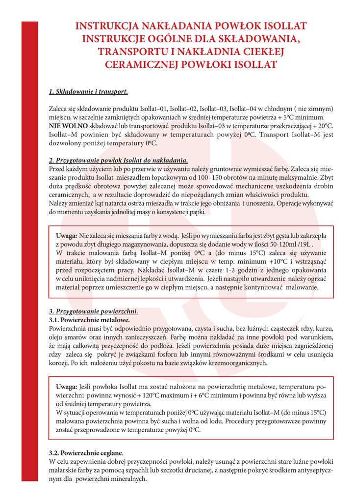 INSTRUKCJA NAKŁADANIA POWŁOK ISOLLAT INSTRUKCJE OGÓLNE DLA SKŁADOWANIA, TRANSPORTU I NAKŁADNIA CIEKŁEJ CERAMICZNEJ POWŁOKI ISOLLAT 1. Składowanie i transport. Zaleca się składowanie produktu Isollat–01, Isollat–02, Isollat–03, Isollat–04 w chłodnym ( nie zimnym) miejscu, w szczelnie zamkniętych opakowaniach w średniej temperaturze powietrza + 5°С minimum. NIE WOLNO składować lub transportować produktu Isollat–03 w temperaturze przekraczającej + 20°С. Isollat–M powinien być składowany w temperaturach powyżej 00C. Transport Isollat–M jest dozwolony poniżej temperatury 00C. 2. Przygotowanie powłok Isollat do nakładania. Przed każdym użyciem lub po przerwie w używaniu należy gruntownie wymieszać farbę. Zaleca się mieszanie produktu Isollat mieszadłem łopatkowym od 100–150 obrotów na minutę maksymalnie. Zbyt duża prędkość obrotowa powyżej zalecanej może spowodować mechaniczne uszkodzenia drobin ceramicznych, a w rezultacie doprowadzić do niepożądanych zmian właściwości produktu. Należy zmieniać kąt natarcia ostrza mieszadła w trakcie jego obniżania i unoszenia. Operacje wykonywać do momentu uzyskania jednolitej masy o konsystencji papki. Uwaga: Nie zaleca się mieszania farby z wodą. Jeśli po wymieszaniu farba jest zbyt gęsta lub zakrzepła z powodu zbyt długiego magazynowania, dopuszcza się dodanie wody w ilości 50-120ml /19L . W trakcie malowania farbą Isollat–M poniżej 00C a (do minus 15°С) zaleca się używanie materiału, który był składowany w ciepłym miejscu w temp. minimum +10°С i wstrząsnąć przed rozpoczęciem pracy. Nakładać Isollat–M w czasie 1-2 godzin z jednego opakowania w celu uniknięcia nadmiernej lepkości i utwardzenia. Jeżeli nastąpiło utwardzenie należy ogrzać materiał poprzez umieszczenie go w ciepłym miejscu, a następnie kontynuować malowanie. 3. Przygotowanie powierzchni. 3.1. Powierzchnie metalowe. Powierzchnia musi być odpowiednio przygotowana, czysta i sucha, bez luźnych cząsteczek rdzy, kurzu, oleju smarów oraz innych zanieczyszczeń. Farbę można nakładać na inne powłoki pod warunkiem, że mają całkowitą przyczepność do podłoża. Jeżeli powierzchnia posiada duże miejsca zagnieżdżonej rdzy zaleca się pokryć je związkami fosforu lub innymi równoważnymi środkami w celu usunięcia korozji. Po ich nałożeniu użyć pokostu na bazie związków krzemoorganicznych. Uwaga: Jeśli powłoka Isollat ma zostać nałożona na powierzchnię metalowe, temperatura powierzchni powinna wynosić + 120°С maximum i + 6°С minimum i powinna być równa lub wyższa od średniej temperatury powietrza. W sytuacji operowania w temperaturach poniżej 00C używając materiału Isollat–M (do minus 15°С) malowana powierzchnia powinna być sucha i wolna od lodu. Procedury przygotowawcze powinny zostać przeprowadzone w temperaturze powyżej 00C. 3.2. Powierzchnie ceglane. W celu zapewnienia dobrej przyczepności powłoki, należy usunąć z powierzchni stare luźne powłoki malarskie farby za pomocą szpachli lub szczotki drucianej, a następnie pokryć środkiem antyseptycznym dla powierzchni mineralnych. 3.3. Powierzchnie i tynki wapienne Celem uzyskania lepszych rezultatów, przed pomalowaniem świeżych tynków należy nanieść warstwę głęboko penetrującego podkładu (jest to konieczne dla delikatnych i kruszących się powierzchni tynków). Stare tynki, jeśli jest to niezbędne powinny zostać pokryte bezbarwnym podkładem akrylowym w celu wypełnienia porów, dziur i otworów. Gładka powierzchnia będzie wymagała mniejszej ilości Isollat, a dodatkowo kolor powłoki będzie jednolity. Czasami, w warunkach suchego i gorącego klimatu, przed nałożeniem powłoki na powierzchnie nie gruntowaną należy zmoczyć powierzchnię wodą: zapobiegnie to zbyt szybkiemu wyschnięciu powłoki Isollat. 3.4. Powierzchnie kredowe Przed nakładaniem powłoki Isollat na powierzchnię kredową, umyć ją roztworem amoniaku lub sody (1 litr 25% roztworu amoniaku na 10 litrów wody). Następnie pokryć powierzchnię akrylowym gruntem. Powierzchnia jest gotowa do nakładania Isollat. 3.5.Powierzchnie betonowe Oczyścić powierzchnie z piasku, kurzu i brudu za pomocą szczotki, pleśni (1:3 chlorku wapna w wodzie), oleju (siarczek miedzi). 3.6. Powierzchnie drewniane Drewno powinno być zagruntowane środkami zmniejszającymi palność. 4. Sposób nakładania powłoki Isollat. Istnieje kilka metod nakładania powłok Isollat: x Nakładanie pędzlem Przed pierwszym nałożeniem warstwy produktu należy namoczyć szczotkę/pędzel w wodzie i pozbyć się jej nadmiaru. W trakcie procesu nakładania namaczać szczotkę tylko gdy wyschnie. Zaleca się namoczenie szczotki dla wygodnego i łatwego nakładania farby co powoduje dodatkowe gładka powierzchnię i zapobiega zwijaniu się powłoki. x Nakładanie z użyciem pistoletu malarskiego (np. typ ST MAX Graco-495, ST MAX Graco-595, Ultra Max Graco-695, Ultra Max Graco-795, Graco Mark-V, Graco 1095) w zakresie ciśnień roboczych od 40 to 100 bar. Należy dobrać najmniejsze możliwe ciśnienie w celu zapobiegnięcia destrukcji mikrosfer materiału w trakcie natrysku. Po zakończeniu pracy narzędzia należy obficie umyć pod strumieniem wody lub pistoletem. Ilość warstw Isollat jest różna i zależna od obiektu waha się od 2-6. Grubość 1 warstwy wynosi od 0.3 to 0.5 mm. UWAGA : Grubość każdej z warstw i ich ilość jest zależna od wybranej metody nakładania, parametrów technicznych użytego sprzętu, stanu pokrywanej powierzchni i umiejętności personelu. Czas całkowitego wyschnięcia farb Isollat–01, Isollat–02, Isollat–03 i Isollat–04 w temperaturze +200C jest różna i zależy od wilgotności powietrza. x Wilgotność względna 50% lub niżej , całkowite wyschnięcie 6 godzin x Wilgotność względna powyżej 50%, całkowite wyschnięcie 12 godzin Przy średniej temperaturze powyżej +400C czas s