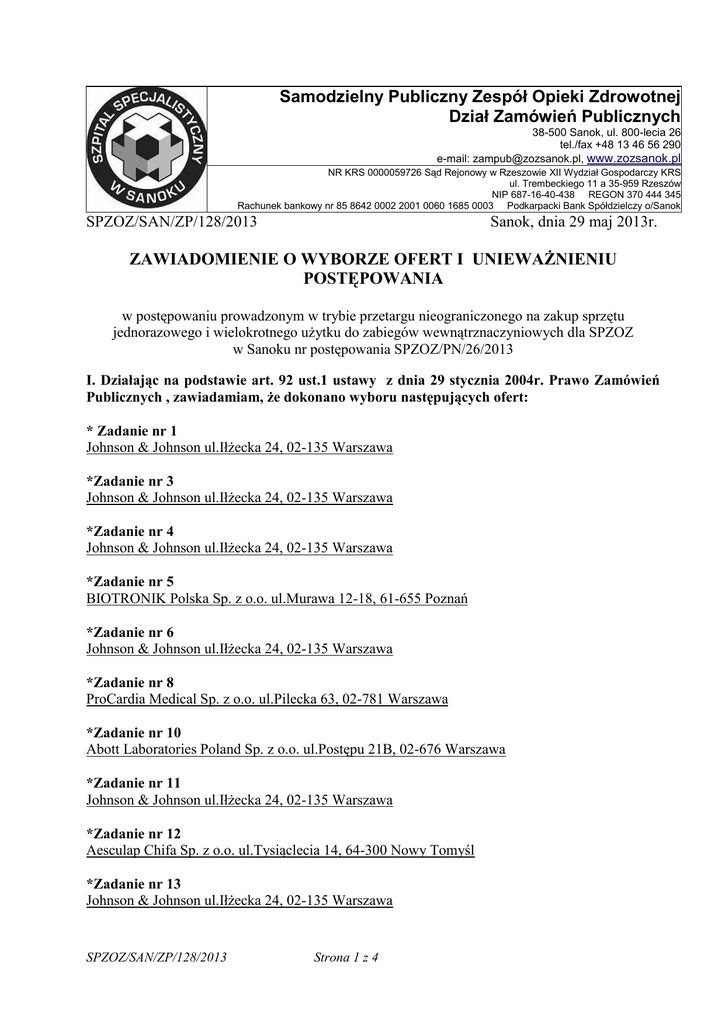 Samodzielny Publiczny Zespół Opieki Zdrowotnej Dział Zamówień
