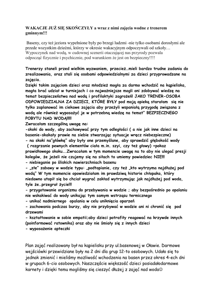 WAKACJE JUŻ SIĘ SKOŃCZYŁY a wraz z nimi zajęcia wodne z trenerem gminnym!!! Baseny, czy też jeziora wypełnione były po brzegi ludzmi -nie tylko osobami dorosłymi ale przede wszystkim dziećmi, którzy w okresie wakacyjnym odpoczywali od szkoły… Wypoczynek nad wodą, w cudownej scenerii otaczającej nas przyrody pozwala odpocząć fizycznie i psychicznie, pod warunkiem że jest on bezpieczny!!!! Trenerzy staneli przed wielkim wyzwaniem, przecieŜ…mieli bardzo trudne zadania do zrealizowania, oraz stali się osobami odpowiedzialnymi za dzieci przyprowadzane na zajęcia. Dzięki takim zajęciom dzieci oraz młodzieŜ mogła za darmo wchodzić na kąpieliska, mogła brać udział w turniejach i co najwaŜniejsze mogli oni zdobywać wiedzę na temat bezpieczeństwa nad wodą i profilaktyki zagroŜeń! JAKO TRENER-OSOBA ODPOWIEDZIALNA ZA DZIECI, KTÓRE BYŁY pod moją opieką starałam się nie tylko zaplanować im ciekawe zajęcia aby przeŜyli wspaniałą przygodę związana z wodą ale równieŜ wyposaŜyć je w potrzebną wiedzę na temat” BEZPIECZNEGO POBYTU NAD WODĄ!!!!! Zwracałam szczególną uwagę na: -skoki do wody, aby zachowywać przy tym odległości ( a nie jak inne dzieci na basenie-skakały prawie na siebie stwarzając sytuacje wręcz niebezpieczne) - na skoki na”główkę” aby były one przemyślane, aby sprawdzić głębokość wody ( rozgrzanie pewnych elementów ciała m.in. szyi, czy teŜ głowy) +pokaz prawidłowego skoku….Zwracałam w tym momencie uwagę na to aby nie ulegać presji kolegów, Ŝe jeŜeli nie czujemy się na siłach to umiemy powiedziec NIE!!! - niebieganie po śliskich nawierzchniach basenu - „złe” zabawy w wodzie typu: „podtapianie, czy teŜ „kto wytrzyma najdłuŜej pod wodą” W tym momencie opowiedziałam im prawdziwą historie chłopaka, który niedawno utopił się bo chciał wygrać zakład wytrzymując jak najdłuŜej pod woda, tyle Ŝe…przegrał Ŝycie!!! - przygotowanie organizmu do przebywania w wodzie ; aby bezpośrednio po opalaniu nie wskakiwać do wody unikając tym samym wstrząsu termicznego - unikać nadmiernego opalania w celu uniknięcia oparzeń - zachowania podczas burzy, aby nie przybywać w wodzie ani ni chronić się pod drzewami - kształtowanie w sobie empatii;aby dzieci potrafiły reagować na krzywde innych (poinformować ratownika) oraz aby nie śmiały się z innych dzieci - wyposaŜenie apteczki Plan zajęć realizowany był na kąpielisku przy ul.basenowej w Oławie. Darmowe wejściówki przewidziane były na 2 dni dla grup 12-to osobowych. Udało się to jednak zmienić i mieliśmy moŜliwość wchodzenia na basen przez okres 4-ech dni w grupach 6-cio osobowych. Naszczęście większość dzieci posiadałodarmowe karnety i dzięki temu mogliśmy się cieszyć dłuŜej z zajęć nad woda☺ Niestety często pogoda nie pozwalała na to aby przebywać nad wodą i zajęcia odbywały się na boisku. W miesiącu sierpień spędziliśmy nad woda 6dni i oprócz gier i zabaw w wodzie zorganizowany był mały turniej piłki noŜnej < na małe bramki> w którym wzięło udział 5 druzyn po 3 osoby na boisku.( grupy mieszane) *mimo strasznego upału turniej cieszył się duŜym zainteresowaniem innych basenowiczów a zwycięŜyli „piraci z Karaibow” ( na pewno w tym czasie ratownicy nie mieli duŜo pracy☺ ) Przykładowy plan zajęć będzie wyglądał następująco; -spotkanie przed basenem około godziny 11 -wspólne wejście i rozłoŜenie kocy ( niedaleko punktu ratowników) -podział na 2grupy * część dzieci w zaleŜności od umiejętności pływała w duŜym basenie a część w średnim - organizacja gier i zabaw pod okiem trenera -wspólne’piknikowanie”☺ ☺ +pogawędki na temat róŜnych przykrych sytuacjach nad wodą, kawały itp. Czas wolny dla dzieci w ‘basenie’ ( ‘oko’ trenera jednak czuwało ☺ ) TEMATYKA ZAJĘĆ: 1. Zabawy w wodzie - ‘najszybsza Ŝabka’ -‘dotykamy dna’ - szukanie skarbów - berek dookoła basenu ( po terenach suchych) - wyścigi na torach + małe sztafety pływackie - pokaz najlepszego ‘delfina’ ( najlepiej wykonany styl pływania delfinem) ‘holowanie’ partnera – zabawa która cieszyła się ogromnym powodzeniem i zainteresowaniem wśród dzieci Jest to rodzaj zabawy, która nie tylko ma w sobie wartości hedonistyczne (okazało się Ŝe pomoc drugiej osobie moŜe przynosić radość i uśmiech na twarzy) ale równieŜ uczy dzieci jak zapobiegać utonięciom oraz jak bezpiecznie ‘przetransportować’ taką osobę na brzeg….Kto wie, moŜe takie zabawy przyczynią się kiedyś do uratowania komuś Ŝycia!!!!!! 2.gry i zabawy na lądzie -babinkton - małe gry w piłkę noŜną - „ziemniak” - siatkówka plaŜowa - berki itp. Subiektywnie mogę stwierdzić iŜ ‘lato z trenerem gminnym’ okazał się dobrym pomysłem. Dzieci i młodzieŜ mieli szanse spędzić czas nad wodą troszkę w inny sposób. Mogli doświadczyć szerokiego wachlarzu zajęć i poczuć magie zabaw w wodzie. A obserwując inne dzieci na basenie powiem szczerze Ŝe ten obraz wakacyjnego, spokojnego spędzania czasu nad wodą jest głęboko ’zdemoralizowany’… Dlatego teŜ ‘nasze ‘ zajęcia nie tylko kształtują pozytywne emocje, które m.in. pozwalają przezwycięŜyć stany lękowe czy teŜ niwelizują agresje ale równieŜ pozytywnie wpływają na wykształcenie prozdrowotnych nawyków!!!!!!! * Oczywiście aby poznać w pełni świat podwodny, zaciekawić dziecko naleŜało by dostarczyć szereg innych ‘niespodzianek’☺ typu sprzęty do nurkowania trzeba by było zakupić, liczne przybory, które są wykorzystywane na basenach czy teŜ zorganizować wycieczki statkiem ………….. Ze sportowym pozdrowieniem Kamila Kościelak ( trener gminny z Oławy)
