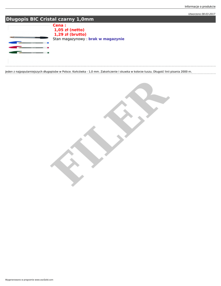 Informacje o produkcie Utworzono 08-03-2017 Długopis BIC Cristal czarny 1,0mm Cena : 1,05 zł (netto) 1,29 zł (brutto) Stan magazynowy : brak w magazynie FI LE R Jeden z najpopularniejszych długopisów w Polsce. Końcówka - 1,0 mm. Zakończenie i skuwka w kolorze tuszu. Długość linii pisania 2000 m. Wygenerowano w programie www.oscGold.com