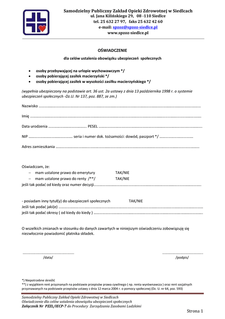 Samodzielny Publiczny Zakład Opieki Zdrowotnej w Siedlcach ul. Jana Kilińskiego 29, 08 -110 Siedlce tel. 25 632 27 97, faks 25 632 42 60 e-mail: [email protected] www.spzoz-siedlce.pl OŚWIADCZENIE dla celów ustalenia obowiązku ubezpieczeń społecznych osoby przebywającej na urlopie wychowawczym */ osoby pobierającej zasiłek macierzyński */ osoby pobierającej zasiłek w wysokości zasiłku macierzyńskiego */ (wypełnia ubezpieczony na podstawie art. 36 ust. 2a ustawy z dnia 13 października 1998 r. o systemie ubezpieczeń społecznych -Dz.U. Nr 137, poz. 887, ze zm.) Nazwisko ………………………………………………………………………………………….……………………………………….…….….……… Imię ……………………………………………………………………..……………….……………………………………..……….……..……….……. Data urodzenia …………………………………. PESEL ……………………….……………………………………………………..…..…………. NIP ………………………………………. seria i numer dok. tożsamości: dowód, paszport */ ……………….……………. Adres zamieszkania …………………………………………………………………..………………………………………………….…………… Oświadczam, że: mam ustalone prawo do emerytury TAK/NIE mam ustalone prawo do renty /**/ TAK/NIE jeśli tak podać od kiedy oraz numer decyzji……………………………………………………………………………..………………….. - posiadam inny tytuł(y) do ubezpieczeń społecznych TAK/NIE Jeśli tak podać jaki(e) ………………………………………………………………….………………………………………………………………… jeśli tak podać okresy ( od kiedy do kiedy ) ……………………………………………………………………………….………………….. O wszelkich zmianach w stosunku do danych zawartych w niniejszym oświadczeniu zobowiązuję się niezwłocznie powiadomić płatnika składek. ………………………………………………….. /data/ ……………………………………….. /podpis/ *) Niepotrzebne skreślić **) z wyjątkiem rent przyznanych na podstawie przepisów prawa cywilnego ( np. renta wyrównawcza ) oraz rent socjalnych przyznawanych na podstawie przepisów ustawy z dnia 12 marca 2004 r. o pomocy społecznej (Dz. U. nr 64, poz. 593) Samodzielny Publiczny Zakład Opieki Zdrowotnej w Siedlcach Oświadczenie dla celów ustalenia obowiązku ubezpieczeń społecznych Załącznik Nr PZZL/IECP-7 do Procedury Zarządzania Zasobami Ludzkimi Strona 1 POUCZENIE Ubezpieczenia emerytalne i rentowe Zgodnie z art.9 ust.6 ustawy z dnia 13 października 1998 r. o systemie ubezpieczeń społecznych (Dz.U. nr 137, poz. 887, z późn. zm.) osoby przebywające na urlopach wychowawczych lub pobierające zasiłek macierzyński albo zasiłek w wysokości zasiłku macierzyńskiego podlegają obowiązkowo ubezpieczeniom emerytalnemu i rentowym, jeżeli nie mają ustalonego prawa do emerytury lub renty i nie mają innych tytułów rodzących obowiązek ubezpieczeń społecznych. Przez inny tytuł nie należy rozumieć tytułu, z którego dana osoba nabywa prawo do zasiłku macierzyńskiego lub urlopu wychowawczego. W świetle powyższego: 1) osoba przebywająca na urlopie wychowawczym albo pobierająca zasiłek macierzyński lub zasiłek w wysokości zasiłku macierzyńskiego mająca ustalone prawo do emerytury lub renty nie podlega ubezpieczeniom emerytalnemu i rentowym. 2) osoba przebywająca na urlopie wychowawczym lub pobierająca zasiłek macierzyński albo zasiłek w wysokości zasiłku macierzyńskiego nie podlega ubezpieczeniom emerytalnemu i rentowemu, jeżeli: pozostaje w stosunku pracy (dotyczy przypadków, gdy osoba przebywająca na urlopie wychowawczym albo pobierająca zasiłek macierzyński podejmuje w tym okresie zatrudnienie w oparciu o umowę o pracę u własnego lub innego pracodawcy), wykonuje umowę o pracę nakładczą, jest członkiem rsp lub skr, wykonuje umowę agencyjną lub umowę zlecenia albo inną umowę o świadczenie usług, do której zgodnie z Kodeksem Cywilnym stosuje się przepisy dotyczące zlecenia, prowadzi pozarolniczą działalność, współpracuje przy wykonywaniu umowy agencyjnej lub zlecenia albo innej umowy o świadczenie usług, do której zgodnie z kodeksem cywilnym stosuje się przepisy dotyczące zlecenia, współpracuje przy prowadzeniu pozarolniczej działalności, pobiera uposażenie posła lub senatora, pobiera stypendium sportowe, pobiera stypendium dla słuchaczy Krajowej Szkoły Administracji Publicznej, wykonuje pracę na podstawie skierowania w czasie odbywania kary lub tymczasowego aresztowania, posiada status duchownego, pozostaje w stosunku służbowym funkcjonariusza Służby Celnej Oznacza to, że jeżeli w okresie przebywania na urlopie wychowawczym lub pobierania zasiłku macierzyńskiego albo zasiłku w wysokości zasiłku macierzyńskiego osoba będzie wykonywała pracę na podstawie np. umowy agencyjnej, wówczas będzie podlegała ubezpieczeniom społecznym z tytułu wykonywania tej umowy. W okresie wykonywania umowy nie będzie podlegała natomiast ubezpieczeniom z tytułu przebywania na urlopie wychowawczym lub pobierania zasiłku macierzyńskiego albo zasiłku w wysokości zasiłku macierzyńskiego. Osoba przebywająca na urlopie wychowawczym, która w trakcie trwania urlopu urodzi kolejne dziecko i nabywa tym samym prawo do zasiłku macierzyńskiego, podlega ubezpieczeniom emerytalnemu i rentowym z tytułu pobierania zasiłku macierzyńskiego. Samodzielny Publiczny Zakład Opieki Zdrowotnej w Siedlcach Oświadczenie dla celów ustalenia obowiązku ubezpieczeń społecznych Załącznik Nr PZZL/IECP-7