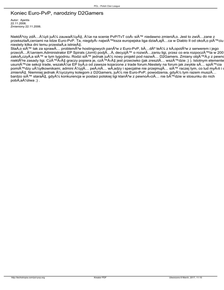 PCL - Polish Clan League Koniec Euro-PvP, narodziny D2Gamers Autor: Ajantis 22.11.2006. Zmieniony 22.11.2006. Niektórzy zdążyli już zauważyć, że na scenie PvP/TvT coś się niedawno zmieniło. Jest to związane z przekształceniami na lidze Euro-PvP. Ta, niegdyś największa europejska liga działająca w Diablo II od około pięciu niestety kilka dni temu przestała istnieć. Stało się tak za sprawą problemów hostingowych panów z Euro-PvP, bądź też z kłopotów z serwerem i jego przeciążeniem.Administrator EP Spirals (Jorrit) podjął decyzję o rozwiązaniu ligi, przez co era rozpoczęta w 2001 zakończyła się w tym tygodniu. Rodzi się jednak już nowy projekt pod nazwą D2Gamers. Zmiany objęły z pewno niektóre zasady ligi. Część graczy popiera je, część jest przeciwko (jak zresztą wszędzie ;) ). Istotnym elemente usunięcie sekcji trade, wszakże EP było od zawsze kojarzone z trade forum.Niestety na forum jak zwykle są spięcia pomiędzy użytkownikami, admini żyją pełnią władzy i specjalne nie przejmują się raczej tym, co lud myśli i c zmienić. Niemniej jednak życzymy kolegom z D2Gamers, już nie Euro-PvP, powodzenia, gdyż tym razem muszą bardzo się starać, gdyż konkurencja w postaci polskiej ligi klanów z pewnością nie będzie w stosunku do nich pobłażliwa ;) . http://techotropia.com/pcl-pvp.org Kreator PDF Utworzono 8 March, 2017, 11:10