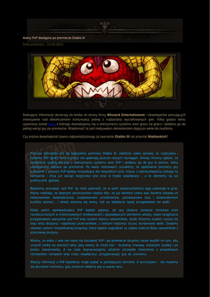 Areny PvP dostępne po premierze Diablo III Data publikacji : 10.03.2012 Szokujące informacje docierają do fanów ze strony firmy Blizzard Entertainment i deweloperów pracujących intensywnie nad dokończeniem kontynuacji jednej z najbardziej wyczekiwanych gier. Kilka godzin temu ujawniony został wpis, z którego dowiadujemy się o wstrzymaniu systemu aren gracz na gracz i dodaniu go do pełnej wersji gry po premierze. Wiadomość ta jest niebywałym doniesieniem dającym wiele do myślenia. Czy proces deweloperski teamu odpowiedzialnego za tworzenie Diablo III nie przerósł Niebieskich? Podczas odliczania dni do ogłoszenia premiery Diablo III, zdaliśmy sobie sprawę, że rozgrywka i systemy PvP (gracz kontra gracz) nie spełniają jeszcze naszych wymagań. Dzisiaj chcemy ogłosić, że podjęliśmy trudną decyzję o wstrzymaniu systemu aren PvP i dodaniu go do gry w patchu, który udostępnimy dopiero po premierze. Po wielu rozmowach uznaliśmy, że opóźnienie premiery gry wyłącznie z powodu PvP byłoby krzywdzące dla wszystkich tych, którzy z niecierpliwością czekają na kampanię i chcą już zacząć rozgrywkę solo oraz w trybie współpracy – a te elementy są już praktycznie gotowe. Będziemy pracować nad PvP, by mieć pewność, że w pełni wykorzystaliśmy jego potencjał w grze. Mamy nadzieję, że pewnym pocieszeniem będzie fakt, że już wkrótce czeka was świetna zabawa ze zdobywaniem doświadczenia, znajdowaniem przedmiotów, poznawaniem klas i doskonaleniem buildów postaci... i wtedy otworzą się areny, zaś wy będziecie lepiej przygotowani do walki. Kiedy patch wprowadzajacy PvP będzie gotowy, do gry dodane zostanie mnóstwo aren rozmieszczonych w zróżnicowanych środowiskach i posiadajacych odmienne układy, nowe osiągnięcia przygotowane specjalnie pod PvP oraz system doboru zawodników, dzięki któremu szybko ruszysz do boju wraz drużyną i napotkasz przeciwników, z którymi będziesz toczyć wyrównane walki. Dodamy również system indywidualnej progresji, który będzie nagradzać za udane rozbicie łbów zawodników z przeciwnej drużyny. Wiemy, że wielu z was nie może się doczekać PvP i po premierze skupimy nasze wysiłki na tym, aby uczynić walkę na arenach taką, jaką wiemy że może być – brutalną, krwawą, niezwykle szybką i po prostu niesamowitą. A na razie dopracowujemy ostatnie szczegóły stworzonej z prawdziwym rozmachem kampanii oraz trybu współpracy, przygotowując grę do premiery. Więcej informacji o PvP będziemy mogli podać w późniejszym terminie. A tymczasem – nie możemy się doczekać momentu, gdy wreszcie oddamy grę w wasze ręce. Autor: Dominik "BeLial" Misiak Data publikacji : 10.03.2012 Data modyfikacji : 10.03.2012 Liczba wyświetleń tekstu: 15459 Tagi: premiera, PvP, Areny PvP POWRÓT DRUKUJ PDF POLEĆ ZNAJOMEMU Komentarz (290) dodaj komentarz Stwierdzili, że będą się kontaktować w tej sprawie i nic więcej. Tak pisali na forum do Mephisto, który chyba jako pierwszy zgłosił bug. Oficjalnego stanowiska chyba nie było.~Vendeur 2012/03/12 11:52 ja już dzisiaj pograłem na tych nowych lokacjach, szczerze to żadnych rewelacji może jak by było to kontynuowanie wątku i poznawanie dalszej historii to może może ale tak hmm no może jakaś odskocznia od ciągłego zabijania SK. wystarczy się dołączyc do byle jakiej gry i te 3 WP są dostępne, przynajmniej ja tak miałem~PabloKonik 2012/03/12 12:00 No to kasacja postaci dzisiaj będzie na pewno~sebek138 2012/03/12 12:01 9 waypointów jest w sumie teraz, ciekawe czy to wszystko co będzie w akcie 1 jak tak to trochę tego terenu malutko mi się wydaje,wiadomo że podziemia będą itd ale liczyłem że po tylu latach będzie w co grać oby moje obawy okazały się niesłuszne no ale to tylko moje zdane.~starydiablo 2012/03/12 12:13 ~PabloKonik "szczerze to żadnych rewelacji" A powiedz mi czego oczekiwałeś hehe :)?~las3k 2012/03/12 12:14 ~PabloKonik - żadnych rewelacji? A czegoś się spodziewał co? W ten sposób to można całe Diablo określić. Żygam tym polskim malkontenctwem. Na zagranicznych forach ludzie szaleją ze szczęścia, ale u nas nie, lepiej pomarudzić... http://i.imgur.com/HDZXc.jpg - tutaj komuś udało się w jakąś losową lokację wejść :)~Vendeur 2012/03/12 12:15 Panowie o co chodzi z krowim levelem ? http://www.youtube.com/watch?v=vDzpOBu2x_8 http://www.youtube.com/watch?v=F7TYJlnvJqA&feature=related i jeszcze nowy gameplay znalazłem, ale pewnie było //żeby nie było jestem z serwisu SC2, nie śledze Diablo tak jak Wy tutaj :)~Fanek Battlenet Network 2012/03/12 12:22 ~Vendeur trafilem na evencik tam :P~starydiablo 2012/03/12 12:25 ~Fanek To będzie lincz za brak obycia :) A tak na poważnie, to gdzieś widziałem ten "krowi lvl" ale przyznam szczerze, że porzuciłem chęć posiadania jakichkolwiek informacji na ten temat, bo tutaj chyba o nic nie chodzi, ale mogę się mylić. Ten gameplay to kompilacji filmików z głównej strony d3, które blizz jakiś czas temu udostępnił.~las3k 2012/03/12 12:42 ok dzięki. Trochę czasu nie grałem już w bete, zacząłem teraz pobierać nowy patch i wyskakuje mi błąd po paru minutach, już 2 raz próbowałem po restarcie pc: http://i.imgur.com/1gNV2.jpg jest jakieś rozwiązanie czy na nowo bete zainstalować?~Fanek Battlenet Network 2012/03/12 12:53 Miałem to samo i pomogło dopiero zainstalowanie bety za pomocą najnowszego lunchera.~Zeniffar 2012/03/12 12:57 haha na gry-online.pl piszą że premiera 19 kwietnia 2012 ciekawe skąd mają takie info ;F~SaiyaN7 2012/03/12 13:00 Szanowni Gracze Po dlugiej i burzliwej dyskusji doszlismy do przekonanaia ze musimy usunac postac Diablo z gry Diablo III. W naszym przkonaniu musimy jeszcze nad nim popracowac. Ale obiecujemy pojawi sie w pozniejszej poprawce. Poniewaz postac Diablo jest waznym elememntem czwartego aktu gry ze smutkiem zawiadamaimy ze akt ten tez zostaje zablokowany do odwolania. Jednoczesnie