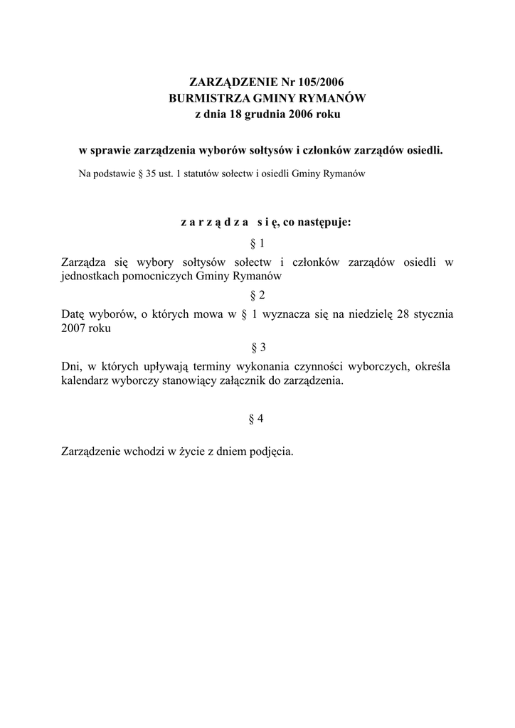 ZARZĄDZENIE Nr 105/2006 BURMISTRZA GMINY RYMANÓW z dnia 18 grudnia 2006 roku w sprawie zarządzenia wyborów sołtysów i członków zarządów osiedli. Na podstawie § 35 ust. 1 statutów sołectw i osiedli Gminy Rymanów z a r z ą d z a s i ę, co następuje: §1 Zarządza się wybory sołtysów sołectw i członków zarządów osiedli w jednostkach pomocniczych Gminy Rymanów §2 Datę wyborów, o których mowa w § 1 wyznacza się na niedzielę 28 stycznia 2007 roku §3 Dni, w których upływają terminy wykonania czynności wyborczych, określa kalendarz wyborczy stanowiący załącznik do zarządzenia. §4 Zarządzenie wchodzi w życie z dniem podjęcia. Załącznik nr 1 do Zarządzenia Nr 105/06 Burmistrza Gminy Rymanów z dnia 18 grudnia 2006 roku KALENDARZ WYBORCZY Termin wykonania czynności wyborczej do 20.12.2006 r. Treść czynności wyborczej Podanie do publicznej wiadomości w formie obwieszczenia informacji o zarządzeniu przez Burmistrza Gminy wyborów sołtysów i członków zarządów osiedli w Gminie Rymanów. (Data, siedziba OKW, szczegółowe zasady wyborcze, informacje o udostępnieniu do wglądu list wyborców. Powołanie Zespołu Koordynującego Wybory – Marek Penar, Władysław Cypcar, Danuta Zięba) do 20.12.12006 r. Określenie zarządzeniem Burmistrza wzorów druków wyborczych: do 15.01.2007 r. do godz. 1600 Zgłoszenia kandydata na sołtysa i członka zarządu osiedla Listy poparcia kandydata Oświadczenia kandydata o wyrażeniu zgody na kandydowanie na sołtysa lub członka zarządu osiedla Zgłoszenia kandydata do Obwodowej Komisji Wyborczej Karty do głosowania na sołtysa i członka zarządu osiedla Protokołu z przeprowadzonych wyborów Protokołu z przeprowadzonego losowania Zgłaszanie kandydatów na sołtysa, członków zarządu osiedla Zgłaszanie kandydatów do Obwodowych Komisji Wyborczych dla danego sołectwa lub osiedla do 18.01.2007 r. do godz. 1500 Przedłużenie terminu zgłaszania kandydatów na sołtysów, członków zarządów osiedli w przypadku nie zgłoszenia kandydata w terminie do 15.01.2007 r. do 19.01.2007 r. podanie do wiadomości wyborcom listy kandydatów na sołtysów/członków zarządów osiedli do 20.01.2007 r. powołanie Obwodowych Komisji Wyborczych i zwołanie ich pierwszych posiedzeń 27.01.2007 r. przekazanie przewodniczącym Obwodowych Komisji Wyborczych spisów wyborców, kart do głosowania i pieczęci OKW 28.01.2007 Głosowanie godz. 800 do 1600 29.01.2007 r. Opublikowanie obwieszczeń o wynikach wyborów na podstawie otrzymanych protokołów od Obwodowych Komisji Wyborczych do 27 lutego 2007 roku Przeprowadzenie wyborów rad sołeckich na zebraniach wiejskich zwołanych przez Burmistrza Gminy