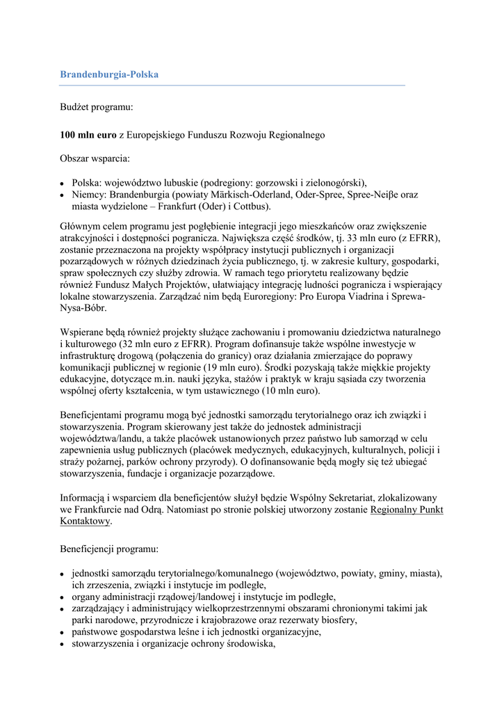 Brandenburgia-Polska Budżet programu: 100 mln euro z Europejskiego Funduszu Rozwoju Regionalnego Obszar wsparcia: Polska: województwo lubuskie (podregiony: gorzowski i zielonogórski), Niemcy: Brandenburgia (powiaty Märkisch-Oderland, Oder-Spree, Spree-Neiβe oraz miasta wydzielone – Frankfurt (Oder) i Cottbus). Głównym celem programu jest pogłębienie integracji jego mieszkańców oraz zwiększenie atrakcyjności i dostępności pogranicza. Największa część środków, tj. 33 mln euro (z EFRR), zostanie przeznaczona na projekty współpracy instytucji publicznych i organizacji pozarządowych w różnych dziedzinach życia publicznego, tj. w zakresie kultury, gospodarki, spraw społecznych czy służby zdrowia. W ramach tego priorytetu realizowany będzie również Fundusz Małych Projektów, ułatwiający integrację ludności pogranicza i wspierający lokalne stowarzyszenia. Zarządzać nim będą Euroregiony: Pro Europa Viadrina i SprewaNysa-Bóbr. Wspierane będą również projekty służące zachowaniu i promowaniu dziedzictwa naturalnego i kulturowego (32 mln euro z EFRR). Program dofinansuje także wspólne inwestycje w infrastrukturę drogową (połączenia do granicy) oraz działania zmierzające do poprawy komunikacji publicznej w regionie (19 mln euro). Środki pozyskają także miękkie projekty edukacyjne, dotyczące m.in. nauki języka, stażów i praktyk w kraju sąsiada czy tworzenia wspólnej oferty kształcenia, w tym ustawicznego (10 mln euro). Beneficjentami programu mogą być jednostki samorządu terytorialnego oraz ich związki i stowarzyszenia. Program skierowany jest także do jednostek administracji województwa/landu, a także placówek ustanowionych przez państwo lub samorząd w celu zapewnienia usług publicznych (placówek medycznych, edukacyjnych, kulturalnych, policji i straży pożarnej, parków ochrony przyrody). O dofinansowanie będą mogły się też ubiegać stowarzyszenia, fundacje i organizacje pozarządowe. Informacją i wsparciem dla beneficjentów służył będzie Wspólny Sekretariat, zlokalizowany we Frankfurcie nad Odrą. Natomiast po stronie polskiej utworzony zostanie Regionalny Punkt Kontaktowy. Beneficjencji programu: jednostki samorządu terytorialnego/komunalnego (województwo, powiaty, gminy, miasta), ich zrzeszenia, związki i instytucje im podległe, organy administracji rządowej/landowej i instytucje im podległe, zarządzający i administrujący wielkoprzestrzennymi obszarami chronionymi takimi jak parki narodowe, przyrodnicze i krajobrazowe oraz rezerwaty biosfery, państwowe gospodarstwa leśne i ich jednostki organizacyjne, stowarzyszenia i organizacje ochrony środowiska, podmioty publiczne powołane przez władze publiczne do realizacji zadań w zakresie infrastruktury drogowej i ich związki celowe, zrzeszenia transportowe/przewoźników, podmioty prowadzące placówki edukacyjne, kształcenia zawodowego i dokształcania oraz partnerzy społeczni i ich organizacje, pozaszkolne placówki edukacji ekologiczne, instytucje aktywizacji gospodarczej/placówki wspierające rozwój przedsiębiorczości i innowacyjność, np. izby, placówki naukowe, instytucje kultury, instytucje sportowe, organizacje i zrzeszenia turystyczne, podmioty lecznicze działające w publicznym systemie ochrony zdrowia i jednostki systemu ratownictwa medycznego, osoby prawne pożytku publicznego, np. fundacje, stowarzyszenia, organizacje pozarządowe, np. związki zawodowe, organizacje ochrony środowiska i zajmujące się sprawami społecznymi, euroregiony, europejskie ugrupowania współpracy terytorialnej.