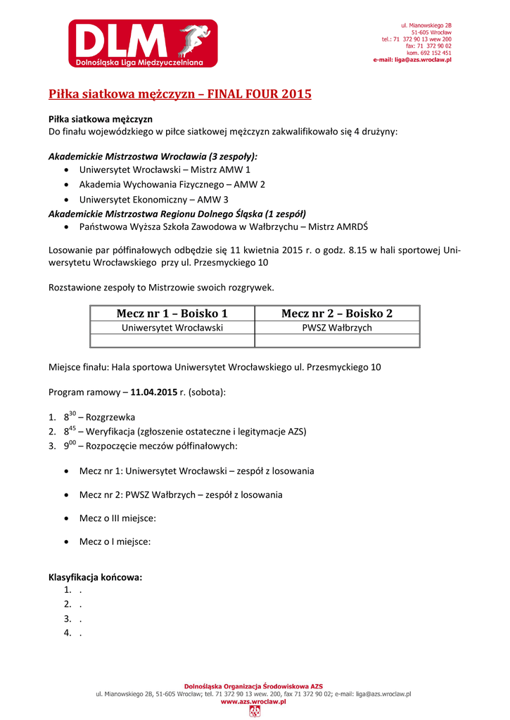 Piłka siatkowa mężczyzn – FINAL FOUR 2015 Piłka siatkowa mężczyzn Do finału wojewódzkiego w piłce siatkowej mężczyzn zakwalifikowało się 4 drużyny: Akademickie Mistrzostwa Wrocławia (3 zespoły): Uniwersytet Wrocławski – Mistrz AMW 1 Akademia Wychowania Fizycznego – AMW 2 Uniwersytet Ekonomiczny – AMW 3 Akademickie Mistrzostwa Regionu Dolnego Śląska (1 zespół) Państwowa Wyższa Szkoła Zawodowa w Wałbrzychu – Mistrz AMRDŚ Losowanie par półfinałowych odbędzie się 11 kwietnia 2015 r. o godz. 8.15 w hali sportowej Uniwersytetu Wrocławskiego przy ul. Przesmyckiego 10 Rozstawione zespoły to Mistrzowie swoich rozgrywek. Mecz nr 1 – Boisko 1 Mecz nr 2 – Boisko 2 Uniwersytet Wrocławski PWSZ Wałbrzych Miejsce finału: Hala sportowa Uniwersytet Wrocławskiego ul. Przesmyckiego 10 Program ramowy – 11.04.2015 r. (sobota): 1. 830 – Rozgrzewka 2. 845 – Weryfikacja (zgłoszenie ostateczne i legitymacje AZS) 3. 900 – Rozpoczęcie meczów półfinałowych: Mecz nr 1: Uniwersytet Wrocławski – zespół z losowania Mecz nr 2: PWSZ Wałbrzych – zespół z losowania Mecz o III miejsce: Mecz o I miejsce: Klasyfikacja końcowa: 1. . 2. . 3. . 4. .