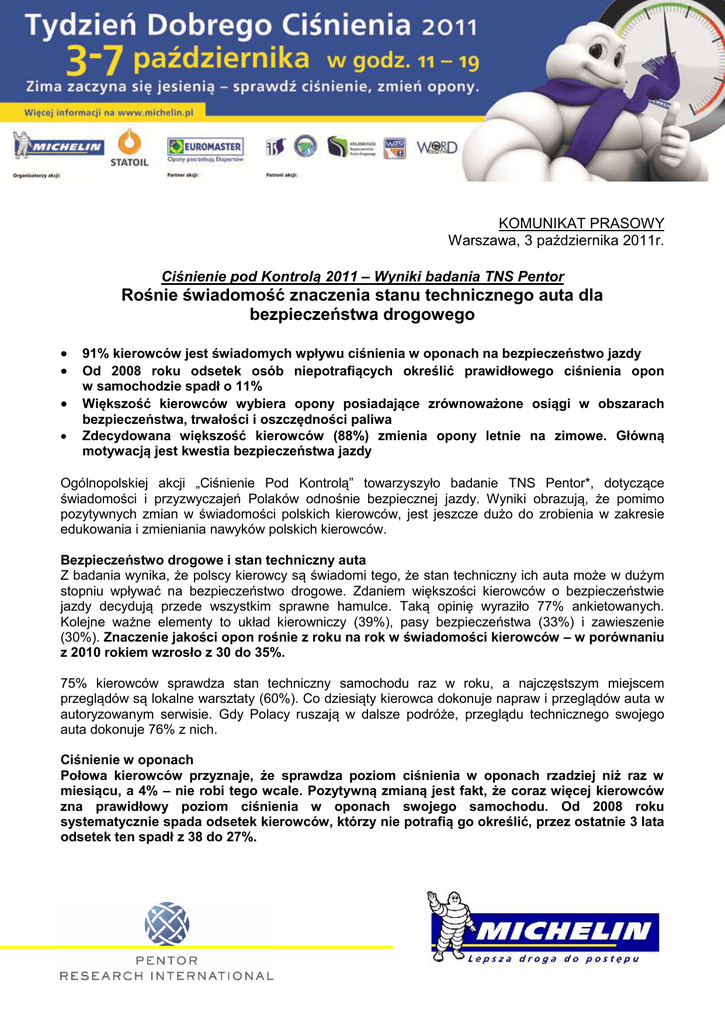 KOMUNIKAT PRASOWY Warszawa, 3 października 2011r. Ciśnienie pod Kontrolą 2011 – Wyniki badania TNS Pentor Rośnie świadomość znaczenia stanu technicznego auta dla bezpieczeństwa drogowego 91% kierowców jest świadomych wpływu ciśnienia w oponach na bezpieczeństwo jazdy Od 2008 roku odsetek osób niepotrafiących określić prawidłowego ciśnienia opon w samochodzie spadł o 11% Większość kierowców wybiera opony posiadające zrównoważone osiągi w obszarach bezpieczeństwa, trwałości i oszczędności paliwa Zdecydowana większość kierowców (88%) zmienia opony letnie na zimowe. Główną motywacją jest kwestia bezpieczeństwa jazdy Ogólnopolskiej akcji „Ciśnienie Pod Kontrolą” towarzyszyło badanie TNS Pentor*, dotyczące świadomości i przyzwyczajeń Polaków odnośnie bezpiecznej jazdy. Wyniki obrazują, że pomimo pozytywnych zmian w świadomości polskich kierowców, jest jeszcze dużo do zrobienia w zakresie edukowania i zmieniania nawyków polskich kierowców. Bezpieczeństwo drogowe i stan techniczny auta Z badania wynika, że polscy kierowcy są świadomi tego, że stan techniczny ich auta może w dużym stopniu wpływać na bezpieczeństwo drogowe. Zdaniem większości kierowców o bezpieczeństwie jazdy decydują przede wszystkim sprawne hamulce. Taką opinię wyraziło 77% ankietowanych. Kolejne ważne elementy to układ kierowniczy (39%), pasy bezpieczeństwa (33%) i zawieszenie (30%). Znaczenie jakości opon rośnie z roku na rok w świadomości kierowców – w porównaniu z 2010 rokiem wzrosło z 30 do 35%. 75% kierowców sprawdza stan techniczny samochodu raz w roku, a najczęstszym miejscem przeglądów są lokalne warsztaty (60%). Co dziesiąty kierowca dokonuje napraw i przeglądów auta w autoryzowanym serwisie. Gdy Polacy ruszają w dalsze podróże, przeglądu technicznego swojego auta dokonuje 76% z nich. Ciśnienie w oponach Połowa kierowców przyznaje, że sprawdza poziom ciśnienia w oponach rzadziej niż raz w miesiącu, a 4% – nie robi tego wcale. Pozytywną zmianą jest fakt, że coraz więcej kierowców zna prawidłowy poziom ciśnienia w oponach swojego samochodu. Od 2008 roku systematycznie spada odsetek kierowców, którzy nie potrafią go określić, przez ostatnie 3 lata odsetek ten spadł z 38 do 27%. Mimo, że aż 91% kierowców jest świadomych wpływu ciśnienia w oponach na bezpieczeństwo jazdy, tylko 15% respondentów wskazuje ciśnienie w oponach jako czynnik mający decydujący wpływ na bezpieczeństwo drogowe. Kierowcy zapytani o główne efekty jazdy na źle napompowanych oponach wskazują przede wszystkim szybsze zużycie opon (53%), większe zużycie paliwa (40%) i gorszą przyczepność (30%). Ekonomika jazdy – spalanie paliwa i zużycie opon Zdaniem kierowców, cztery najważniejsze czynniki wpływające na zużycie paliwa to: rodzaj trasy, pojemność silnika, dynamika jazdy i korki . W porównaniu z pomiarami z poprzednich lat, wyraźnie wzrosło postrzegane znaczenie pojemności silnika, stanu technicznego samochodu oraz stania w korkach, spadło zaś – dynamiki jazdy. 15% kierowców wskazuje ciśnienie w oponach jako istotne dla zużycia paliwa, 23% z nich docenia znaczenie ciśnienia w żywotności opony i w tym zakresie widoczny jest wzrost świadomości (wynik jest o 2% wyższy niż w 2010 roku). Sezonowa zmiana opon Zdecydowana większość kierowców stosuje zarówno opony letnie, jak i zimowe – aż 88% ankietowanych zmienia opony. W porównaniu z zeszłym rokiem dwukrotnie spadł odsetek kierowców jeżdżących cały rok na tych samych oponach (z 17 do 9%). Kierowcy są dobrze poinformowani jeśli chodzi o zalety stosowania opon dostosowanych do danej pory roku – zmieniają opony przede wszystkim dla poczucia bezpieczeństwa (71%), lepszej przyczepności (49%) i komfortu jazdy (29%). Ci, którzy decydują się na jazdę na tych samych oponach przez cały rok, postępują tak przede wszystkim ze względów finansowych (41%). Wybór opon Nowością w tegorocznym badaniu TNS Pentor było pytanie kierowców o to, co wpływa na decyzję przy zakupie danej opony. Najczęstszymi czynnikami jest cena (62%), marka opony (37%) oraz parametry techniczne (27%). Badanie TNS Pentor potwierdza zasadność misji Michelin, jaką jest tworzenie opon o zrównoważonych osiągach w trzech najważniejszych obszarach: bezpieczeństwa, trwałości opon i oszczędności paliwa. Przeważająca większość kierowców (60%) biorących udział w badaniu wskazała jako swoją preferencję zakupową oponę o zrównoważonych osiągach właśnie w tych trzech kategoriach. Badania instytutu TNS Pentor poprzedziły Tydzień Dobrego Ciśnienia, odbywający się między 3 a 7 października. Na 30 stacjach Statoil w całej Polsce, pracownicy Michelin i Statoil sprawdzają ciśnienie w oponach ponad 15 000 aut i udzielają porad dotyczących utrzymywania prawidłowego ciśnienia i wymiany opon na zimowe. Ponadto pracownicy sieci Euromaster mierzą głębokość bieżników opon, a wolontariusze PCK mierzą chętnym ciśnienie tętnicze. *) Badania zostały przeprowadzone w dniach 29 sierpnia – 5 września 2011 roku za pomocą techniki wywiadów bezpośrednich wspomaganych komputerowo. Celem badania były identyfikacja czynników wpływających zdaniem kierowców na bezpieczeństwo i ekonomikę jazdy, ustalenie jakie miejsce wśród tych czynników zajmuje kwestia ciśnienia w oponach oraz opis podstawowych zachowań kierowców związanych z pomiarem ciśnienia: kto, jak często, dlaczego i w jakich okolicznościach mierzy ciśnienie, czy robi to samodzielnie, czy korzysta z pomocy. Dodatkowych informacji udzielają: Ewa Konopka, rzecznik prasowy Michelin Polska, tel. 691 117 472, [email protected] Marcin Sęk, Hill and Knowlton Poland, tel. 609 160 053, [email protected] Michelin jest liderem technologicznym światowej branży opon. Grupa MICHELIN produkuje, sprzedaje i promuje produkty i usługi w dziedzinie mobilno
