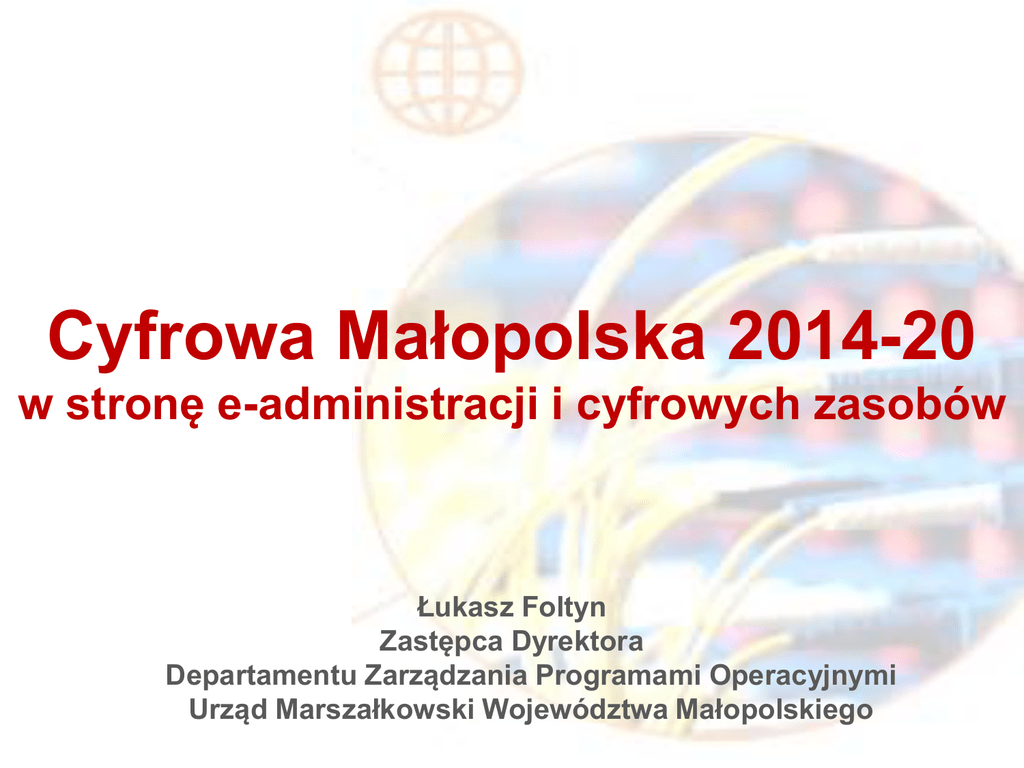 Cyfrowa Małopolska 2014-20 w stronę e-administracji i cyfrowych zasobów Łukasz Foltyn Zastępca Dyrektora Departamentu Zarządzania Programami Operacyjnymi Urząd Marszałkowski Województwa Małopolskiego Nowy program regionalny dla Małopolski 1. 2. 3. GOSPODARKA WIEDZY 250 MLN EUR CYFROWA MAŁOPOLSKA 140 MLN EUR PRZEDSIĘBIORCZA MAŁOPOLSKA 240 MLN EUR 5. OCHRONA ŚRODOWISKA 138 MLN EUR 6. DZIEDZICTWO REGIONALNE 7. INFRASTRUKTURA TRANSPORTOWA 169,1 MLN EUR 390,5 MLN EUR 9. REGION SPÓJNY SPOŁECZNIE 10. WIEDZA I KOMPETENCJE 232 MLN EUR 204,9 MLN EUR 11. REWITALIZACJA PRZESTRZENI REGIONALNEJ + 13. POMOC TECHNICZNA 170 MLN EUR 4. REGIONALNA POLITYKA ENERGETYCZNA 420 MLN EUR 8. RYNEK PRACY 270,8 MLN EUR 12. INFRASTRUKTURA SPOŁECZNA 151 MLN EUR Alokacja: 2,9 mld EUR • EFRR – 71,9% • EFS – 28,1% Struktura: • 12 osi priorytetowych i pomoc techniczna • 50% środków EFRR na innowacje, cyfryzację, MŚP i gospodarkę niskoemisyjną NASZA WIZJA – MAŁOPOLSKA 2.0 W najbliższych latach chcemy uprościć i przyspieszyć dostęp do usług publicznych w obszarach kluczowych dla mieszkańców, przedsiębiorców i osób odwiedzających nasz region. Celem będzie podwojenie odsetka osób, które w kontaktach z administracją korzystają z formy elektronicznej. Osiągniemy go dzięki zdecydowanemu zwiększeniu dostępności usług publicznych świadczonych on-line. WSKAŹNIKI REZULTATU Lp. 1. Wskaźnik Odsetek obywateli korzystających z e-administracji Jednostka pomiaru Wartość bazowa Rok bazowy Wartość docelowa (2023) % 29,5 2014 53,5 Jednostka pomiaru Fundusz Wartość docelowa (2023) szt. EFRR 49 szt. EFRR 37 szt. EFRR 81 PRODUKTU Lp. 1. 2. 3. Wskaźnik Liczba urzędów, które wdrożyły katalog rekomendacji dotyczących awansu cyfrowego Liczba podmiotów, które udostępniły on-line informacje sektora publicznego Liczba usług publicznych udostępnionych on-line o stopniu dojrzałości 3 – dwustronna interakcja oś 2_Cyfrowa Małopolska 1 BUDŻET Ogółem: 140 000 000 EUR 2 CEL Zwiększenie poziomu wykorzystania technologii informacyjnokomunikacyjnych w procesie udostępniania zasobów i realizacji zadań publicznych Działanie 2.1 E-ADMINISTRCJA I OTWARTE ZASOBY o Poddziałanie 2.1.1 ELEKTRONICZNA ADMINISTRACJA 3 DZIAŁANIE / PODDZIAŁANIA o Poddziałanie 2.1.2 CYFROWE ZASOBY REGIONALNE o Poddziałanie 2.1.3 E-USŁUGI W EDUKACJI o Poddziałanie 2.1.4 E-USŁUGI W INFORMACJI PRZESTRZENNEJ o Poddziałanie 2.1.5 E-USŁUGI W OCHRONIE ZDROWIA Działanie 2.1 E-ADMINISTRACJA I OTWARTE ZASOBY ELEKTRONICZNA ADMINISTRACJA: PODDZIAŁANIE 2.1.1 Typy projektów: A. e-usługi publiczne w administracji: usługi administracji dla biznesu (A2B) i obywateli (A2C) B. usługi wewnątrzadministracyjne (A2A) wspierające dla e-usług publicznych C. nowe rozwiązania IT w administracji, służące cyfryzacji procesów i procedur administracyjnych Tryb wyboru: konkursowy, pozakonkursowy Budżet: 33 750 000 EUR CYFROWE ZASOBY REGIONALNE: PODDZIAŁANIE 2.1.2 Typy projektów: A. cyfrowe udostępnianie informacji sektora publicznego ze źródeł administracyjnych B. cyfrowe udostępnianie regionalnych zasobów kultury i dziedzictwa regionalnego oraz zasobów wspierających rozwój turystyki Tryb wyboru: konkursowy, pozakonkursowy Budżet: 11 250 000 EUR Działanie 2.1 E-ADMINISTRACJA I OTWARTE ZASOBY E-USŁUGI W EDUKACJI PODDZIAŁANIE 2.1.3 Typ projektu: A. małopolska chmura edukacyjna: rozwój systemów teleinformatycznych wraz z doposażeniem w sprzęt informatyczny (komponent uzupełniający i niezbędny dla e-usług publicznych) Tryb wyboru: pozakonkursowy Budżet: 12 500 000 EUR E-USŁUGI W INFORMACJI PRZESTRZENNEJ PODDZIAŁANIE 2.1.4 Typ projektu: A. regionalny system cyfrowych rejestrów geodezyjnych Tryb wyboru: pozakonkursowy i konkursowy Budżet: 41 500 000 EUR E-USŁUGI W OCHRONIE ZDROWIA PODDZIAŁANIE 2.1.5 Typ projektu: A. regionalny system informacji medycznej Tryb wyboru: konkursowy Budżet: 41 000 000 EUR Harmonogram uruchamiania wsparcia 2.1.1 • Elektroniczna administracja IV kw. 2015 2.1.2 • Cyfrowe zasoby regionalne I kw. 2016 2.1.3 • E-usługi w edukacji 2.1.4 • E-usługi w informacji przestrzennej 2.1.5 • E-usługi w ochronie zdrowia projekt pozakonkursowy I kw. 2016 IV kw. 2016 Główne kryteria merytoryczne wyboru projektów Kryteria wspólne Zgodność projektu z wymogami w zakresie interoperacyjności oraz bezpieczeństwa danych Zgodność projektu ze zdiagnozowanymi potrzebami odbiorców i zorientowanie na użytkowników Zorientowanie projektu na realizację e-usług publicznych Udostępnienie e-usług o wysokim poziomie dojrzałości Zgodność projektu z polityką zintegrowanej informatyzacji państwa 2.1.1 Zasadność realizacji projektu w kontekście relacji z innymi przedsięwzięciami w obszarze elektronicznej administracji Projekt służy wdrożeniu standardów funkcjonowania cyfrowego urzędu Projekt wspiera rozwój ePUAP jako centralnej platformy dostępu do e-usług publicznych Projekt dostarcza rozwiązań horyzontalnych w zakresie elektronicznej administracji Projekt dotyczy e-usług publicznych w administracji: usługi administracji dla biznesu (A2B) i obywateli (A2C) e-usług publicznych lub nowych rozwiązań IT w administracji Wnioskodawca przeprowadził inwentaryzację zasobów objętych projektem Projekt dostarcza rozwiązań horyzontalnych w zakresie cyfrowych zasobów Znaczenie zasobów objętych projektem oraz potencjał do ponownego wykorzystania Zgodność projektu z polityką zintegrowanej informatyzacji państwa Projekt dotyczy e-usług publicznych w informacji przestrzennej Projekt służy wdrożeniu standardów funkcjonowania cyfrowego urzędu Projekt dostarcza rozwiązań horyzontalnych w zakresie elektronicznej administracji 2.1.2 2.1.4 PROJEKTY PILOTAŻOWE 2007-13: Wirtualne Muzea Małopolski Małopolska Chmura Edukacyjna Małopolski System Informacji Medycznej Wirtualne Muzea Małopolski – pilotaż WARTOŚĆ PROJEKTU 8,8 mln PLN