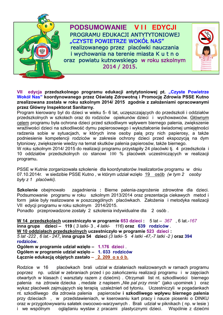 PODSUMOWANIE V I I EDYCJI PROGRAMU EDUKACJI ANTYTYTONIOWEJ „CZYSTE POWIETRZE WOKÓŁ NAS” realizowanego przez placówki nauczania i wychowania na terenie miasta K u t n o oraz powiatu kutnowskiego w roku szkolnym 2014 / 2015. VII edycja przedszkolnego programu edukacji antytytoniowej pt. „Czyste Powietrze Wokół Nas” koordynowanego przez Oświatę Zdrowotną i Promocję Zdrowia PSSE Kutno zrealizowana została w roku szkolnym 2014/ 2015 zgodnie z założeniami opracowanymi przez Główny Inspektorat Sanitarny. Program kierowany był do dzieci w wieku 5- 6 lat, uczęszczających do przedszkoli i oddziałów przedszkolnych w szkołach oraz do rodziców opiekunów dzieci i wychowawców. Głównym celem programu była ochrona dzieci przed szkodliwym wpływem biernego palenia, zwiększenie wrażliwości dzieci na szkodliwość dymu papierosowego i wykształcenie świadomej umiejętności radzenia sobie w sytuacjach, w których inne osoby palą przy nich papierosy, a także podniesienie kompetencji rodziców w zakresie ochrony dzieci przed ekspozycją na dym tytoniowy, zwiększenie wiedzy na temat skutków palenia papierosów, także biernego. W roku szkolnym 2014/ 2015 do realizacji programu przystąpiły 24 placówki tj. 4 przedszkola i 10 oddziałów przedszkolnych co stanowi 100 % placówek uczestniczących w realizacji programu. PSSE w Kutnie zorganizowała szkolenie dla koordynatorów /realizatorów programu w dniu 07.10.2014r. w siedzibie PSSE Kutno , w którym udział wzięło 19 osób (w tym 2 osoby były z 1 placówki). Szkolenie obejmowało zagadnienia : Bierne palenia-zagrożenie zdrowotne dla dzieci. Podsumowanie programu w roku szkolnym 2013/2014 oraz prezentacja ciekawych metod i form jakie były realizowane w poszczególnych placówkach. Założenia i metodyka realizacji VII edycji programu w roku szkolnym 2014/2015. Ponadto przeprowadzone zostały 2 szkolenia indywidualne dla 2 osób . W 14 przedszkolach uczestniczyło w programie 653 dzieci : 5 lat – 367 , 6 lat.-167 inna grupa dzieci – 119 ( 3 latki- 3 , 4 latki- 116) oraz 639 rodziców . W 10 oddziałach przedszkolnych uczestniczyło w programie 523 dzieci : 5 lat -222 , 6 lat.- 247, inna grupa 54 dzieci (3 latki- 5 4 latki -47,-7 latki -2 ) oraz 394 rodziców. Ogółem w programie udział wzięło – 1.176 dzieci . Ogółem w programie udział wzięło – 1. 033 rodziców Łącznie edukacją objętych zastało – 2. 209 o s ó b. Rodzice w 16 placówkach brali udział w działaniach realizowanych w ramach programu poprzez np. udział w zebraniach przed i po zakończeniu realizacji programu i w zajęciach otwartych w klasach ( warsztaty razem z dziećmi) . Otrzymali list nt. szkodliwości biernego palenia na zdrowie dziecka , medale z napisem „Nie pal przy mnie” (jako upominek ) oraz wykaz placówek zajmujących się terapią uzależnień od tytoniu. Uczestniczyli w pogadankach nt. szkodliwego dla zdrowia palenia papierosów i szkodliwego wpływu biernego palenia przy dzieciach , w przedstawieniach, w kserowaniu kart pracy i nauce piosenki o DINKU oraz w przygotowywaniu sałatek owocowo-warzywnych . Brali udział w piknikach ( np. w lesie ) i we wspólnym oglądaniu wystaw z pracami plastycznymi dzieci. Wspólnie z dziećmi malowali plakaty antytytoniowe , razem z dziećmi maszerowali ulicami miast z plakatami o tematyce antytytoniowej. Pomagali w przygotowywaniu dla dzieci strojów , interesowali się kącikami informacyjnymi antytytoniowymi,które były sporządzone w placówkach oraz uczestniczyli w prezentacji multimedialnej nt. szkodliwości palenia papierosów zarówno dla palacza czynnego jak i biernego. Realizacja programu przebiegała w 24 placówkach poprzez zrealizowanie 5 zajęć warsztatowych. W 15 placówkach program był rozszerzony o dodatkowe 32 działania dla 857 odbiorców. W ramach realizacji programu powiatowy koordynator przeprowadziła 1 pogadankę oraz przekazano 18 informacji ( wraz ze zdjęciami) do lokalnych mass- mediów. Zamieszczono/ opublikowano : na stronach internetowych – 22 artykuły KCI- 10 art., eKutno -1 art. , Kutno.com- 10 art. , EKU24- 1art, zaś w prasie (PŻK)- 3, które czytało ok. 2.510 osób. Podsumowanie programu i wnioski : Wg opinii szkolnych i przedszkolnych koordynatorów program „Czyste powietrze wokół nas” : - Cieszył się ogromnym zainteresowaniem wśród dzieci, które chętnie uczestniczyły w zajęciach, łatwo i szybko przyswajały informacje nt. problemu dymu tytoniowego oraz jak unikać przebywania w pomieszczeniach zadymionych - Spełniał ważną rolę w wychowaniu zdrowotnym dzieci, gdyż przekazywał wiedzę , ukazywał sposoby radzenia sobie z problemem oraz kształtował u dzieci postawy ochrony własnego zdrowia - Dostosowany był do możliwości poznawczych dzieci - Pobudzał ciekawość dzieci i wzbogacał ich wiedzę nt szkodliwości dymu tytoniowego i wskazywał sposoby radzenia sobie z dymem. - Program ciekawy, dostosowany do wieku i możliwości intelektualnych dzieci. - Scenariusze zajęć były zróżnicowane , poprzez różnego rodzaju metody i formy ,dzieci aktywnie uczestniczyły w zajęciach. - Dzieci wykonywały wszystkie ćwiczenia i zadania, chętnie uczestniczyły w zabawach. - Dzieci poznały źródła zanieczyszczenia powietrza, wpływ zanieczyszczeń na zdrowie ludzi i na środowisko przyrodnicze. Efektem realizacji programu jest : wykształcenie u dzieci świadomej postawy ochrony własnego zdrowia w sytuacjach , gdy są skazane na bezpośredni kontakt z osobami palącymi papierosy,- uwrażliwienie dzieci na szkodliwość dymu papierosowego i uświadomienie skutków palenia papierosów, uwrażliwienie dzieci na miejsca, w których mogą być narażone na dym papierosowy, nabycie przez dzieci umiejętności radzenia sobie w sytuacjach gdy inni przy nich palą papierosy. Dzięki zaangażowaniu do realizacji programu rodziców , zmienili oni swoje postawy co ma odzwierciedlenie w zachowaniach w środowisku domow
