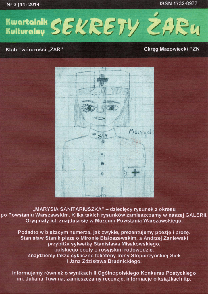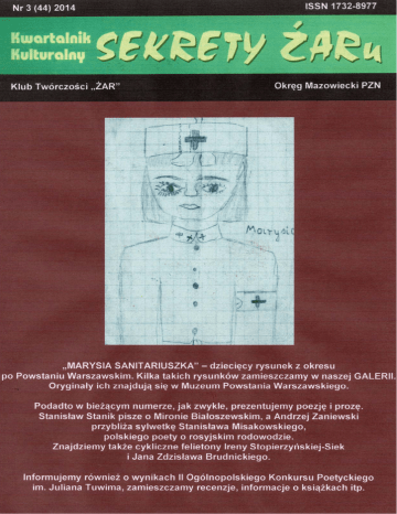 Kwartalnik Kulturalny SEKRETY ŻARu Nr 3 (44) 2014 Strona I okładki 1 Kwartalnik Kulturalny SEKRETY ŻARu Nr 3 (44) 2014 OD REDAKCJI Drodzy Czytelnicy! Żyjemy na wąskiej mieliźnie, na ruchomej ławicy czasu, Zwykliśmy ją nazywać rzeczywistością, która jest. (Roman Brandstetter) Mam nadzieję, że mimo długiej przerwy między nowym, a poprzednim numerem „Sekretów ŻARu”, spełni on Wasze oczekiwania i odnajdziecie w nim, Szanowni Państwo, coś interesującego dla siebie. O utworach poetyckich aż dziesięciu autorów nie będę pisać szczegółowo, wszystkie bowiem wiersze należy przeczytać i odszukać w nich najgłębsze myśli i odczucia. Na Gościnnych Łamach”, jak zwykle, prezentujemy nowego dla naszego kwartalnika poetę – Krzysztofa Galasa. Z utworów prozatorskich polecamy trzy opowiadania młodej autorki, Agnieszki Olszuk z Lodzi. W pozostałej, bogatej części numeru, odnajdziecie dobrze już znane, stałe rubryki omawiające różnorodne wydarzenia kulturalne, a także recenzje, wspomnienia, felietony. Nieco szczegółowiej przedstawię tylko niektóre pozycje tej części numeru, gdyż „Słowo od Redakcji” z zasady powinno być krótkie, Jan Zdzisław Brudnicki pisze o Konkursie Poetyckim im. Juliana Tuwima, którego druga edycja zainteresowała znaczną grupę poetów z całego kraju. Inowłódz, niewielka miejscowość, ale pięknie położona nad Pilicą, i tęsknie wspominana przez autora „Kwiatów Polskich”, inicjuje różne wydarzenia kulturalne. Nie byłoby tego konkursu, gdyby wśród organizatorów zabrakło Iwony Zielińskiej-Zamory. Znana jest tam jako poetka i redaktor naczelna naszego kwartalnika. Listę nagrodzonych, wyróżnionych i zauważonych uczestników konkursu, umieściliśmy tuż po omówieniu tego wydarzenia. Z okazji siedemdziesiątej rocznicy Powstania Warszawskiego został opublikowany wiersz Krystyny Łagowskiej „Requiem poecie: pamięci Krzysztofa Kamila Baczyńskiego” i „Popowstańcze refleksje” Andrzeja Rodysa. Jego też rysunki z roku 1944, kiedy jako kilkuletni chłopiec ilustrował trudne zdarzenia czasu wojny, wypełniają szpalty naszej Galerii. Dwa inne teksty wspomnieniowe dotyczą ludzi pióra: Stanisław Stanik napisał o Mironie Białoszewskim, a Andrzej Zaniewski o mniej znanym Stanisławie Misakowskim. Z innych opublikowanych materiałów, żaden nie zasługuje na pominięcie. I te proszę również uwzględnić w swojej lekturze. Irena Stopierzyńska-Siek Zastępca Redaktor Naczelnej 2 Kwartalnik Kulturalny SEKRETY ŻARu Nr 3 (44) 2014 Kwartalnik Kulturalny „SEKRETY ŻARu” Nr 3 (44) 2014 W numerze: Od Redakcji…………………………………………………………………………2 PREZENTACJE LITERACKIE – POEZJA Elżbieta Dąbrówka-Madej, Zbigniew Gajewski, Krystyna Łagowska, Aleksandra Ochmańska, Andrzej Rodys, Stanisław Stanik, Irena Stopierzyńska, Andrzej Zaniewski, Iwona Zielińska-Zamora, Wiesława Żelazik……………………………………………………..…………….4 GOŚCINNE ŁAMY: Krzysztof Galas……………………………………..….…10 PREZENTACJE LITERACKIE – PROZA Agnieszka Olszuk – Trzy opowiadania Jadzia ………………………………………………………………………………11 Ulica Kwiatowa…………………………………………………………………….12 Herbata……………………………………………………………………………..13 PUBLICYSTYKA KULTURALNA Stanisław Stanik – Miron Białoszewski (1922-1983)…………………….………14 Andrzej Zaniewski – Tajemnice Stanisława Mosakowskiego (1917-1996)….....16 POD POWIERZCHNIĄ ZDARZEŃ Irena Stopierzyńska – Postrzeganie w ciemnościach….………………………...18 MOJE PODRÓŻE LITERACKIE Jan Zdzisław Brudnicki – Konkurs Tuwimowski w Inowłodzu…………….….19 II OGÓLNOPOLSKI KONKURS POETYCKI IM. JULIANA TUWIMA Wyniki Konkursu………………………………………………………………….21 RECENZJE Jan Zdzisław Brudnicki – Czwarta pora roku Tadeusza Zawadowskiego……22 Grażyna Kowalska – Spotkania Stanisława Stanika……………………….........23 KSIĄŻKI NADESŁANE………………………………………………………….24 W LXX ROCZNICĘ POWSTANIA WARSZAWSKIEGO Andrzej Rodys – Popowstaniowe refleksje………………………………………25 GALERIA Dziecięce rysunki z roku 1944………………..…………………………………...30 Drodzy Czytelnicy „Sekretów ŻARu”! Jeżeli chcecie, by nasz kwartalnik ukazywał się regularnie, by stale podnosił swój poziom, by był bardziej dostępny, to pamiętajcie, że jest to w dużej mierze uzależnione od środków finansowych. Będziemy wdzięczni za każdą wpłatę darowizny na konto: PZN Okręg Mazowiecki – Bank Millennium 35 1160 2202 0000 0000 8292 5183 koniecznie z dopiskiem: „Darowizna na Kwartalnik Sekrety ŻARu” 3 Kwartalnik Kulturalny SEKRETY ŻARu Nr 3 (44) 2014 PREZENTACJE LITERACKIE – POEZJA---A sięgam coraz częściej, By znów poczuć zapach Minionych czasów, Pięknych, ciepłych słów, Myśli i serca… Trudne i piękne były to lata I chwile… Przetrwały w tych listach Mimo burz i trudów I żyją… Elżbieta Dąbrówka-Madej MYŚLI BEZSENNEJ NOCY Jest noc za oknem, Ciemność z wielką mocą Przez szyby się wdziera daremnie, W pokoju maleńkie światełka migocą, Nadziei iskra tkwi we mnie. Dziś tamte słowa perełkami liter Zabłysły w trudnych pokolenia zmianach, W zmęczone ręce je chwytam, Przeszłość przytulam – Jestem sama… Liczę cykanie mej matki zegara, A kiedy nadejdzie już pora, Aby zaśpiewać minioną godzinę, Jak dzwon się odezwie, Choć jest bardzo stary, Bo jego czas także mija. * * Zbigniew Gajewski POSZUKIWANIE PEŁNI SZCZĘŚCIA Duch ludzki, choć miotany przez burze wśród znoju Wciąż szuka pełni szczęści