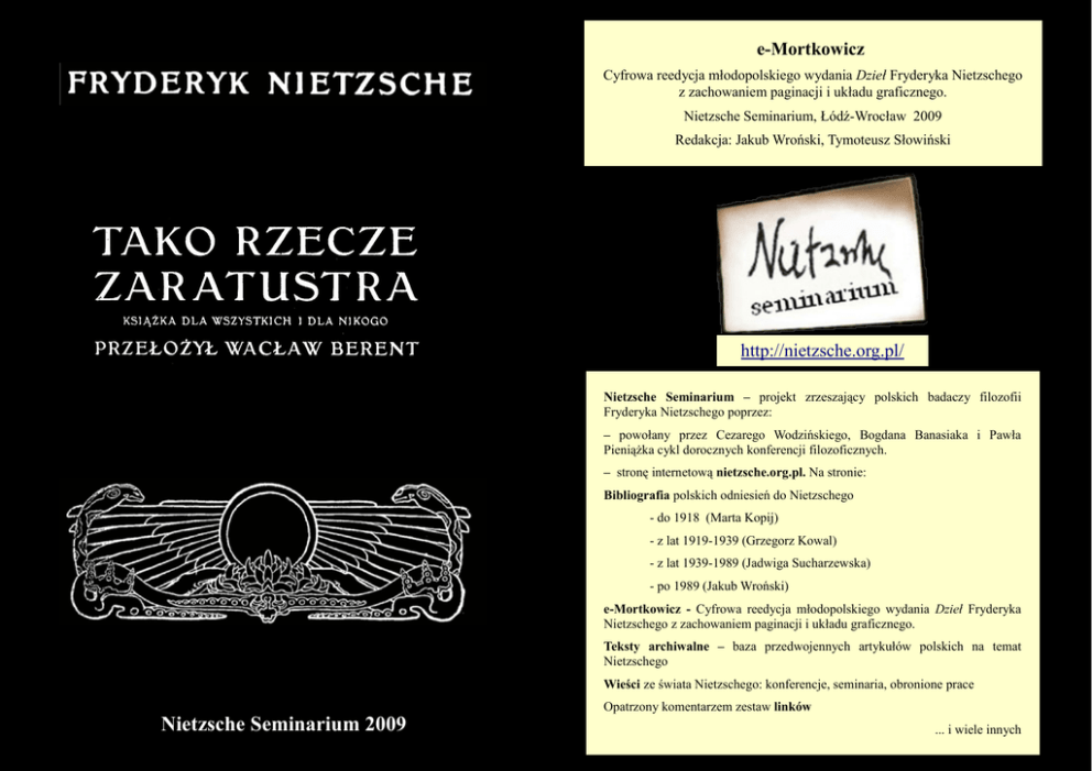 e-Mortkowicz Cyfrowa reedycja młodopolskiego wydania Dzieł Fryderyka Nietzschego z zachowaniem paginacji i układu graficznego. Nietzsche Seminarium, Łódź-Wrocław 2009 Redakcja: Jakub Wroński, Tymoteusz Słowiński http://nietzsche.org.pl/ Nietzsche Seminarium – projekt zrzeszający polskich badaczy filozofii Fryderyka Nietzschego poprzez: – powołany przez Cezarego Wodzińskiego, Bogdana Banasiaka i Pawła Pieniążka cykl dorocznych konferencji filozoficznych. – stronę internetową nietzsche.org.pl. Na stronie: Bibliografia polskich odniesień do Nietzschego - do 1918 (Marta Kopij) - z lat 1919-1939 (Grzegorz Kowal) - z lat 1939-1989 (Jadwiga Sucharzewska) - po 1989 (Jakub Wroński) e-Mortkowicz - Cyfrowa reedycja młodopolskiego wydania Dzieł Fryderyka Nietzschego z zachowaniem paginacji i układu graficznego. Teksty archiwalne – baza przedwojennych artykułów polskich na temat Nietzschego Wieści ze świata Nietzschego: konferencje, seminaria, obronione prace Nietzsche Seminarium 2009 Opatrzony komentarzem zestaw linków ... i wiele innych DZIEŁA FRYD. NIETZSCHEGO FRYDERYK W P R Z E K Ł A D Z I E WACŁAWA BERENTA, KONRADA DRZE WIECKIEGO, LEOPOLDA STAFFA I STANISŁAWA WYRZYKOWSKIEGO WYDAŁ JAKÓB MORTKOWICZ. NIETZSCHE TAKO RZECZE ZARATUSTRA KSIĄŻKA DLA WSZYSTKICH I DLA NIKOGO PRZEŁOŻYŁ WACŁAW B E R E N T WYDANIE TANIE, CAŁKOWITE WARSZAWA — KRAKÓW MCMXII NAKŁAD JAKÓBA MORTKOWICZA KRAKÓW — DRUK W. L. ANCZYCA I SPÓŁKI. PRZEDMOWA ZARATUSTRY ZARATUSTRA. I. Gdy Zaratustra trzydziestu lat dożył, opuścił kraj swój i jezioro ojczyste i poszedł w góry. Tu radował się duchowi swemu i samotności swej, a dzie sięć lat tak żyjąc, nie umęczył się niemi. Wreszcie przemieniło się serce jego, — i pewnego zaranku wstawszy wraz z jutrznią, wystąpił przed słońce i tak rzekł do niego: — Światłości ty olbrzymia! czemżeby było twe szczęście, gdybyś nie miała tych, komu jaśniejesz? Dziesięć lat wchodziłaś tu do mej jaskini; znu żyłabyś się i jaśnieniem swem i drogą swą beze mnie, bez mego orła i bez węża mego. Lecz my oto oczekiwaliśmy ciebie każdego za ranku, i biorąc nadmiar światła twego, błogosławiliśmy cię za to. Spojrzyj! Jam jest umęczony mą mądrością, jako pszczoła, co za wiele miodu zebrała; pożądam rąk, któreby się po nią wyciągnęły. Pragnąłbym rozdarowywać i obdzielać, aż póki I* 5 4 mądrych pośród ludzi nie uraduje ponownie własne szaleństwo, a ubogich własne bogactwo. Lecz nato w głębię znijść muszę, jako ty co wieczór to czynisz, gdy poza morze zstępujesz, aby i podziemnym światom swej udzielić jasności, — świa tło ty przehojne! Oto muszę, jako ty, z a j ś ć , wedle ludzkiego nazwania, znijść ku tym, których wola ma pożąda. Pobłogosławże ty mnie, wejrzenie spokojne, co nawet na nadmiar szczęścia bez zawiści patrzeć możesz! Błogosław kielich przepełniony, aby złotemi roz płynął się strugi i twej świetności odblask wszędzie poroznosił. Spojrzyj! kielich ten chce znowu być opróżnion, i Zaratustra chce znów być człowiekiem. — Tak się poczęło znijście Zaratustry. 2. Zaratustra zstępował samotny z gór, nie spoty kając po drodze nikogo. Gdy jednak w las się zanu rzył, stanął nagle przed nim starzec, co opuścił chatę swą świętą, aby korzonków szukać po lesie. I rzekł starzec do Zaratustry temi słowy: — Nie jest mi obcy ten wędrowiec; przed laty przechodził on tędy. Zaratustrą zwie się; jednakże przeobraził się on. Wonczas niosłeś swój popiół w góry; chceszże dzisiaj swój ogień nieść w doliny? Nie obawiasz się kary podpalacza? O tak, poznaję Zaratustrę! Czyste jest jego oko, a wokół ust jego nie czai się wstręt. Czyż nie stąpa on jako tancerz? Przeobrażony jest Zaratustra, dziecięciem stał się Zaratustra, ocknięty jest Zaratustra. I czegóż ty chcesz pośród śpiących? Żyłeś w samotności, jako w morzu, i morze niosło ciebie. Biada, chceszże teraz na ląd stąpić? Biada, chceszże znowu o własnych siłach wlec swe ciało ? Zaratustra odparł: — Kocham ludzi. — Czemuż, rzekł starzec, usunąłem się i ja niegdyś w lasy i w głusz samotną? Czyż nie dlatego, żem ludzi nazbyt ukochał? Teraz miłuję Boga, nie kocham ludzi. Człowiek jest rzeczą zbyt niedoskonałą. Miłość ku ludziom za biłaby mnie. Zaratustra odparł: — Cóżem ja o miłości mó wił! Niosę ludziom dar. — Nie dawaj im nic, rzekł święty. Raczej ujmij im nieco i dźwigaj z nimi społem. Tem najbardziej im wygodzisz: obyś sobie jeno tem dogodził! A jeśli chcesz ich koniecznie obdarzać, nie da waj więcej nad jałmużnę i każ im jeszcze żebrać o nią! — Nie, odparł Zaratustra, nie dawam jałmużny. Nie jestem nato dosyć ubogi. Święty zaśmiał się z Zaratustry i rzekł w te słowa: — Bacz więc, aby przyjęto twe skarby! Nieufni są oni względem samotników i nie wierzą, abyśmy przychodzili, by obdarzać, Kroki nasze dźwięczą im zbyt samotnie po pu stych ulicach. A gdy po nocy w swoich łożach, na 6 7 długo przed wschodem słońca czyjeś kroki zasłyszą, pytają wówczas: dokąd zmierza ten złodziej ? Nie chodź do ludzi, pozostań w lesie! Udaj się raczej do zwierząt! Czemu nie chcesz być jako ja, — niedźwiedziem pośród niedźwiedzi, ptakiem pośród ptaków ? — I cóż robi święty w lesie? — zapytał Zara tustra. Święty odparł: — Pieśni składam i śpiewam je, a gdy pieśni składam śmieję się i płaczę, i pomrukuję z cicha: tak Boga chwalę. Śpiewem, płaczem, śmiechem i pomrukiem chwalę Boga, który jest moim Bogiem. Lecz cóż to niesiesz ty nam w darze? Gdy Zaratustra te słowa usłyszał, pokłonił się świętemu i rzekł: «Czemźe was mógłbym ja obda rzyć? Pozwólcie mi jednak odejść czemprędzej, abym wam czego nie odebrał!« — I tak oto rozstali się ze sobą starzec i mąż, śmiejąc się jako dwa żak
