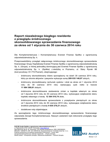 Raport niezależnego biegłego rewidenta z przeglądu śródrocznego skonsolidowanego sprawozdania finansowego za okres od 1 stycznia do 30 czerwca 2014 roku Dla Komplementariusza i Komandytariuszy Everest Finanse Spółka z ograniczoną odpowiedzialnością Sp. k. Przeprowadziliśmy przegląd załączonego śródrocznego skonsolidowanego sprawozdania finansowego Grupy Kapitałowej Everest Finanse Spółka z ograniczoną odpowiedzialnością Sp. k. (Grupa), w której jednostką dominującą jest Everest Finanse Spółka z ograniczoną odpowiedzialnością Sp. k. (Spółka) z siedzibą w Poznaniu, ul. Stary Rynek 88 (kod pocztowy: 61-772 Poznań), obejmującego: śródroczny skonsolidowany bilans sporządzony na dzień 30 czerwca 2014 roku, który po stronie aktywów i pasywów wykazuje sumę 209 035 148,97 złotych, śródroczny skonsolidowany rachunek zysków i strat za okres od 1 stycznia 2014 roku do 30 czerwca 2014 roku wykazujący zysk netto w kwocie 11 984 389,81 złotych, śródroczne skonsolidowane zestawienie zmian w kapitale własnym za okres od 1 stycznia 2014 roku do 30 czerwca 2014 roku, wykazujące zwiększenie stanu kapitału własnego o kwotę 12 364 510,74 złote, śródroczne skonsolidowane sprawozdanie z przepływów pieniężnych za okres od 1 stycznia 2014 roku do 30 czerwca 2014 roku, wykazujące zwiększenie stanu środków pieniężnych o kwotę 4 630 278,21 złotych, dodatkowe noty objaśniające. Za sporządzenie tego śródrocznego skonsolidowanego sprawozdania finansowego odpowiada Zarząd Komplementariusza. Naszym zadaniem było dokonanie przeglądu tego sprawozdania. HLB M2 Audyt Spółka z ograniczoną odpowiedzialnością Sp. k. ul. Rakowiecka 41/27, 02-521 Warszawa, www.hlbm2.pl Sąd Rejonowy dla M. St. Warszawy, XIII Wydział Gospodarczy, KRS: 0000380052, REGON: 142839770, NIP: 521-359-69-82, Komplementariusz: HLB M2 Audyt Sp. z o.o. Podmiot uprawniony do badania sprawozdań finansowych - numer 3697 Zarząd Komplementariusza: Maciej Czapiewski – Prezes Zarządu, Marek Dobek – Wiceprezes Zarządu, Aleksandra Motławska – Członek Zarządu. Strona 1 z 4 Przegląd przeprowadziliśmy stosownie do obowiązujących w Polsce przepisów prawa oraz postanowień krajowych standardów rewizji finansowej, wydanych przez Krajową Radę Biegłych Rewidentów. Standardy nakładają na nas obowiązek zaplanowania i przeprowadzenia przeglądu w taki sposób, aby uzyskać umiarkowaną pewność, że skonsolidowane sprawozdanie finansowe nie zawiera istotnych nieprawidłowości. Przeglądu dokonaliśmy głównie drogą analizy danych śródrocznego skonsolidowanego sprawozdania finansowego, wglądu w dokumentację konsolidacyjną oraz wykorzystania informacji uzyskanych od Zarządu Komplementariusza oraz osób odpowiedzialnych za finanse i rachunkowość Grupy. Zakres i metoda przeglądu skonsolidowanego sprawozdania finansowego istotnie różni się od badań leżących u podstaw opinii wyrażanej o rzetelności, prawidłowości i jasności rocznego sprawozdania finansowego, dlatego nie możemy wydać takiej opinii o załączonym śródrocznym sprawozdaniu finansowym. Na podstawie przeprowadzonego przeglądu nie zidentyfikowaliśmy niczego, co nie pozwoliłoby na stwierdzenie, że skonsolidowane sprawozdanie finansowe jest zgodne z wymagającymi zastosowania zasadami rachunkowości oraz że rzetelnie i jasno przedstawia, we wszystkich istotnych aspektach, sytuację majątkową i finansową Grupy na dzień 30 czerwca 2014 roku oraz jej wynik finansowy za okres od 1 stycznia 2014 roku do 30 czerwca 2014 roku, zgodnie z przepisami ustawy o rachunkowości z dnia 29 września 1994 r. (tekst jednolity: Dz. U. z 2013 r., poz. 330, z późn. zm.) mającymi zastosowanie do sprawozdawczości śródrocznej. Nie zgłaszając zastrzeżeń do prawidłowości i rzetelności przeglądanego śródrocznego skonsolidowanego sprawozdania finansowego, zwracamy uwagę na następujące kwestie: - Sąd Rejonowy Poznań – Nowe Miasto i Wilda, VIII Wydział Gospodarczy Krajowego Rejestru Sądowego dnia 10 stycznia 2014 roku dokonał rejestracji przekształcenia jednostki dominującej Everest Finanse Spółka z o.o. S.K.A. w spółkę komandytową działającą pod firmą Everest Finanse Spółka z ograniczoną odpowiedzialnością Sp.k. Uchwała w przedmiocie przekształcenia została podjęta przez Walne Zgromadzenie Spółki Everest Finanse Spółka z o.o. S.K.A dnia 10 grudnia 2013 roku. - Zarząd Komplementariusza jednostki dominującej w ustępie 4 dodatkowych informacji i objaśnień poinformował, że dnia 21 czerwca 2013 roku Urząd Kontroli Konkurencji i Konsumentów wydał postanowienie o wszczęciu postępowania przeciwko jednostce dominującej w sprawie stosowania praktyk naruszających zbiorowe interesy konsumentów. Do dnia wydania raportu z przeglądu śródrocznego skonsolidowanego sprawozdania finansowego postępowanie nie zostało zakończone. Zarząd Komplementariusza jednostki dominującej uważa, że postępowanie nie powinno zakończyć się dla jednostki dominującej negatywnymi konsekwencjami, gdyż stanowisko zajmowane przez jednostkę dominującą w zakresie kluczowych kwestii podniesionych przez Urząd Kontroli Konkurencji i Konsumentów jest zgodne z poglądem Dotyczy: Grupa Kapitałowa Everest Finanse Spółka z ograniczoną odpowiedzialnością Sp.k. Strona 2 z 4 wyrażanym przez Urząd Komisji Nadzoru Finansowego i było ono potwierdzane poprzez pozytywną weryfikację podczas kontroli Urzędu Ochrony Konkurencji i Konsumentów w latach ubiegłych. - Zgodnie z przyjętą polityką rachunkowości, w sporządzonym przez Zarząd Komplementariusza jednostki dominującej śródrocznym skonsolidowanym bilansie, aktywa finansowe z tytułu udzielonych pożyczek pozostałym jednostkom oraz rozliczenia międzyokresowe pasywne wykazano w kwocie powiększonej o należne opłaty z tytułu odsetek, obsługi w domu oraz zawartych ugód, dla których termin płatności przyp