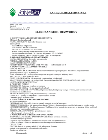 KARTA CHARAKTERYSTYKI ………………………………………………………………………………………. Numer karty: 1044 Wersja: 2 Data sporządzenia: 12.11.2010 Data aktualizacji: 09.01.2016 SIARCZAN SODU BEZWODNY 1. IDENTYFIKACJA PRODUKTU I PRODUCENTA 1.1.Identyfikacja substancji NAZWA PRODUKTU: Bezwodny Siarczan sodu DOSTAWCA Aneva Mariusz Klejnowski ul. Łuczka 12, 88-100 Inowrocław Tel. +48.525243137 fax. +48.523524490 E-mail: [email protected] strona internetowa: www.aneva.pl Osoba odpowiedzialna za K.Ch.: Mariusz Klejnowski Tel.525243137 telefon alarmowy: +48.52/5243137 (czynny 7:00 – 16:00 od pn-pt) 2. SKŁAD / INFORMACJA O SKŁADNIKACH NAZWA CHEMICZNA: Bezwodny siarczan sodu FORMUŁA CHEMICZNA: Na2SO4 MASA CZĄSTECZKOWA: 142,04 NUMERY IDENTYFIKACYJNE: CASE 7757-82-6 EINECS 231-820-9 3. IDENTYFIKACJA ZAGROŻEŃ / RYZYKA OGÓLNE RYZYKA SZKODLIWOŚĆ DLA ZDROWIA: Nie zaobserwowano szczególnego ryzyka dla zdrowia przy zachowaniu generalnych zasad użycia w przemyśle. INNE INFORMACJE: Działa przeczyszczająco w przypadku spożycia większej ilości. RYZYKO FIZYCZNE I CHEMICZNE OGIEŃ LUB EKSPLOZJA: Nie występuje ryzyko pożaru lub eksplozji. KLASYFIKACJA: Zgodnie z kryteriami Unii Europejskiej produkt NIE JEST TRAKTOWANY JAKO „SUBSTANCJA NIEBEZPIECZNA” 4. PIERWSZA POMOC WDYCHANIE: Oddychać świeżym powietrzem KONTAKT ZE SKÓRĄ: Nie ma specjalnych zaleceń KONTAKT Z OCZAMI: NATYCHMIAST przemyć dużą ilością wody w ciągu 15 minut, oczy szeroko otwarte. Skontaktować się z lekarzem. SPOŻYCIE: Przemyć usta wodą. Skontaktować się z lekarzem. OCHRONA: - aparaty do oddychania z odpowiednimi filtrami - rękawice, gogle ochronne, buty 5. POSTĘPOWANIE W PRZYPADKU POŻARU SPOSOBY GASZENIA PREFEROWANE: Wszystkie dostępne metody gaszenia mogą być stosowane. PRZECIWWSKAZANIA: Nie ma przeciwwskazań. Właściwy środek gaśniczy musi być używany w pobliżu ognia. NIEBEZPIECZEŃSTWA: Zgodnie z kryteriami Unii Europejskiej produkt jest uznawany za niepalny. Może wydzielać toksyczny gaz w przypadku podgrzania. OCHRONA PRACOWNIKÓW: - przeciwpyłowe maski - rękawice, gogle ochronne, buty 6. POSTĘPOWANIE W PRZYPADKU UWOLNIENIA INDYWIDUALNE ŚRODKI ZAPOBIEGAWCZE: Unikać kontaktu z oczami. Dalsze informacje w punkcie 8. Odgrodzić teren rozsypu oraz uniemożliwić wejście osób nieupoważnionych. OCHRONA ŚRODOWISKA: Produkt nie stwarza zagrożenia dla środowiska. CZYSZCZENIE: ODZYSK: Zebrać za pomocą miotły i / lub odkurzacza. Zebrany produkt przechowywać w odpowiednim pojemniku. Oznakować właściwie. Siarczan sodu strona 1 z 3 KARTA CHARAKTERYSTYKI ………………………………………………………………………………………. CZYSZCZENIE I ODKAŻANIE: Zmyć teren dużą ilością wody. UTYLIZACJA: Utylizować materiał lub zbrylone pozostałości w autoryzowanym zakładzie. 7. PRZEŁADUNKI I MAGAZYNOWANIE 7.1.PRZEŁADUNKI ŚRODKI TECHNICZNE: Nie są wymagane specjalne środki techniczne. ZALECENIA: Nie zapylać otoczenia. 7.2.MAGAZYNOWANIE ŚRODKI TECHNICZNE: Nie są wymagane specjalne środki techniczne. Miejsce magazynowania musi być suche. WARUNKI MAGAZYNOWANIA ZALECENIA: Przechowywać z dala od wilgoci. Nie składować na otwartym powietrzu. SUBSTANCJE WCHODZĄCE W REAKCJĘ: Informacje w punkcie 10. PAKOWANIE: Produkt może być przechowywany w powszechnie dostępnych opakowaniach. OPAKPOWANIA ZALECENIA: Stal. Materiały plastikowe (polietylen, polipropylen). PRZECIWWSKAZANIA: Nie ma. 8. KONTROLA NARAŻENIA / ŚRODKI OCHRONY OSOBISTEJ METODY OCENY NARAŻENIA Zlokalizować miejsce pylenia. Zapewnić dobrą wentylację w miejscu pracy. OCHRONA INDYWIDUALNA OCHRONA DRÓG ODDECHOWYCH: Aparaty do oddychania z odpowiednimi filtrami. OCHRONA OCZU: Gogle ochronne. 9. WŁAŚCIWOŚCI FIZYCZNE I CHEMICZNE WYGLĄD STAN: Stały POSTAĆ: Sypki ŚREDNIA WIELKOŚĆ ZIAREN (ø): 200 – 500 μm KOLOR: Biały ZAPACH: Brak pH: 5,5 – 9,5 (w roztworze wodnym 10 g/l ) CHARAKTERYSTYKA TEMPERATUROWA: TEMPERATURA TOPNIENIA: 884 oC TEMPERATURA WRZENIA: 1429 oC (poniżej 1013 hPa) TEMPERATURA PRZEMIANY: 365 oC TEMPERATURA ROZKŁADU: 1200 oC CHARAKTERYSTYKA PALNOŚCI: PALNOŚĆ: Nie odnosi się. WŁASNOŚCI WSPÓŁPALIWA: Nie ma, zgodnie z kryteriami Unii Europejskiej. WŁASNOŚCI WYBUCHOWE: Nie odnosi się. CIĘŻAR NASYPOWY: 1,3 – 1,6 kg / dm3 CIĘŻAR WŁAŚCIWY: 2,68 kg / dm3 przy 20 oC ROZPUSZCZALNOŚĆ W WODZIE: 193 g/l przy 20 oC 488 g/l przy 40 oC 452 g/l przy 60 oC W ROZPUSZCZALNIKACH ORGANICZNYCH: Nie rozpuszcza się w alkoholu (etanol) i glikolu. HIGROSKOPIJNOŚĆ: Produkt bardzo higroskopijny. 10. STABILNOŚĆ I REAKTYWNŚĆ STABILNOŚĆ: Stabilne w temperaturze pokojowej i w normalnych warunkach używania. NIEBEZPIECZNE REAKCJE: WARUNKI, KTÓRYCH NALEŻY UNIKAĆ: Nie są znane niebezpieczne reakcje podczas normalnych warunków używania. MATERIAŁY, KTÓRYCH NALEŻY UNIKAĆ: Nie są znane niebezpieczne reakcje z innymi materiałami. NIEBEZPIECZNE PRODUKTY ROZPADU:Podczas rozkładu termicznego powstaje toksyczny gaz (tlenek siarki). 11. INFORMACJE TOKSYKOLOGICZNE DUŻA TOKSYCZNOŚĆ: DL 50 doustnie (topo): 5989 mg / kg. OSTRE OBJAWY: Biegunka. MIEJSCOWE DZIAŁANIA: Produkt pylisty. Może powodować lekkie podrażnienie śluzówki nosa jako rezultat mechanicznego Siarczan sodu strona 2 z 3 KARTA CHARAKTERYSTYKI ………………………………………………………………………………………. podrażnienia. 12. INFORMACJE EKOLOGICZNE PRZENIKANIE: Roztwór wodny łatwo przenika do gleby podczas opadów deszczu. BIOAKUMULACJA: Produkt nie ulega bioakumulacji. TOKSYCZNOŚĆ EKOLOGICZNA SKUTKI W ŚRODOWISKU WODNYM: CE 50 – (Dafnia magna) / 24 godziny: 6800 mg / l 13. POSTĘPOWANIE Z ODPADAMI POZOSTAŁOŚCI PRODUKTU: NISZCZENIE / USUWANIE: Usuwać zgodnie z lokalnymi przepisami. BRUDNE OPAKOWANIA: CZYSZCZENIE: Czyścić uniwersalne cysterny kolejowe i samochodowe. NISZCZENIE / USUWANIE: Worki i big – bagi spal