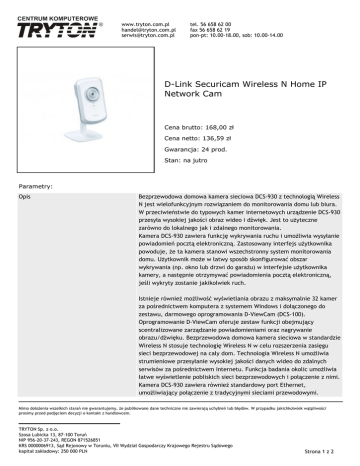 www.tryton.com.pl [email protected] [email protected] tel. 56 658 62 00 fax 56 658 62 19 pon-pt: 10.00-18.00, sob: 10.00-14.00 D-Link Securicam Wireless N Home IP Network Cam Cena brutto: 168,00 zł Cena netto: 136,59 zł Gwarancja: 24 prod. Stan: na jutro Parametry: Opis Bezprzewodowa domowa kamera sieciowa DCS-930 z technologią Wireless N jest wielofunkcyjnym rozwiązaniem do monitorowania domu lub biura. W przeciwieństwie do typowych kamer internetowych urządzenie DCS-930 przesyła wysokiej jakości obraz wideo i dźwięk. Jest to użyteczne zarówno do lokalnego jak i zdalnego monitorowania. Kamera DCS-930 zawiera funkcję wykrywania ruchu i umożliwia wysyłanie powiadomień pocztą elektroniczną. Zastosowany interfejs użytkownika powoduje, że ta kamera stanowi wszechstronny system monitorowania domu. Użytkownik może w łatwy sposób skonfigurować obszar wykrywania (np. okno lub drzwi do garażu) w interfejsie użytkownika kamery, a następnie otrzymywać powiadomienia pocztą elektroniczną, jeśli wykryty zostanie jakikolwiek ruch. Istnieje również możliwość wyświetlania obrazu z maksymalnie 32 kamer za pośrednictwem komputera z systemem Windows i dołączonego do zestawu, darmowego oprogramowania D-ViewCam (DCS-100). Oprogramowanie D-ViewCam oferuje zestaw funkcji obejmujący scentralizowane zarządzanie powiadomieniami oraz nagrywanie obrazu/dźwięku. Bezprzewodowa domowa kamera sieciowa w standardzie Wireless N stosuje technologię Wireless N w celu rozszerzenia zasięgu sieci bezprzewodowej na cały dom. Technologia Wireless N umożliwia strumieniowe przesyłanie wysokiej jakości danych wideo do zdalnych serwisów za pośrednictwem Internetu. Funkcja badania okolic umożliwia łatwe wyświetlenie pobliskich sieci bezprzewodowych i połączenie z nimi. Kamera DCS-930 zawiera również standardowy port Ethernet, umożliwiający połączenie z tradycyjnymi sieciami przewodowymi. Mimo dołożenia wszelkich starań nie gwarantujemy, że publikowane dane techniczne nie zawierają uchybień lub błędów. W przypadku jakichkolwiek wątpliwości prosimy przed podjęciem decyzji o kontakt z handlowcem. TRYTON Sp. z o.o. Szosa Lubicka 13, 87-100 Toruń NIP 956-20-37-243, REGON 871526851 KRS 0000006913, Sąd Rejonowy w Toruniu, VII Wydział Gospodarczy Krajowego Rejestru Sądowego kapitał zakładowy: 250 000 PLN Strona 1 z 2 www.tryton.com.pl [email protected] [email protected] tel. 56 658 62 00 fax 56 658 62 19 pon-pt: 10.00-18.00, sob: 10.00-14.00 Przedstawiona oferta cenowa ma charakter informacyjny, nie stanowi oferty handlowej w rozumieniu Art.66 par.1 Kodeksu Cywilnego oraz innych właściwych przepisów prawnych. TRYTON Sp. z o.o. Szosa Lubicka 13, 87-100 Toruń NIP 956-20-37-243, REGON 871526851 KRS 0000006913, Sąd Rejonowy w Toruniu, VII Wydział Gospodarczy Krajowego Rejestru Sądowego kapitał zakładowy: 250 000 PLN Strona 2 z 2