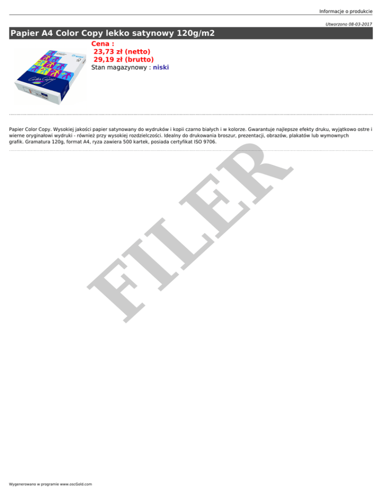 Informacje o produkcie Utworzono 08-03-2017 Papier A4 Color Copy lekko satynowy 120g/m2 Cena : 23,73 zł (netto) 29,19 zł (brutto) Stan magazynowy : niski FI LE R Papier Color Copy. Wysokiej jakości papier satynowany do wydruków i kopii czarno białych i w kolorze. Gwarantuje najlepsze efekty druku, wyjątkowo ostre i wierne oryginałowi wydruki - również przy wysokiej rozdzielczości. Idealny do drukowania broszur, prezentacji, obrazów, plakatów lub wymownych grafik. Gramatura 120g, format A4, ryza zawiera 500 kartek, posiada certyfikat ISO 9706. Wygenerowano w programie www.oscGold.com