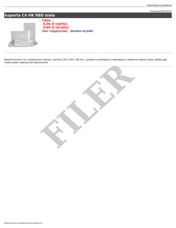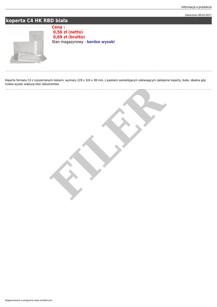 Informacje o produkcie Utworzono 08-03-2017 koperta C4 HK RBD biała Cena : 0,56 zł (netto) 0,69 zł (brutto) Stan magazynowy : bardzo wysoki FI LE R Koperta formatu C4 z rozszerzanymi bokami, wymiary 229 x 324 x 38 mm, z paskiem samoklejącym ułatwiającym zaklejenie koperty, biała, idealna gdy trzeba wysłać większą ilość dokumentów Wygenerowano w programie www.oscGold.com