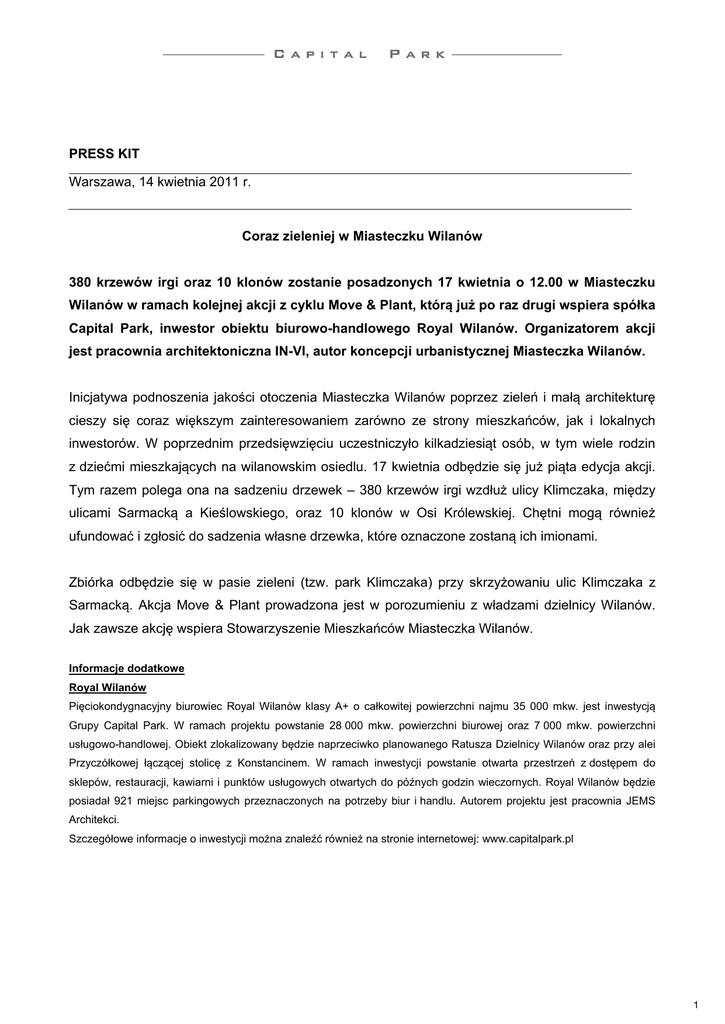 PRESS KIT Warszawa, 14 kwietnia 2011 r. Coraz zieleniej w Miasteczku Wilanów 380 krzewów irgi oraz 10 klonów zostanie posadzonych 17 kwietnia o 12.00 w Miasteczku Wilanów w ramach kolejnej akcji z cyklu Move & Plant, którą już po raz drugi wspiera spółka Capital Park, inwestor obiektu biurowo-handlowego Royal Wilanów. Organizatorem akcji jest pracownia architektoniczna IN-VI, autor koncepcji urbanistycznej Miasteczka Wilanów. Inicjatywa podnoszenia jakości otoczenia Miasteczka Wilanów poprzez zieleń i małą architekturę cieszy się coraz większym zainteresowaniem zarówno ze strony mieszkańców, jak i lokalnych inwestorów. W poprzednim przedsięwzięciu uczestniczyło kilkadziesiąt osób, w tym wiele rodzin z dziećmi mieszkających na wilanowskim osiedlu. 17 kwietnia odbędzie się już piąta edycja akcji. Tym razem polega ona na sadzeniu drzewek – 380 krzewów irgi wzdłuż ulicy Klimczaka, między ulicami Sarmacką a Kieślowskiego, oraz 10 klonów w Osi Królewskiej. Chętni mogą również ufundować i zgłosić do sadzenia własne drzewka, które oznaczone zostaną ich imionami. Zbiórka odbędzie się w pasie zieleni (tzw. park Klimczaka) przy skrzyżowaniu ulic Klimczaka z Sarmacką. Akcja Move & Plant prowadzona jest w porozumieniu z władzami dzielnicy Wilanów. Jak zawsze akcję wspiera Stowarzyszenie Mieszkańców Miasteczka Wilanów. Informacje dodatkowe Royal Wilanów Pięciokondygnacyjny biurowiec Royal Wilanów klasy A+ o całkowitej powierzchni najmu 35 000 mkw. jest inwestycją Grupy Capital Park. W ramach projektu powstanie 28 000 mkw. powierzchni biurowej oraz 7 000 mkw. powierzchni usługowo-handlowej. Obiekt zlokalizowany będzie naprzeciwko planowanego Ratusza Dzielnicy Wilanów oraz przy alei Przyczółkowej łączącej stolicę z Konstancinem. W ramach inwestycji powstanie otwarta przestrzeń z dostępem do sklepów, restauracji, kawiarni i punktów usługowych otwartych do późnych godzin wieczornych. Royal Wilanów będzie posiadał 921 miejsc parkingowych przeznaczonych na potrzeby biur i handlu. Autorem projektu jest pracownia JEMS Architekci. Szczegółowe informacje o inwestycji można znaleźć również na stronie internetowej: www.capitalpark.pl 1 O inwestorze Grupa Capital Park aktywnie działa na polskim rynku nieruchomości od 2005 roku inwestując wspólnie z międzynarodowym funduszem private equity Patron Capital Partners dysponującym kapitałem w kwocie ponad 1,7 mld EUR. Grupa Capital Park i Patron Capital Partners stworzyły jeden z największych na polskim rynku portfeli nieruchomości składający się z powierzchni biurowych, handlowych i mieszkaniowych w budynkach istniejących i przeznaczonych do realizacji. Biuro prasowe Capital Park Joanna Cybulska tel. 0 48 22 642 24 16, + 48 609 716 113, email: [email protected] 2