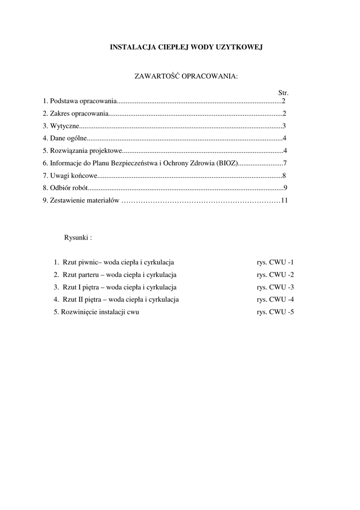 INSTALACJA CIEPŁEJ WODY UZYTKOWEJ ZAWARTOŚĆ OPRACOWANIA: Str. 1. Podstawa opracowania...........................................................................................2 2. Zakres opracowania................................................................................................2 3. Wytyczne................................................................................................................3 4. Dane ogólne............................................................................................................4 5. Rozwiązania projektowe.........................................................................................4 6. Informacje do Planu Bezpieczeństwa i Ochrony Zdrowia (BIOZ).........................7 7. Uwagi końcowe......................................................................................................8 8. Odbiór robót............................................................................................................9 9. Zestawienie materiałów …………………………………………………………11 Rysunki : 1. Rzut piwnic– woda ciepła i cyrkulacja rys. CWU -1 2. Rzut parteru – woda ciepła i cyrkulacja rys. CWU -2 3. Rzut I piętra – woda ciepła i cyrkulacja rys. CWU -3 4. Rzut II piętra – woda ciepła i cyrkulacja rys. CWU -4 5. Rozwinięcie instalacji cwu rys. CWU -5 1. Podstawa opracowania. 1. Zlecenie inwestora. 2. Obowiązujące normy i przepisy. 3. Uzgodnienie z Inwestorem – założeń technologicznych dla instalacji c.w.u. 4. Inwentaryzacja architektoniczno-budowlana budynku mieszkalnego Gliwice, ul. Dziewanny 7; PPUH PROCAL; Gliwice,2009. 2. Przedmiot i zakres opracowania. Opracowanie dokumentacji projektowo-kosztorysowej wewnętrznej instalacji ciepłej wody użytkowej w nieruchomości przy ul. Dziewanny 7 w Gliwicach. 3. Wytyczne. Obliczenia wykonano w oparciu o: PN - 92/B-01706 PN - 92/B-01707 Instalacje wodociągowe. Wymagania w projektowaniu. Instalacje kanalizacyjne. Wymagania w projektowaniu. PN-B-02421 PN - 91/M-54910 Izolacja cieplna przewodów, armatury i urządzeń. Wodociągi. Zabudowa zestawów wodomierzowych w połączeniach wodociągowych. Aprobata techniczna dla rur i kształtek Wavin Bor Elementy rurociągów. Definicja i dobór PN Systemy przewodów z tworzyw sztucznych. Systemy przewodów z niezmiękczonego polichlorku winylu (PVC-U) do przesyłania wody. Wymagania ogólne Systemy przewodów z tworzyw sztucznych. Systemy przewodów z niezmiękczonego polichlorku winylu (PVC-U) do przesyłania wody. Rury Systemy przewodów z tworzyw sztucznych. Systemy przewodów z niezmiękczonego polichlorku winylu (PVC-U) do przesyłania wody: Kształtki Systemy przewodów z tworzyw sztucznych. Systemy przewodów z niezmiękczonego polichlorku winylu (PVC-U) do przesyłania wody. Zawory i wyposażenie pomocnicze Systemy przewodów z tworzyw sztucznych. Systemy przewodów z niezmiękczonego polichlorku winylu (PVC-U) do przesyłania wody. Przydatność do stosowania w systemie. Elementy rurociągów. Definicje i dobór DN (wymiaru nominalnego) Gwinty rurowe połączeń ze szczelnością uzyskiwaną na gwincie. Wymiary, tolerancje i oznaczenia. Pomiar objętości wody w przewodach. Wodomierze do wody pitnej zimnej. Wymagania instalacyjne. AT2001-02-1050 PN-EN 1333: 1998 PN-EN 1452-1 :2002 PN-EN 1452-2:2002 PN-EN 1452-3:2002 PN-EN 1452-4:2002 PN-EN 1452-5:2002 PN-EN ISO 6708: 1998 PN-ISO 4064-2+Adl: 1997 PN-84/B-0 170 I Instalacje wewnętrzne wodociągowe i kanalizacyjne. Oznaczenia na rysunkach 2 4. Dane ogólne. Wymagane minimalne ciśnienie dla cwu Wymagane minimalne ciśnienie dyspozycyjne dla ccw 280,0 [kPa] 10,0 [kPa] Przepływ w źródle cwu 0,91 dm3/s Przepływ w źródle ccw 0,10 dm3/s 5. Rozwiązania projektowe. W budynku przewidziano montaż instalacji wody ciepłej użytkowej (cwu) i cyrkulacji (ccw). Na podstawie wykonanych obliczeń wyznaczono przepływy obliczeniowe, oraz dobrano średnice dla zalecanych prędkości. Rozprowadzenie poziomów pod stropem piwnic oraz w bruzdach ściennych w mieszkaniach. Piony instalacji prowadzić w spiżarkach w kuchniach. Dla każdego lokalu mieszkalnego przewidziano montaż układu pomiarowego cwu umiejscowionego przy pionach cwu i ccw, składającego się z dwóch zaworów kulowych, filtru siatkowego i wodomierza skrzydełkowego wody ciepłej. Dla instalacji cyrkulacji w miejscach zaznaczonych na rysunku rozwinięć należy zamontować zawory równoważące do cyrkulacji ciepłej wody użytkowej firmy Danfoss typ MTCV. PRZEWODY WODOCIĄGOWE Instalację wody ciepłej i cyrkulacji należy wykonać z rur PP PN20 Stabi. Przewody wodne prowadzić zgodnie z rysunkami pod stropem piwnic i w bruzdach ściennych. Na pionach punkty stałe montować pod trójnikiem przy każdym odejściu. Można to realizować za pomocą uchwytów z wkładką gumową. Wszystkie przejścia przewodów przez przegrody budowlane należy wykonać w tulejach ochronnych, umożliwiających wzdłużne przemieszczanie się przewodu w ścianie. Przestrzeń pomiędzy tuleją a rurą należy wypełnić elastycznym kitem, nie powodującym uszkodzenia przewodu i obojętnym chemicznie w stosunku do materiału, z którego wykonana jest rura. W tulei nie może znajdować się żadne połączenie na przewodzie. Przewody wody ciepłej prowadzone pod tynkiem powinny być na całej długości owinięte otuliną izolacyjną lub folią, przy zapewnieniu wokół owinięcia przestrzeni powietrznej lub 3 prowadzone swobodnie w rurze osłonowej z tworzywa sztucznego. Przewody należy mocować do elementów konstrukcji budynku za pomocą podpór stałych i przesuwnych. Pomiędzy przewodem a obejmą uchwytu, wspornika lub wieszaka należy stosować przekładkę elastyczną, z wyjątkiem podpór wykonanych z tworzywa sztucznego. Podejścia instalacji należy mocować przy punktach czerpalnych. Przewody rozdzielcze powinny być prowadzone ze spadkiem min. 5 o/oo w kierunku przeciwnym do