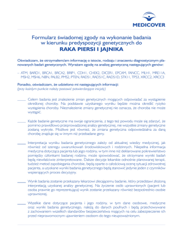 Formularz świadomej zgody na wykonanie badania w kierunku predyspozycji genetycznych do Raka piersi i jajnika Oświadczam, że otrzymałem/am informację o istocie, rodzaju i znaczeniu diagnostycznym planowanych badań genetycznych. Wyrażam zgodę na analizę genetyczną następujących genów: –ATM, BARD1, BRCA1, BRCA2, BRIP1, CDH1, CHEK2, DICER1, EPCAM, FANCC, MLH1, MRE11A, MSH2, MSH6, NBN, PALB2, PMS2, PTEN, RAD51, RAD51C, RAD51D, STK11, TP53, XRCC2, XRCC3 Ponadto, oświadczam, że udzielono mi następujących informacji: (przy każdym punkcie należy postawić potwierdzające inicjały) Celem badania jest znalezienie zmian genetycznych mogących odpowiadać za wystąpienie określonej choroby. Na podstawie uzyskanego wyniku będzie można określić ryzyko wystąpienia choroby. Nieznalezienie zmiany genetycznej nie oznacza, że choroba nie może wystąpić. Każde badanie genetyczne ma swoje ograniczenia, z tego też powodu może się zdarzyć, że pomimo prawidłowo przeprowadzonej analizy genetycznej, nie wszystkie zmiany genetyczne zostaną wykryte. Możliwe jest również, że zmiana genetyczna odpowiedzialna za daną chorobę znajduje się w innym niż przebadane geny. Interpretacja wyniku badania genetycznego zależy od aktualnej wiedzy medycznej, jak również od szeregu uwarunkowań środowiskowych i rodzinnych. Niepełna informacja medyczna dotycząca pacjenta lub jego rodziny, w tym inne niż deklarowane pokrewieństwo pomiędzy członkami badanej rodziny, może spowodować, że otrzymane wyniki badań będą niewłaściwie zinterpretowane. Dalsze decyzje lekarskie odnośnie planowanej terapii, tudzież metod zapobiegania chorobie, będą oparte o całościową ocenę sytuacji zdrowotnej pacjenta, a uzyskane wyniki badania genetycznego będą stanowić jedynie jeden z czynników wspierających proces decyzyjny. Wynik badania zostanie przekazany lekarzowi zlecającemu badanie, który przedstawi złożoną interpretacją uzyskanej analizy genetycznej. Na życzenie osób uprawnionych (pacjent lub osoba prawnie go reprezentująca) wynik zostanie przekazany również bezpośrednio osobie uprawnionej. Wszelkie dane dotyczące pacjenta i jego rodziny, w tym dane osobowe, medyczne oraz wyniki badania genetycznego, należą do danych poufnych i będą przechowywane z zachowaniem wszelkich standardów bezpieczeństwa mających na celu zabezpieczenie ich przed nieprawomocnym ujawnieniem osobom do tego nieupoważnionym. Niezależnie od przestrzegania standardów laboratoryjnych, wyizolowany materiał genetyczny może ulec degradacji (zniszczeniu), co uniemożliwi przeprowadzenie zleconej analizy genetycznej. W takim przypadku może zajść potrzeba ponownego pobrania materiału biologicznego (krwi). Po zakończeniu zleconego badania genetycznego, wyizolowany materiał genetyczny (DNA/RNA) i dane kliniczne mogą być przechowywane i anonimowo wykorzystane w celach edukacyjnych i do badań naukowych, mających na celu rozszerzenie wiedzy na temat molekularnego podłoża chorób genetycznych. W przypadku niewyrażenia zgody na takowe wykorzystanie, materiał genetyczny (DNA/RNA) zostanie zniszczony. Data Czytelny podpis pacjenta Wyrażam zgodę na anonimowe wykorzystanie pozyskanego ode mnie materiału genetycznego (DNA/RNA) oraz danych klinicznych w celach edukacyjnych i do badań naukowych. TAK Data NIE Czytelny podpis pacjenta Pacjent został poinformowany o szczegółach dotyczących planowanych badań genetycznych oraz możliwych wynikach tych badań, które będą wymagały właściwej interpretacji medycznej. Data Podpis i pieczątka lekarza kierującego lub osoby upoważnionej