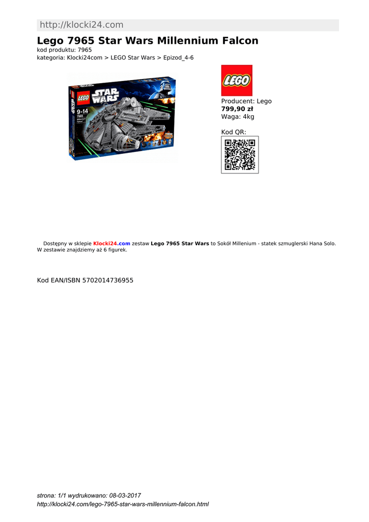 http://klocki24.com Lego 7965 Star Wars Millennium Falcon kod produktu: 7965 kategoria: Klocki24com > LEGO Star Wars > Epizod_4-6 Producent: Lego 799,90 zł Waga: 4kg Kod QR: Dostępny w sklepie Klocki24.com zestaw Lego 7965 Star Wars to Sokół Millenium - statek szmuglerski Hana Solo. W zestawie znajdziemy aż 6 figurek. Kod EAN/ISBN 5702014736955 strona: 1/1 wydrukowano: 08-03-2017 http://klocki24.com/lego-7965-star-wars-millennium-falcon.html
