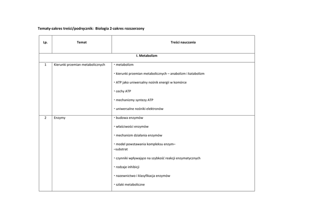 Tematy-zakres treści/podręcznik: Biologia 2-zakres rozszerzony Lp. Temat Treści nauczania I. Metabolizm 1 Kierunki przemian metabolicznych metabolizm kierunki przemian metabolicznych – anabolizm i katabolizm ATP jako uniwersalny nośnik energii w komórce cechy ATP mechanizmy syntezy ATP uniwersalne nośniki elektronów 2 Enzymy budowa enzymów właściwości enzymów mechanizm działania enzymów model powstawania kompleksu enzym– –substrat czynniki wpływające na szybkość reakcji enzymatycznych rodzaje inhibicji nazewnictwo i klasyfikacja enzymów szlaki metaboliczne regulacja przebiegu szlaków metabolicznych 3 Autotroficzne odżywianie się organizmów – fotosynteza pokarm jako źródło energii synteza cukrów prostych w przebiegu fotosyntezy barwniki aktywne w fotosyntezie budowa i funkcje fotosystemów I i II fotosynteza u roślin – fazy zależna i niezależna od światła przyczyny i skutki fotooddychania rośliny typu C3 i C4 fotosynteza u roślin typu CAM znaczenie fotosyntezy 4 Czynniki wpływające na intensywność fotosyntezy wpływ światła na intensywność fotosyntezy wpływ CO2 na intensywność fotosyntezy wpływ temperatury na intensywność fotosyntezy wpływ wody na intensywność fotosyntezy wpływ soli mineralnych na intensywność fotosyntezy 5 Przebieg chemosyntezy synteza cukrów prostych podczas chemosyntezy znaczenie chemosyntezy 6 Oddychanie tlenowe oddychanie komórkowe przebieg oddychania tlenowego: glikoliza, reakcja pomostowa, cykl Krebsa, łańcuch oddechowy bilans energetyczny oddychania tlenowego wpływ wybranych czynników na intensywność oddychania tlenowego 7 Procesy beztlenowego uzyskiwania energii oddychanie beztlenowe i fermentacja uzyskiwanie energii na drodze fermentacji zysk energetyczny procesów beztlenowych porównanie procesów uzyskiwania energii 8 Inne ważne procesy metaboliczne glukoneogeneza i glikogenoliza rozkład tłuszczów deaminacja produkty przemiany materii i ich usuwanie – cykl mocznikowy 9 Powtórzenie i utrwalenie Powtórzenie i utrwalenie wiadomości i umiejętności z rozdziału I wiadomości 10 Sprawdzenie stopnia opanowania wiadomości i umiejętności Sprawdzenie stopnia opanowania wiadomości i umiejętności z rozdziału I II. Organizm człowieka. Skóra – powłoka ciała 11 Organizm człowieka jako funkcjonalna całość hierarchiczna budowa organizmu homeostaza i sprzężenie zwrotne układy narządów i ich funkcje regulacja temperatury ciała człowieka utrzymywanie prawidłowego ciśnienia krwi 12 Budowa i funkcje skóry funkcje skóry budowa naskórka i skóry właściwej tkanka podskórna wytwory naskórka 13 Choroby i higiena skóry wpływ promieniowania słonecznego na skórę czerniak złośliwy jako choroba współczesnego świata alergia skórna zaburzenia funkcjonowania gruczołów choroby wirusowe i bakteryjne choroby pasożytnicze grzybice oparzenia higiena skóry 14 Powtórzenie i utrwalenie wiadomości Powtórzenie i utrwalenie wiadomości i umiejętności z rozdziału II 15 Sprawdzenie stopnia opanowania wiadomości i umiejętności Sprawdzenie stopnia opanowania wiadomości i umiejętności z rozdziału II III. Aparat ruchu 16 Ogólna budowa i funkcje szkieletu część bierna i czynna aparatu ruchu funkcje kości budowa i rozwój szkieletu kształty kości budowa kości 17 Rodzaje połączeń kości połączenia kości ścisłe i ruchome budowa stawu i funkcje budujących go elementów rodzaje stawów 18 Elementy szkieletu budowa i rola elementów szkieletu osiowego: czaszki, kręgosłupa i klatki piersiowej budowa obręczy barkowej i kończyny górnej budowa obręczy miedniczej i kończyny dolnej porównanie miednicy kobiety z miednicą mężczyzny 19 Budowa i funkcjonowanie układu mięśniowego rodzaje mięśni ze względu na rodzaj budujących je tkanek położenie i funkcje poszczególnych mięśni szkieletowych budowa mięśni szkieletowych antagonistyczne działanie mięśni źródła energii skurczu mięśnia mechanizm skurczu mięśnia mięśnie czerwone i mięśnie białe rodzaje skurczów (tężcowy, izotoniczny, izometryczny) 20 Choroby i higiena aparatu ruchu urazy mechaniczne i ich skutki wady postawy wady budowy stóp wybrane choroby układu ruchu wpływ aktywności fizycznej na zdrowie przetrenowanie doping w sporcie 21 Powtórzenie i utrwalenie wiadomości Powtórzenie i utrwalenie wiadomości i umiejętności z rozdziału III 22 Sprawdzenie stopnia opanowania wiadomości i umiejętności Sprawdzenie stopnia opanowania wiadomości i umiejętności z rozdziału III IV. Układ pokarmowy 23 Budulcowe i energetyczne składniki pokarmowe znaczenie i podział białek rola lipidów znaczenie i podział węglowodanów zapotrzebowanie organizmu na składniki odżywcze 24 Rola witamin w diecie klasyfikacja witamin źródła witamin zapotrzebowanie na witaminy charakterystyka witamin 25 Rola wody i soli mineralnych w organizmie znaczenie wody w organizmie bilans wodny organizmu rola i podział składników mineralnych 26 Budowa i funkcje układu pokarmowego trawienie pokarmu budowa i rola narządów układu pokarmowego trawienie cukrów, białek i tłuszczów wchłanianie składników pokarmowych wątroba jako centrum metaboliczne organizmu regulacja czynności układu pokarmowego 27 Higiena i choroby układu pokarmowego zasady prawidłowego żywienia czynniki wpływające na zapotrzebowanie energetyczne organizmu zaburzenia odżywiania choroby układu pokarmowego otyłość jako choroba współczesnego świata 28 Powtórzenie i utrwalenie wiadomości Powtórzenie i utrwalenie wiadomości i umiejętności z rozdziału IV 29 Sprawdzenie stopnia opanowania wiadomości i umiejętności Sprawdzenie stopnia opanowania wiadomości i umiejętności z rozdziału IV V. Układ oddechowy 30 Budowa i funkcjonowanie układu oddechowego budowa i funkcje dróg oddechowych budowa płuc 31 Wentylacja i wymiana gazowa wentylacja płuc rola opłucnej pojemność płuc regulacja często