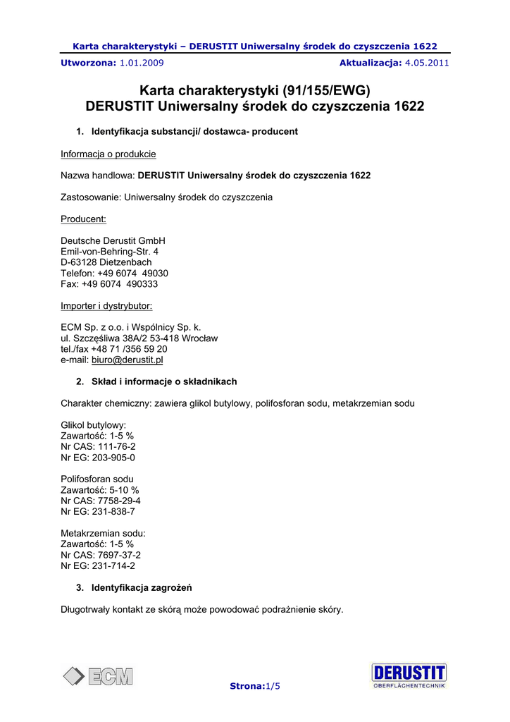 Karta charakterystyki – DERUSTIT Uniwersalny środek do czyszczenia 1622 Utworzona: 1.01.2009 Aktualizacja: 4.05.2011 Karta charakterystyki (91/155/EWG) DERUSTIT Uniwersalny środek do czyszczenia 1622 1. Identyfikacja substancji/ dostawca- producent Informacja o produkcie Nazwa handlowa: DERUSTIT Uniwersalny środek do czyszczenia 1622 Zastosowanie: Uniwersalny środek do czyszczenia Producent: Deutsche Derustit GmbH Emil-von-Behring-Str. 4 D-63128 Dietzenbach Telefon: +49 6074 49030 Fax: +49 6074 490333 Importer i dystrybutor: ECM Sp. z o.o. i Wspólnicy Sp. k. ul. Szczęśliwa 38A/2 53-418 Wrocław tel./fax +48 71 /356 59 20 e-mail: [email protected] 2. Skład i informacje o składnikach Charakter chemiczny: zawiera glikol butylowy, polifosforan sodu, metakrzemian sodu Glikol butylowy: Zawartość: 1-5 % Nr CAS: 111-76-2 Nr EG: 203-905-0 Polifosforan sodu Zawartość: 5-10 % Nr CAS: 7758-29-4 Nr EG: 231-838-7 Metakrzemian sodu: Zawartość: 1-5 % Nr CAS: 7697-37-2 Nr EG: 231-714-2 3. Identyfikacja zagrożeń Długotrwały kontakt ze skórą może powodować podrażnienie skóry. Strona:1/5 Karta charakterystyki – DERUSTIT Uniwersalny środek do czyszczenia 1622 Utworzona: 1.01.2009 Aktualizacja: 4.05.2011 4. Pierwsza pomoc Podstawowe działania Nie wymaga szczególnych. Kontakt ze skórą Opłukać dużą ilością bieżącej wody i jeżeli to możliwe skontaktować się z lekarzem oraz pokazać opakowanie lub etykietę. Kontakt z oczami Płukać dużą ilością wody przez około 10 minut z szeroko otwartą powieką, a następnie skontaktować się z okulistą i jeżeli to możliwe pokazać opakowanie lub etykietę. Wdychanie Przenieść poszkodowanego na świeże powietrze i położyć w pozycji bezpiecznej. Skontaktować się z lekarzem i jeżeli to możliwe pokazać opakowanie lub etykietę. Spożycie Wypić dużą ilość wody! Nie wywoływać wymiotów. Pilnie skontaktować się z lekarzem i jeżeli to możliwe pokazać opakowanie lub etykietę! 5. Postępowanie w przypadku pożaru Zalecany środek gaszący Woda, proszek, piana, dwutlenek węgla Produkt nie jest łatwopalny 6. Postępowanie w razie niezamierzonego uwolnienia do środowiska Podstawowe działania Nie ma. Wskazówki dla ochrony środowiska Nie wymaga szczególnych. Sposób oczyszczania/ absorpcji Oczyszczać dużą ilością wody. Strona:2/5 Karta charakterystyki – DERUSTIT Uniwersalny środek do czyszczenia 1622 Utworzona: 1.01.2009 Aktualizacja: 4.05.2011 7. Postępowanie z preparatem i jego magazynowanie Magazynowanie Przechowywać pojemnik szczelnie zamknięty. Transport Transportować tylko w oryginalnym opakowaniu. 8. Kontrola narażenia i środki ochrony indywidualnej Składniki o wartościach, które wymagają monitoringu na stanowisku pracy: Nie Wymiary ogólne ochrony Unikać długotrwałego kontaktu ze skórą. Wymiary higieny Zdjąć zanieczyszczoną odzież Ochrona rąk Gumowe rękawiczki / PVC Ochrona oczu Okulary ochronne Ochrona ciała Nie jest wymagana 9. Właściwości fizyczne i chemiczne Postać: Kolor: Zapach: ciecz żółty lekko aromatyczny Zmiana stanu Temperatura krzepnięcia: Temperatura wrzenia: Temperatura zapłonu: Temperatura samozapłonu: Granice wybuchowości: brak danych brak danych brak danych brak danych brak danych Gęstość: 1,2 g/ cm3 w 20°C Rozpuszczalność w wodzie: rozpuszczalny pH 10 Strona:3/5 Karta charakterystyki – DERUSTIT Uniwersalny środek do czyszczenia 1622 Utworzona: 1.01.2009 Aktualizacja: 4.05.2011 10. Stabilność i reaktywność Rozkład termiczny Nie rozkłada się w warunkach zwykłego praktykowania. Niebezpieczne reakcje Brak 11. Informacja toksykologiczne Informacja toksykologiczna LC 50 Nie dotyczy Inne dane Brak 12. Informacje ekologiczne Organiczne składniki produktu łatwo ulegają biodegradacji. 13. Postępowanie z odpadami Odpady mogą być odprowadzane do kanalizacji. 14. Informacje o transporcie Transport drogowy lub pociągiem: ADR / GGVSE / RID Klasyfikacja: Brak niebezpieczeństw, zgodnie z GGVSE Transport morski: IMDG-Code/GGVSee Klasyfikacja: Brak niebezpieczeństw 15. Informacje dotyczące przepisów prawnych Sygnatury ryzyka: Nie dotyczy Sygnatury bezpieczeństwa: Nie dotyczy Strona:4/5 Karta charakterystyki – DERUSTIT Uniwersalny środek do czyszczenia 1622 Utworzona: 1.01.2009 Aktualizacja: 4.05.2011 16. Inne informacje Niniejsza karta charakterystyki została sporządzona na podstawie danych uzyskanych od producenta. W razie nowych informacji, zmian statusu i wiedzy o produkcie dodatkowe informacje zostaną dopisane do karty. Strona:5/5