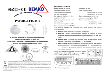 SPECYFIKACJA TECHNICZNA: PSF706-LED-MD Napięcie zasilania: 220-240V/AC Kąt detekcji: 180°/360° Częstotliwość zasilania: 50/60Hz Zakres wykrywania ruchu: Zakres regulacji natężenia światła: Montaż sufitowy: do 8m max 5lux, 15lux, 50lux, 2000 lux Montaż ścienny: do 15m max Czas załączenia: 10s, 90s, 3min, 10min Częstotliwość pracy czujnika: 5.8GHz Moc źródła: 16W/3,5W Maksymalna moc nadajnika: <0.2mW Wykrywalna prędkość ruchu: 0.6~1.5m/s Zalecana wysokość instalacji: Pobór mocy: 0.9W Montaż sufitowy: 2m~4m Funkcja przyciemienia/półcienia: ~3,5W Montaż ścienny: 1.5-3.5m Czas Funkcji przyciemnienia: 0s,30s,10min, +∞ Czujnik plafoniery PSF706-LED-MA wyposażony jest w cztery regulatory, które spełniają następujące funkcje: Detection Range - regulacja czułości sensora mikrofalowego Hold Time - regulacja czasu podtrzymania oświetlenia. W zależności od potrzeb użytkownika wartość czas załączenia można ustawić następująco: 10s, 90s, 3min, 10min PL Instrukcja - Plafoniera LED z mikrofalowym czujnikiem ruchu EN Instruction - Microwave LED Sensor Light CZ Návod - LED stropní svítidlo s pohybovým čidlem. Daylight Sensor - regulacja progu natężenia światła. Pozwala ustawić poziom natężenia w zależności od warunków pracy- 5, 15, 50, 2000 luxów RU Инструкция – Светильник с микроволновым LED датчикомдвижения Stand-by Period – Ustawienie czasu funkcji przyciemnienia/półcienia. Czas, w którym oprawa będzie świecić z 30% mocą po czasie Hold Time. „0” – oznacza braku funkcji +∞ - oznacza, że oprawa będzie działać w trybie przyciemnienia cały czas, do momentu wykrycia ruchu. UWAGA: Moc czujnika mikrofalowego jest <0,2mW , która w przybliżeniu jest równa 0,0002 mocy generowanej przez Rys 2. Rys 1. PARAMETRY CZUJNIKA MONTAŻ PLAFONIERY telefon komórkowy lub kuchenkę mikrofalowej. Rys 3. Podłączenie plafoniery PL: Wyprodukowano po 13 sierpnia 2005. Nie wyrzucać zużytych urządzeń elektrycznych i elektronicznych razem z odpadami komunalnymi, ze względu na obecność w sprzęcie niebezpiecznych dla środowiska substancji. Urządzenia te należy przekazać do punktu zbiórki w celu poddania recyklingowi. Informacja opunktach zbiórki dostępna jest u władz lokalnych jak i w siedzibie producenta. EN: Produced after 13th August 2005. Waste electrical products should not be disposed with household waste. Please recycle where facilities exist. Check with Your Local Authorityor retailer for recycling advice. RU: Произведено до 13 августа 2005. Не выбрасывать изпользованых электрических и электронических устройств вместе с бытовыми отходами с повода на наличие в уст ройствах опасных веществ для окружающей среды. Данное устройство необходимо передать в пункт сбора с целью дальнейшей переработки. Информация о пунктах сбора доступна в местных органах власти, а также от производителя. CZ: Vyrobeno po 13. srpna 2005. Nevyhazujte elektricke a elektronicke odpadky s komunálním odpadem, vzhledem k přítomnosti látek ohrožujících životní prostředí. Tato zařízení musí být předloženy do sběrného místa pro recyklaci. Informací o shromažďování odpau je k dispozici u místních úřadů, stejně jako u výrobce DE: nach dem 13. August 2005 produziert Elektroschrott sollte nicht mit dem Hausmüll entsorgt werden. Bitte recyceln soweit das möglich ist. Überprüfen Sie Ihre lokalen Behörden oder Einzelhändler bezüglich Rat der Wiederverwertung. SK: vyrobených po 13.srpen 2005. Odpadové elektronické výrobky nesmú byť nakladať s odpadom z domácností. Prosím recyklovať je k dispozícii zariadenie. Informujte sa u vojho obecného úradu alebo predajcu recykláciu radu. LT: produktų išleistų į rinką po 2005 m. rugpjūčio 13 d. Šis produktas negali būti išmestas su kitomis buitinėmis atliekomis.Prašome susisiekti su produkto pardavėju ar savivaldybės darbuotojais dėl informacijos, kur ir kaip priduoti neveikiantį prietaisą dėl antrinio perdirbimo. Rys. 4 Testowanie plafoniery ROZWIĄZYWANIE PROBLEMÓW Oświetlenie nie załącza się w ogóle: a. Sprawdź napięcie zasilania/bezpiecznik. b. Sprawdź czy napięcie zasilania jest zgodne ze specyfikacją techniczną Oświetlenie nie załącza się mimo ruchu w polu widzenia: a. Sprawdź ustawienia zasięgu czujnika. Poziom światła Poziom światła Poziom światła Oprawa wyłączy się po wystarczający, niewystarczający, niewystarczający, Oprawa nie załącza się Oprawa załącza się z 100%Oprawa świeci z 20% mocą upływie czasu stand-by mocą po wykryciu ruchu (opcjonalnie) po opuszczeniu period pomieszczenia INSTALACJA PLAFONIERY: Wyłączyć zasilanie za pomocą bezpiecznika. Odkręcić ramkę klosza od podstawy plafoniery, przekręcając ją w kierunku przeciwnym do kierunku ruchu wskazówek zegara, odkręcić śruby i otworzyć klosz. Przełożyć kabel przez otwór do prowadzenia przewodu zasilającego. Podłączyć pod zaciski N i L zasilanie 230V/50Hz. Zamontuj uchwyt mocujący do sufitu i przykręć oprawę. Załączyć zasilanie. Testowanie: b. Sprawdź temperaturę otoczenia. c. Sprawdź czy obiekt znajduję się w polu detekcji. d. Sprawdź zalecaną wysokość montażu. Oświetlenie po załączeniu świeci się i nie wyłącza się: a. W polu detekcji znajduję się ruchomy obiekt lub sygnał zakłócający. b. Sprawdź czas załączenia, prawdopodobnie ustawiony jest na max. c. Sprawdź zalecane napięcie zasilania. d. Sprawdź temperaturę otoczenia oprawy. Zakłócenia może powodować klimatyzacja, centralne ogrzewanie. The product adopts microwave LED se