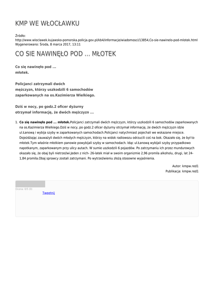KMP WE WŁOCŁAWKU Źródło: http://www.wloclawek.kujawsko-pomorska.policja.gov.pl/kb4/informacje/wiadomosci/13854,Co-sie-nawinelo-pod-mlotek.html Wygenerowano: Środa, 8 marca 2017, 13:11 CO SIE NAWINĘŁO POD ... MŁOTEK Co się nawinęło pod ... młotek. Policjanci zatrzymali dwóch mężczyzn, którzy uszkodzili 6 samochodów zaparkowanych na os.Kazimierza Wielkiego. Dziś w nocy, po godz.2 oficer dyżurny otrzymał informację, że dwóch mężczyzn ... 1. Co się nawinęło pod ... młotek.Policjanci zatrzymali dwóch mężczyzn, którzy uszkodzili 6 samochodów zaparkowanych na os.Kazimierza Wielkiego.Dziś w nocy, po godz.2 oficer dyżurny otrzymał informację, że dwóch mężczyzn idzie ul.Łanową i wybija szyby w zaparkowanych samochodach.Policjanci natychmiast pojechali we wskazane miejsce. Dojeżdżając zauważyli dwóch młodych mężczyzn, którzy na widok radiowozu odrzucili coś na bok. Okazało się, że był to młotek.Tym właśnie młotkiem panowie powybijali szyby w samochodach. Idąc ul.Łanową wybijali szyby przypadkowo napotkanym, zaparkowanym przy ulicy autach. W sumie uszkodzili 6 pojazdów. Po zatrzymaniu ich przez mundurowych okazało się, że obaj byli nietrzeźwi.Jeden z nich- 26-latek miał w swoim organizmie 2,96 promila alkoholu, drugi, lat 241,84 promila.Obaj sprawcy zostali zatrzymani. Po wytrzeźwieniu złożą stosowne wyjaśnienia. Autor: kmpw.red1 Publikacja: kmpw.red1 Ocena: 0/5 (0) Tweetnij