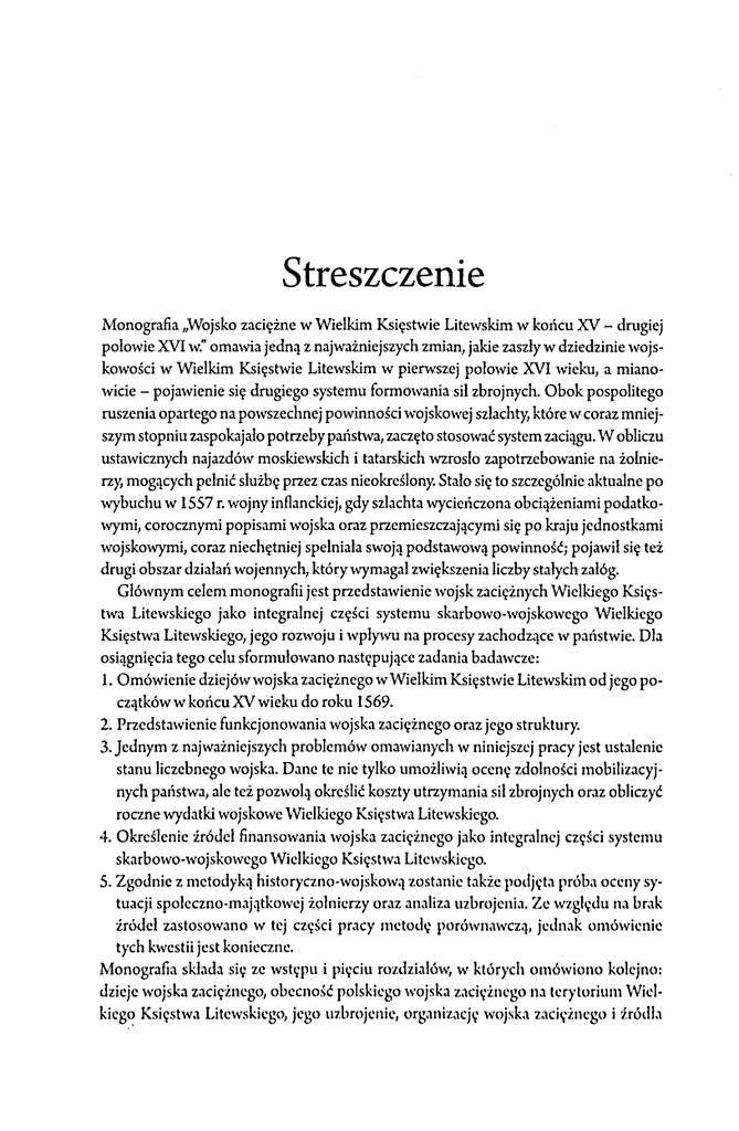 Streszczenie Monografia „Wojsko zaciężne w Wielkim Księstwie Litewskim w końcu XV - drugiej połowie XVI w." omawia jedną z najważniejszych zmian, jakie zaszły w dziedzinie wojskowości w Wielkim Księstwie Litewskim w pierwszej połowie XVI wieku, a mianowicie - pojawienie się drugiego systemu formowania sil zbrojnych. Obok pospolitego ruszenia opartego na powszechnej powinności wojskowej szlachty, które w coraz mniejszym stopniu zaspokajało potrzeby państwa, zaczęto stosować system zaciągu. W obliczu ustawicznych najazdów moskiewskich i tatarskich wzrosło zapotrzebowanie na żołnierzy, mogących pełnić służbę przez czas nieokreślony. Stało się to szczególnie aktualne po wybuchu w 1557 r. wojny inflanckiej, gdy szlachta wycieńczona obciążeniami podatkowymi, corocznymi popisami wojska oraz przemieszczającymi się po kraju jednostkami wojskowymi, coraz niechętniej spełniała swoją podstawową powinność; pojawił się też drugi obszar działań wojennych, który wymagał zwiększenia liczby stałych załóg. Głównym celem monografii jest przedstawienie wojsk zaciężnych Wielkiego Księstwa Litewskiego jako integralnej części systemu skarbowo-wojskowego Wielkiego Księstwa Litewskiego, jego rozwoju i wpływu na procesy zachodzące w państwie. Dla osiągnięcia tego celu sformułowano następujące zadania badawcze: 1. Omówienie dziejów wojska zaciężnego w Wielkim Księstwie Litewskim od jego początków w końcu XV wieku do roku 1569. 2. Przedstawienie funkcjonowania wojska zaciężnego oraz jego struktury. 3. Jednym z najważniejszych problemów omawianych w niniejszej pracy jest ustalenie stanu liczebnego wojska. Dane te nie tylko umożliwią ocenę zdolności mobilizacyjnych państwa, ale też pozwolą określić koszty utrzymania sil zbrojnych oraz obliczyć roczne wydatki wojskowe Wielkiego Księstwa Litewskiego. 4. Określenie źródeł finansowania wojska zaciężnego jako integralnej części systemu skarbowo-wojskowego Wielkiego Księstwa Litewskiego. 5. Zgodnie z metodyką historyczno-wojskową zostanie także podjęta próba oceny sytuacji spolcczno-majątkowej żołnierzy oraz analiza uzbrojenia. Ze względu na brak źródeł zastosowano w tej części pracy metodę porównawczą, jednak omówienie tych kwestii jest konieczne. Monografia składa się ze wstępu i pięciu rozdziałów, w których omówiono kolejno: dzieje wojska zaciężnego, obecność polskiego wojska zaciężnego na terytorium Wielkiego Księstwa Litewskiego, jego uzbrojenie, organizację wojska zaciężnego i źródła STRESZCZENIE 171 finansowania. Po analizie zebranego materialu badawczego sformułowano następujące wnioski: 1. W wyniku zmiany sytuacji geopolitycznej w końcu XV w. (wzrost potęgi Wielkiego Księstwa Moskiewskiego i wysuwanie roszczeń do słowiańskich ziem Wielkiego Księstwa Litewskiego, plaga najazdów tatarskich) system wojskowy Wielkiego Księstwa Litewskiego nie spełniał już warunków, jakie stawiała nowa sytuacja. Pospolite ruszenie sprawdzało się jedynie w krótkotrwałych kampaniach wojennych, tymczasem potrzebna byla stała ochrona pogranicza. W takich warunkach w Wielkim Księstwie Litewskim rozpoczęto formowanie wojsk zaciężnych - formacje te wykorzystywano już od dawna w Europie Zachodniej i sąsiednim Królestwie Polskim. 2. Zaistniała sytuacja wymagała podjęcia zdecydowanych działań, toteż za panowania Aleksandra Jagiellończyka zapotrzebowanie na wojsko zaciężne zaspokajano różnymi sposobami. Zaciągano na koszt dworu cudzoziemców, przyciągano pod chorągiew dworską miejscową szlachtę (dworzan), wynagradzaną nadaniami ziemi. Wykorzystywano także służebnych zarządców królewszczyzn, leżących na pograniczu (wojewody kijowskiego), na których utrzymanie jeszcze w czasach Aleksandra zaczęto przeznaczać pieniądze. W historiografii jest to nazywane dwoma prototypami wojska zaciężncgo. W czasach Zygmunta Starego miejscowym szlachcicom służącym pod chorągwią dworską zaczęto płacić żołd (pierwszy znany przypadek w 1514 г.), nazywając ich pieniężnymi dworzanami. Później zaczęto ich używać również do ochrony pogranicza. W 1524 r. na obręża państwa wysiano 2000-3000 pieniężnych dworzan. W aktach skarbowych pieniężni dworzanie wspominani są jeszcze w 1535 r. Wykorzystywanie dworzan świadczyłoby o tym, że na pograniczu brakowało żołnierzy zaciężnych. Podczas oblężenia Staroduba po stronie Wielkiego Księstwa Litewskiego mogło walczyć około 2000 takich żołnierzy. W pracy postawiono hipotezę, że o właściwej armii zaciężnej w Wielkim Księstwie Litewskim można mówić od 1544 г., gdy na pomoc Królestwu Polskiemu obiecano przysłać 4000 zaciężnych. W I fazie wojny inflanckiej wojsko zaciężne było już całkowicie sformowane i przynajmniej częściowo utworzone z miejscowych mieszkańców. 3. W ciągu całego badanego okresu brak wojska zaciężnego w Wielkim Księstwie Litewskim uzupełniano zaciągiem żołnierzy w Królestwie Polskim. Szczególnie duże znaczenie mieli ci żołnierze przed wybuchem wojny inflanckiej. WI fazie tego konfliktu chorągwie dowodzone przez polskich rotmistrzów stanowiły około polowy wszystkich zaciężnych. 4. Wojsko zaciężne było utworzone z rot jazdy i piechoty. Wielkość roty najczęściej wahała się od 100 do 200 żołnierzy. Dowodzili nimi rotmistrze, w razie potrzeby zastępowali icli porucznicy. Roty składały się z pocztów. Na ich czele stali towarzysze, a w rotach pieszych - dziesiętnicy. Zaciąg rozpoczyna! się od wystawienia listów przypowiednich, w których były określone warunki służby. Wówczas rotmistrz uzyskiwał prawo do formowania roty. Żołnierzy zaciągano na kwartał lub półrocze. 172 LUK SAMDOMOJI KARIUOMENE XV A. PADAIGOJE - XVI A. ANTROĮO|E PUSĖ)E W pierwszej połowie XVI w. stawka żołdowa wynosiła około 1,4 kopy groszy dla jednego jezdnego za kwartał i około 1 ko