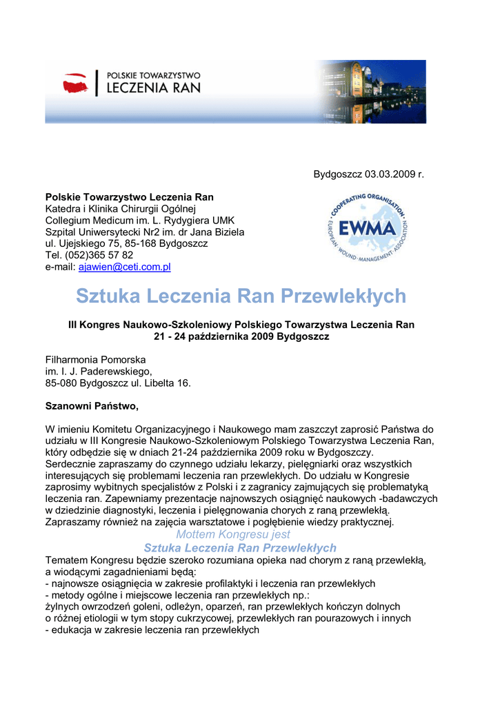 Bydgoszcz 03.03.2009 r. Polskie Towarzystwo Leczenia Ran Katedra i Klinika Chirurgii Ogólnej Collegium Medicum im. L. Rydygiera UMK Szpital Uniwersytecki Nr2 im. dr Jana Biziela ul. Ujejskiego 75, 85-168 Bydgoszcz Tel. (052)365 57 82 e-mail: [email protected] Sztuka Leczenia Ran Przewlekłych III Kongres Naukowo-Szkoleniowy Polskiego Towarzystwa Leczenia Ran 21 - 24 października 2009 Bydgoszcz Filharmonia Pomorska im. I. J. Paderewskiego, 85-080 Bydgoszcz ul. Libelta 16. Szanowni Państwo, W imieniu Komitetu Organizacyjnego i Naukowego mam zaszczyt zaprosić Państwa do udziału w III Kongresie Naukowo-Szkoleniowym Polskiego Towarzystwa Leczenia Ran, który odbędzie się w dniach 21-24 października 2009 roku w Bydgoszczy. Serdecznie zapraszamy do czynnego udziału lekarzy, pielęgniarki oraz wszystkich interesujących się problemami leczenia ran przewlekłych. Do udziału w Kongresie zaprosimy wybitnych specjalistów z Polski i z zagranicy zajmujących się problematyką leczenia ran. Zapewniamy prezentacje najnowszych osiągnięć naukowych -badawczych w dziedzinie diagnostyki, leczenia i pielęgnowania chorych z raną przewlekłą. Zapraszamy również na zajęcia warsztatowe i pogłębienie wiedzy praktycznej. Mottem Kongresu jest Sztuka Leczenia Ran Przewlekłych Tematem Kongresu będzie szeroko rozumiana opieka nad chorym z raną przewlekłą, a wiodącymi zagadnieniami będą: - najnowsze osiągnięcia w zakresie profilaktyki i leczenia ran przewlekłych - metody ogólne i miejscowe leczenia ran przewlekłych np.: żylnych owrzodzeń goleni, odleżyn, oparzeń, ran przewlekłych kończyn dolnych o różnej etiologii w tym stopy cukrzycowej, przewlekłych ran pourazowych i innych - edukacja w zakresie leczenia ran przewlekłych - modele opieki nad chorym z raną przewlekłą Prosimy o nadsyłanie propozycji prac. Najbardziej wartościowe i ciekawe prace zostaną wybrane przez Komitet Naukowy do prezentacji podczas sesji plenarnych i satelitarnych. Wierzymy, że Kongres będzie doskonałą okazją nie tylko do poszerzenia wiedzy, ale również okazją do wymiany wzajemnych doświadczeń i integracji działań zespołów sprawujących opiekę nad chorym z raną przewlekłą. Serdecznie zapraszam do Bydgoszczy Prof. dr hab. Arkadiusz Jawień Przewodniczący Komitetu Naukowego Dr hab. Maria T. Szewczyk Przewodnicząca Komitetu Organizacyjnego Ramowy program kongresu: Dzień 1 - 21.10.2009 15.00 - 19.00 Rejestracja uczestników konferencji 18.00 - Otwarcie Kongresu, koncert i koktajl powitalny dla wszystkich uczestników Dzień 2 - 22.10.2009 09.00 -15.30 Sesje plenarne i sympozja 13.00 - 14.00 Lunch 16.00 - 19.00 Walne Zebranie sprawozdawczo-wyborcze członków PTLR 20.00 - Bankiet. Dzień 3 - 23.10.2009 09.00 -18.00 Sesje plenarne, sympozja i warsztaty Dzień 4 - 24.10.2009 09.00 -14.00 Sesje plenarne i sympozja 14.00 Zamknięcie obrad. Komitet Organizacyjny: Przewodniczący: Dr hab. Maria T. Szewczyk - Sekretarz PTLR Członkowie: Arkadiusz Jawień Maciej Sopata Marcin Kaźmierski Maciej Koselak Anna Sobieszek-Kundro Katarzyna Cierzniakowska Anna Baron Anna Górka Paulina Mościcka Elżbieta Hancke Anna Łabuńska Justyna Cwajda-Białasik Maciej Świtoński Paweł Brazis Radosław Piotrowicz Bartosz Fórmankiewicz Michał Miszewski Anna Małkowska Komitet Naukowy: Przewodniczący: Prof. Arkadiusz Jawień - Prezes PTLR Członkowie: Prof. Małgorzata Bulanda Prof. Andrzej Dorobisz Prof. Marcin Gabriel Prof. Wiesław Gliński Prof. Eugenia Gospodarek Dr Grażyna Kruk-Kupiec Prof. Kornelia Kędziora-Kornatowska Prof. Marek Kucharzewski Prof. Jacek Łuczak Prof. Wacław Majewski Prof. Marek Maruszyński Prof. Grzegorz Oszkinis Prof. Waldemar Placek Prof. Jacek Puchała Prof. Zbigniew Rybak Prof. Walerian Staszkiewicz Prof. Piotr Szyber Prof. Maria T. Szewczyk Prof. Wojciech Witkiewicz Prof. Krzysztof Ziaja Ważne daty: 01.06.2009 - termin nadsyłania streszczeń, email: [email protected] 31.08.2009 - termin potwierdzenia przyjęcia pracy i kwalifikacji do prezentacji plakatu 1.09.2009 - termin nadsyłania zgłoszenia uczestnictwa i uiszczenia opłaty zjazdowej 31.08.2009 - termin rezerwacji hoteli przez stronę: www.caad.pl 21.10.2009 - rozpoczęcie konferencji Opłata konferencyjna: Członkowie PTLR i PTF: do 30.06.2009: lekarze - 300 PLN, pielęgniarki - 150 PLN po 30.06.2009: lekarze - 400 PLN, pielęgniarki - 250 PLN Pozostali uczestnicy: do 30.06.2009: lekarze - 450 PLN, pielęgniarki - 200 PLN po 30.06.2009: lekarze - 500 PLN, pielęgniarki - 300 PLN Osoby towarzyszące: 250 PLN Opłata konferencyjna obejmuje: - wstęp na sesje plenarne, sympozja, warsztaty, wystawę - teczki z materiałami konferencyjnymi - przerwy kawowe i lunch - udział w koktajlu powitalnym wraz z programem towarzyszącym Opłata dla osoby towarzyszącej obejmuje: - wstęp na sesje plenarne, sympozja, warsztaty, wystawę - przerwy kawowe i lunch - udział w koktajlu powitalnym wraz z programem towarzyszącym Wpłatę należy dokonać na konto PTLR nr 741160 2202 0000 0000 3978 9745 z dopiskiem: III Kongres PTLR Rejestracja: 1.Rejestracja jest możliwa przez stronę www.caad.pl 2.Rejestracja faxem na numer: CAAD Sp. z o.o. 061 8720340 3.Rejestracja listem na adres: KKI Sp. z o. o. (CAAD Corporation) Os. Stare Żegrze 112 61-249 Poznań Zgłoszenie bezpośrednie poprzez link http://www.caad.com.pl/ptlr_formularz2009/ Zgłoszenie do wydruku w załączniku PDF