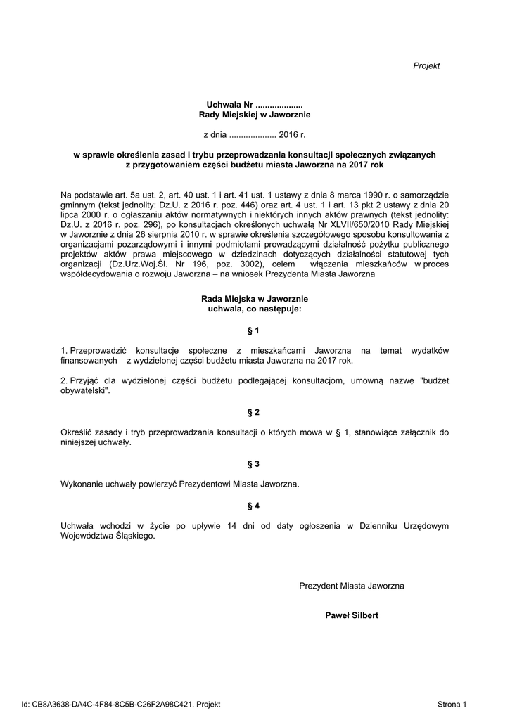 Projekt Uchwała Nr .................... Rady Miejskiej w Jaworznie z dnia .................... 2016 r. w sprawie określenia zasad i trybu przeprowadzania konsultacji społecznych związanych z przygotowaniem części budżetu miasta Jaworzna na 2017 rok Na podstawie art. 5a ust. 2, art. 40 ust. 1 i art. 41 ust. 1 ustawy z dnia 8 marca 1990 r. o samorządzie gminnym (tekst jednolity: Dz.U. z 2016 r. poz. 446) oraz art. 4 ust. 1 i art. 13 pkt 2 ustawy z dnia 20 lipca 2000 r. o ogłaszaniu aktów normatywnych i niektórych innych aktów prawnych (tekst jednolity: Dz.U. z 2016 r. poz. 296), po konsultacjach określonych uchwałą Nr XLVII/650/2010 Rady Miejskiej w Jaworznie z dnia 26 sierpnia 2010 r. w sprawie określenia szczegółowego sposobu konsultowania z organizacjami pozarządowymi i innymi podmiotami prowadzącymi działalność pożytku publicznego projektów aktów prawa miejscowego w dziedzinach dotyczących działalności statutowej tych organizacji (Dz.Urz.Woj.Śl. Nr 196, poz. 3002), celem włączenia mieszkańców w proces współdecydowania o rozwoju Jaworzna – na wniosek Prezydenta Miasta Jaworzna Rada Miejska w Jaworznie uchwala, co następuje: §1 1. Przeprowadzić konsultacje społeczne z mieszkańcami Jaworzna na finansowanych z wydzielonej części budżetu miasta Jaworzna na 2017 rok. temat wydatków 2. Przyjąć dla wydzielonej części budżetu podlegającej konsultacjom, umowną nazwę "budżet obywatelski". §2 Określić zasady i tryb przeprowadzania konsultacji o których mowa w § 1, stanowiące załącznik do niniejszej uchwały. §3 Wykonanie uchwały powierzyć Prezydentowi Miasta Jaworzna. §4 Uchwała wchodzi w życie po upływie 14 dni od daty ogłoszenia w Dzienniku Urzędowym Województwa Śląskiego. Prezydent Miasta Jaworzna Paweł Silbert Id: CB8A3638-DA4C-4F84-8C5B-C26F2A98C421. Projekt Strona 1 Załącznik do Uchwały Nr .................... Rady Miejskiej w Jaworznie z dnia .................... 2016r. ZASADY I TRYB PRZEPROWADZANIA KONSULTACJI SPOŁECZNYCH Z MIESZKAŃCAMI JAWORZNA NA TEMAT WYDATKÓW FINANSOWANYCH Z BUDŻETU OBYWATELSKIEGO NA 2017 ROK Konsultacje społeczne z mieszkańcami Jaworzna na temat wydatków finansowanych z budżetu obywatelskiego na 2017 rok przeprowadza się w celu włączenia mieszkańców w proces współdecydowania o miejskich przedsięwzięciach i uczestniczenia w projektowaniu wydatków na ich realizację. W ramach budżetu obywatelskiego możliwa będzie realizacja zadań własnych gminy, których katalog precyzują ustawy o samorządzie gminnym i powiatowym, o które zawnioskują i wybiorą w drodze głosowania sami mieszkańcy. ROZDZIAŁ I POSTANOWIENIA OGÓLNE 1. Zasady i tryb przeprowadzania konsultacji społecznych z mieszkańcami Jaworzna na temat wydatków finansowanych z budżetu obywatelskiego na 2017 rok, zwane dalej „Zasadami” regulują kwestie związane z organizacją naboru wniosków mieszkańców, ich weryfikacją oraz wyborem zadań publicznych, pochodzących z wniosków mieszkańców, finansowanych z części budżetu miasta na 2017 rok. 2. Użyte w Zasadach pojęcia oznaczają: 1) miasto – Jaworzno – miasto na prawach powiatu, 2) radni – radni Rady Miejskiej w Jaworznie, 3) Prezydent – Prezydent Miasta Jaworzna, 4) Urząd – Urząd Miejski w Jaworznie, 5) mieszkaniec – osoba zamieszkująca na terenie miasta Jaworzna, 6) budżet obywatelski – część budżetu miasta przeznaczona do finansowania zadań publicznych pochodzących z wniosków mieszkańców, 7) zadanie publiczne – zadanie własne gminy, określone w ustawach o samorządzie gminnym i powiatowym, realizowane na terenach do których gmina posiada tytuł prawny – pod warunkiem zapewnienia nieograniczonego dostępu do terenu, z wyłączeniem inwestycji i remontów na terenie placówek oświatowo-wychowawczych oraz budynków gminnych, możliwe do wykonania w jednym roku budżetowym, zgodne z planem zagospodarowania przestrzennego, nie kolidujące z założeniami wynikającymi z planów i programów dotyczących rozwoju miasta, tj. nie ujęte w budżecie miasta, o istotnej wartości społecznej, tj. dedykowane i zaspokajające potrzeby danej społeczności, co do którego istnieje możliwość zabezpieczania w budżecie ewentualnych kosztów, które zadanie będzie generowało w przyszłości, 8) obszar konsultacyjny – teren, który posiada przyporządkowany wykaz ulic, mieszczący się w granicach administracyjnych miasta Jaworzna, 9) zespół – zespół ds. budżetu obywatelskiego – osoby powołane przez Prezydenta do analizy wniosków mieszkańców pod kątem formalnym oraz ustalenia wyników głosowania, 10) lista rankingowa – lista projektów rekomendowanych do realizacji, stworzona na podstawie wyników głosowania mieszkańców, ułożona w kolejności od projektu, który otrzymał największą liczbę głosów, 11) www.jbo.jaworzno.pl – strona internetowa, prowadzona przez miasto, będąca kompendium wiedzy na temat budżetu obywatelskiego, na bieżąco rejestrująca proces typowania i realizacji zadań w ramach budżetu obywatelskiego. 3. Konsultacje społeczne z mieszkańcami Jaworzna na temat zadań finansowanych z budżetu obywatelskiego są prowadzone na dwóch płaszczyznach: ogólnomiejskiej oraz lokalnej, uwzględniającej podział miasta na 20 obszarów konsultacyjnych, zgodnie z wykazem stanowiącym załącznik nr 1 do Zasad. 4. Propozycje zadań publicznych zgłaszanych w ramach budżetu obywatelskiego dotyczą: 1) zadań inwestycyjnych (remonty, adaptacje, budowa nowych obiektów), związanych z infrastrukturą techniczną, sportowo-rekreacyjną, z wyłączeniem lokowania ich na terenach placówek oświatowowychowawczych oraz budynków gminnych, pod warunkiem braku tego typu inwestycji w najbliższym otoczeniu, 2) zadań nieinwestycyjnych z zakresu: edukacji, zdrowia, kultury, sportu, ekologii i ochrony środowiska, obejmujących działania typu: warsztaty, szkolenia, kursy, organizacja imp