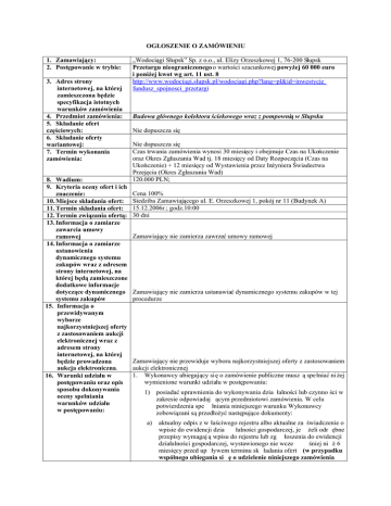 OGŁOSZENIE O ZAMÓWIENIU 1. Zamawiający: 2. Postępowanie w trybie: 3. Adres strony internetowej, na której zamieszczona będzie specyfikacja istotnych warunków zamówienia 4. Przedmiot zamówienia: 5. Składanie ofert częściowych: 6. Składanie oferty wariantowej: 7. Termin wykonania zamówienia: 8. Wadium: 9. Kryteria oceny ofert i ich znaczenie: 10. Miejsce składania ofert: 11. Termin składania ofert: 12. Termin związania ofertą: 13. Informacja o zamiarze zawarcia umowy ramowej 14. Informacja o zamiarze ustanowienia dynamicznego systemu zakupów wraz z adresem strony internetowej, na której będą zamieszczone dodatkowe informacje dotyczące dynamicznego systemu zakupów 15. Informacja o przewidywanym wyborze najkorzystniejszej oferty z zastosowaniem aukcji elektronicznej wraz z adresem strony internetowej, na której będzie prowadzona aukcja elektroniczna. 16. Warunki udziału w postępowaniu oraz opis sposobu dokonywania oceny spełniania warunków udziału w postępowaniu: „Wodociągi Słupsk” Sp. z o.o., ul. Elizy Orzeszkowej 1, 76-200 Słupsk Przetargu nieograniczonego o wartości szacunkowej powyżej 60 000 euro i poniżej kwot wg art. 11 ust. 8 http://www.wodociagi.slupsk.pl/wodociagi.php?lang=pl&id=inwestycje_ fundusz_spojnosci_przetargi Budowa głównego kolektora ściekowego wraz z pompownią w Słupsku Nie dopuszcza się Nie dopuszcza się Czas trwania zamówienia wynosi 30 miesięcy i obejmuje Czas na Ukończenie oraz Okres Zgłaszania Wad tj. 18 miesięcy od Daty Rozpoczęcia (Czas na Ukończenie) + 12 miesięcy od Wystawienia przez Inżyniera Świadectwa Przejęcia (Okres Zgłaszania Wad) 120.000 PLN; Cena 100% Siedziba Zamawiającego ul. E. Orzeszkowej 1, pokój nr 11 (Budynek A) 15.12.2006r.; godz.10:00 30 dni Zamawiający nie zamierza zawrzeć umowy ramowej Zamawiający nie zamierza ustanawiać dynamicznego systemu zakupów w tej procedurze Zamawiający nie przewiduje wyboru najkorzystniejszej oferty z zastosowaniem aukcji elektronicznej 1. Wykonawcy ubiegający się o zamówienie publiczne musz ą spełniać ni żej wymienione warunki udziału w postępowaniu: 1) posiadać uprawnienia do wykonywania dzia łalności lub czynno ści w zakresie odpowiadaj ącym przedmiotowi zamówienia. W celu potwierdzenia spe łniania niniejszego warunku Wykonawcy zobowiązani są przedłożyć następujące dokumenty: a) aktualny odpis z w łaściwego rejestru albo aktualne za świadczenie o wpisie do ewidencji dzia łalności gospodarczej, je żeli odr ębne przepisy wymagaj ą wpisu do rejestru lub zg łoszenia do ewidencji działalności gospodarczej, wystawionego nie wcze śniej ni ż 6 miesięcy przed up ływem terminu sk ładania ofert (w przypadku wspólnego ubiegania si ę o udzielenie niniejszego zamówienia przez dwóch lub wi ęcej Wykonawców w ofercie musz złożone przedmiotowe dokumenty dla każdego z nich) ą by ć b) zaświadczenia o posiadaniu uprawnie ń budowlanych oraz o członkostwie w izbach samorz ądowych architektów lub in żynierów budownictwa dla Kierowników Budowy i Projektantów wymienionych w pkt. 9.1.3) IDW. 2) nie podlegać wykluczeniu z postępowania na podstawie art. 24 ustawy z dnia 29 stycznia 2004 r. Prawo zamówie ń publicznych (Dz. U. Nr 19, poz. 177 z późn. zm). W celu potwierdzenia spełniania niniejszego warunku Wykonawcy zobowi ązani s ą przed łożyć nast ępujące dokumenty (w przypadku wspólnego ubiegania si ę o udzielenie niniejszego zamówienia przez dwóch lub wi ęcej Wykonawców w ofercie muszą być złożone przedmiotowe dokumenty dla każdego z nich), a) aktualna informacja z Krajowego Rejestru Karnego w zakresie określonym w art. 24 ust. 1 pkt 4 - 8 ustawy Pzp, wystawiona nie wcześniej niż 6 miesięcy przed upływem terminu składania ofert, b) aktualna informacja z Krajowego Rejestru Karnego w zakresie określonym w art. 24 ust. 1 pkt 9 ustawy Pzp , wystawiona nie wcześniej niż 6 miesięcy przed upływem terminu składania ofert, c) aktualne za świadczenia w łaściwego naczelnika urz ędu skarbowego oraz w łaściwego oddzia łu Zak ładu Ubezpiecze ń Spo łecznych lub Kasy Rolniczego Ubezpieczenia Spo łecznego potwierdzaj ące odpowiednio, że Wykonawca nie zalega z op łacaniem podatków, opłat oraz sk ładek na ubezpieczenie zdrowotne i spo łeczne, lub zaświadczenia, że uzyska ł przewidziane prawem zwolnienie, odroczenie lub rozłożenie na raty zaległych płatności lub wstrzymanie w ca łości wykonania decyzji w łaściwego organu, wystawionych nie wcześniej niż 3 miesiące przed upływem terminu składania ofert; 3) posiadać niezb ędną wiedz ę i do świadczenie oraz dysponowa ć potencjałem technicznym i osobami zdolnymi do wykonania niniejszego zamówienia. W szczególno ści Wykonawca musi spe łniać następujące warunki (w przypadku wspólnego ubiegania si ę dwóch lub wi ęcej Wykonawców o udzielenie niniejszego zamówienia, oceniany b ędzie ich łączny potencja ł techniczny i kadrowy oraz łączne kwalifikacje i doświadczenie). a) posiadać przeciętne zatrudnienie w okre sie ostatnich trzech lat (tj. w latach 2003, 2004, 2005), a je żeli okres prowadzenia działalności jest krótszy w tym okresie, w wysokości co najmniej 30 pracowników. W celu potwierdzenia spe łniania niniejszego warunku Wykonawcy (każdy z Wykonawców składających ofertę wspólną) zobowiązani są przedłożyć Informacj ę na temat przeci ętnej liczby zatrudnionych pracowników sporz ądzoną wed ług wzoru stanowi ącego załącznik nr 3 do IDW, b) posiadać przeci ętną liczebno ść personelu kierowniczego w okresie ostatnich trzech lat (tj. w latach 2003, 2004, 2005) , a je żeli okres prowadzenia działalności jest krótszy w tym okresie, w wysokości nie mniejszej niż 3 osoby. W celu potwierdzenia spe łniania niniejszego warunku Wykonawcy (każdy z Wykonawców składających ofertę wspólną) zobowiązani są przedłożyć Informacj ę na temat przeci ętnej liczebno 