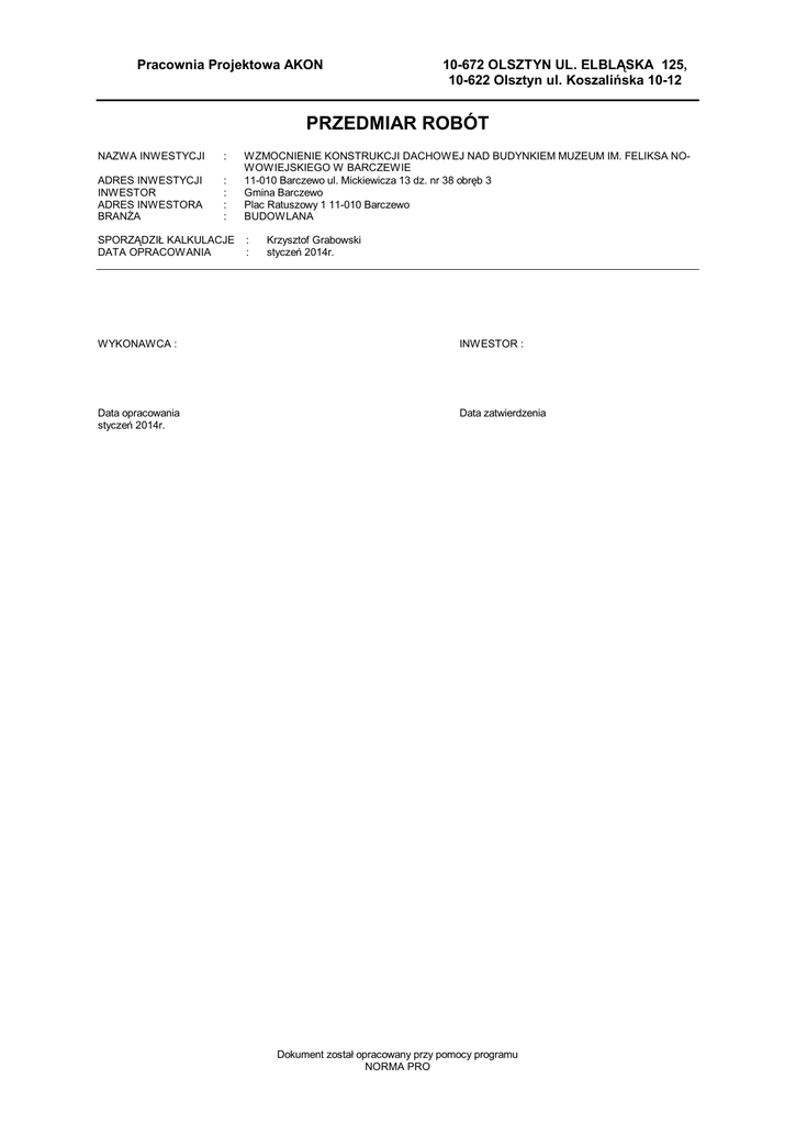 Pracownia Projektowa AKON 10-672 OLSZTYN UL. ELBL SKA 125, 10-622 Olsztyn ul. Koszali ska 10-12 PRZEDMIAR ROBÓT NAZWA INWESTYCJI : ADRES INWESTYCJI INWESTOR ADRES INWESTORA BRAN A : : : : SPORZ DZI KALKULACJE DATA OPRACOWANIA WZMOCNIENIE KONSTRUKCJI DACHOWEJ NAD BUDYNKIEM MUZEUM IM. FELIKSA NOWOWIEJSKIEGO W BARCZEWIE 11-010 Barczewo ul. Mickiewicza 13 dz. nr 38 obr b 3 Gmina Barczewo Plac Ratuszowy 1 11-010 Barczewo BUDOWLANA : : Krzysztof Grabowski stycze 2014r. WYKONAWCA : INWESTOR : Data opracowania stycze 2014r. Data zatwierdzenia Dokument zosta opracowany przy pomocy programu NORMA PRO Muzeum - REMONT DACHU.PRD PRZEDMIAR Lp. Podstawa Opis i wyliczenia j.m. Poszcz Razem WZROST ATRAKCYJNO CI TURYSTYCZNEJ GMINY BARCZEWO POPRZEZ RENOWACJ KLUCZOWYCH OBIEKTÓW DZIEDZICTWA KULTUROWEGO - MUZEUM IM. FELIKSA NOWOWIEJSKIEGO W BARCZEWIE 1 Roboty rozbiórkowe 1 KNR 4-01 Rozbiórka pokrycia z dachówki m2 d.1 0508-03 110.12/cos(26.58)+54.83/cos(39.00) m2 193.687 RAZEM 193.687 2 KNR 4-04 Przygotowanie dachówki karpiówki z rozbiórki do u ytku szt. d.1 1004-01 193.687<m2>*16.16<szt./m2> szt. 3 129.982 RAZEM 3 129.982 3 KNR 4-04 Rozebranie konstrukcji wi b dachowych - o acenie dachu m2 d.1 0403-03 110.12/cos(26.58)+54.83/cos(39.00) m2 193.687 RAZEM 193.687 4 KNR 4-04 Rozebranie konstrukcji wi b dachowych - deskowanie dachu na styk m2 d.1 0403-02 110.12/cos(26.58)+54.83/cos(39.00) m2 193.687 RAZEM 193.687 5 Demonta ocieplenia z we ny mineralnej kpl d.1 kalk. w asna 1 kpl 1.000 RAZEM 1.000 6 KNR 4-04 Rozebranie rynien z blachy nie nadaj cej si do u ytku m d.1 0506-05 5.45+4.74+4.50+18.16+1.78+11.17 m 45.800 RAZEM 45.800 7 KNR 4-04 Rozebranie rur z blachy nie nadaj cej si do u ytku m d.1 0506-06 8.00*2 m 16.000 RAZEM 16.000 8 KNR 4-01 Rozebranie elementów stropów drewnianych - podsufitek z desek otynkowa- m2 d.1 0429-04 nych 155.00 m2 155.000 RAZEM 155.000 9 KNR 4-01 Wywiezienie elementów zdemontowanych samochodami skrzyniowymi na m3 d.1 0108-09 odleg 5 km 0108-10 analogia 12.00 m3 12.000 RAZEM 12.000 10 Op ata za sk adowanie odpadów na wysypisku m3 d.1 kalk. w asna poz.9 m3 12.000 RAZEM 12.000 2 Konstrukcja i pokrycie dachu 11 Naprawa istniej cych kominów, naprawa tynków i czapek kominowych kpl d.2 kalk. w asna 2 kpl 2.000 RAZEM 2.000 12 KNNR-W 3 Wymiana elementów konstrukcji drewnianej dachu, które uleg y uszkodzeniu m2 po . d.2 0501-05 biologicznemu (Przyjmuje si do 10% wymiany istniej cej konstrukcji dachu) analogia 110.12/cos(26.58)+54.83/cos(39.00) m2 po . 193.687 RAZEM 193.687 13 KNR 19-01 Uzupe nienia ubytków w drewnie lub naprawa cz ci zniszczonych - poszt. d.2 0437-03 wierzchnia p aska do 0.05 m2 20 szt. 20.000 RAZEM 20.000 14 KNR 19-01 Uzupe nienia ubytków w drewnie lub naprawa cz ci zniszczonych - poszt. d.2 0437-01 wierzchnia p aska do 0.01 m2 30 szt. 30.000 RAZEM 30.000 15 KNR 2-02 Krokwie zwyk e, d ugo do 4.5 m przekrój poprzeczny drewna do 180 cm2 m3 d.2 0408-03 z tarcicy nasyconej <Krokiew K2>0.144 m3 0.144 <Krokiew K3>0.307 m3 0.307 <Krokiew K6>0.121 m3 0.121 RAZEM 0.572 16 KNR 2-02 Krokwie zwyk e, d ugo ponad 4.5 m przekrój poprzeczny drewna do 180 m3 d.2 0408-05 cm2 z tarcicy nasyconej <Krokiew K4>0.104 m3 0.104 <Krokiew K5>0.086 m3 0.086 -2- Norma PRO Wersja 4.25 Licencja: 20369 dla AKON Muzeum - REMONT DACHU.PRD Lp. PRZEDMIAR Podstawa 17 KNR 2-02 d.2 0408-01 18 KNR 2-02 d.2 0409-03 19 KNR 2-02 d.2 0407-06 Opis i wyliczenia j.m. Miecze i zastrza y przekrój poprzeczny drewna do 180 cm2 z tarcicy nasyconej <Zastrza Z2>0.202 <Zastrza Z3>0.069 m3 Nadbitki przekrój poprzeczny drewna do 180 cm2 z tarcicy nasyconej m3 <Nak adka N1>0.232 <Nak adka N2>0.106 <Nak adka N3>0.054 m3 m3 m3 m3 m3 upy o d ugo ci ponad 2 m - przekrój poprzeczny drewna ponad 180 cm2 z m3 tarcicy nasyc. drew. <S up S2>0.104 m3 drew. Poszcz RAZEM 0.202 0.069 RAZEM 0.271 0.232 0.106 0.054 RAZEM 0.392 0.104 RAZEM 20 KNNR-W 3 Dwukrotna impregnacja grzybobójcza drewna metod smarowania drewna d.2 0504-04 preparatami solowymi - bale i kraw dziaki <Elementy nowe konstrukcji dachu>(0.12*2+0.14*2)*34.05+0.12*4*18.82+ 0.14*4*20.00+0.18*4*3.21 <Elementy istniej ce lub wymieniane konstrukcji dachu>230.00 m2 21 KNR 2-02 d.2 0410-01 m2 22 KNR 2-02 d.2 0410-03 23 KNR 2-02 d.2 0501-01 z.sz. 5.1. 9908 Deskowanie po aci dachowych z tarcicy nasyconej (Przyj to wymian 25% deskowania) 110.12/cos(26.58)+54.83/cos(39.00) 25 KNR 2-02 d.2 0507-02 26 KNR 2-02 d.2 0509-03 27 KNR 2-02 d.2 0511-02 40.251 m2 230.000 RAZEM 270.251 193.687 RAZEM 193.687 193.687 RAZEM 193.687 193.687 RAZEM 193.687 193.687 RAZEM 193.687 18.240 RAZEM 18.240 45.800 RAZEM 45.800 16.000 RAZEM 16.000 1.000 RAZEM 1.000 1.000 RAZEM 1.000 6.000 RAZEM 6.000 25.000 RAZEM 25.000 m2 u drewnianym jednowarstwowo Nachylenie m2 m2 110.12/cos(26.58)+54.83/cos(39.00) 24 KNR 2-02 d.2 0504-02 Pokrycie dachów dachówk zak adkowa ceramiczna (80% dachówki z dem2 monta u, 20% dachówki nowe dostosowane kolorem i kszta tem do istniej cych) 110.12/cos(26.58)+54.83/cos(39.00) m2 Obróbki przy szeroko ci w rozwini ciu ponad 25 cm- z blachy z cynku m2 45.80*0.30+4.50 m2 Rynny dachowe pó okr e o r. 12 cm- z blachy z cynku m 5.45+4.74+4.50+18.16+1.78+11.17 m Rury spustowe okr m e o r. 10 cm- z blachy z cynku 8.00*2 m 3 Tynki i ok adziny 28 Demonta cz ci instalacji elektrycznych, o wietlenia i innych, wynik ych ze kpl d.3 kalk. w asna wzgl du na prowadzone prace remontowe dachu w Muzeum 1 kpl 29 Odtworzenie uszkodzonych lub rozbieranych w czasie wzmacniania i remon- kpl d.3 kalk. w asna tu dachu instalacji elektrycznych, o wietlenia i inne zwi zane z ww. pracami 1 kpl 30 KNR 4-01 d.3 0304-04 analogia 0.104 m2 acenie po aci dachowych atami 38x50 mm,o rozstawie 16-24 cm z tarcicy m2 nasyconej 110.12/cos(26.58)+54.83/cos(39.00) m2 Pokrycie dachów pap na pod ponad 27 %. Razem 0.190 Podmurowanie cian w celu uzyskania miejsc podparcia belek drewnianych msc konstrukcji dachu 6 msc 31 Naprawa rys, sp ka i ubytków w spoinach cian konstrukcyjnych przy pod.3 kalk. w asna mocy zaprawy mo