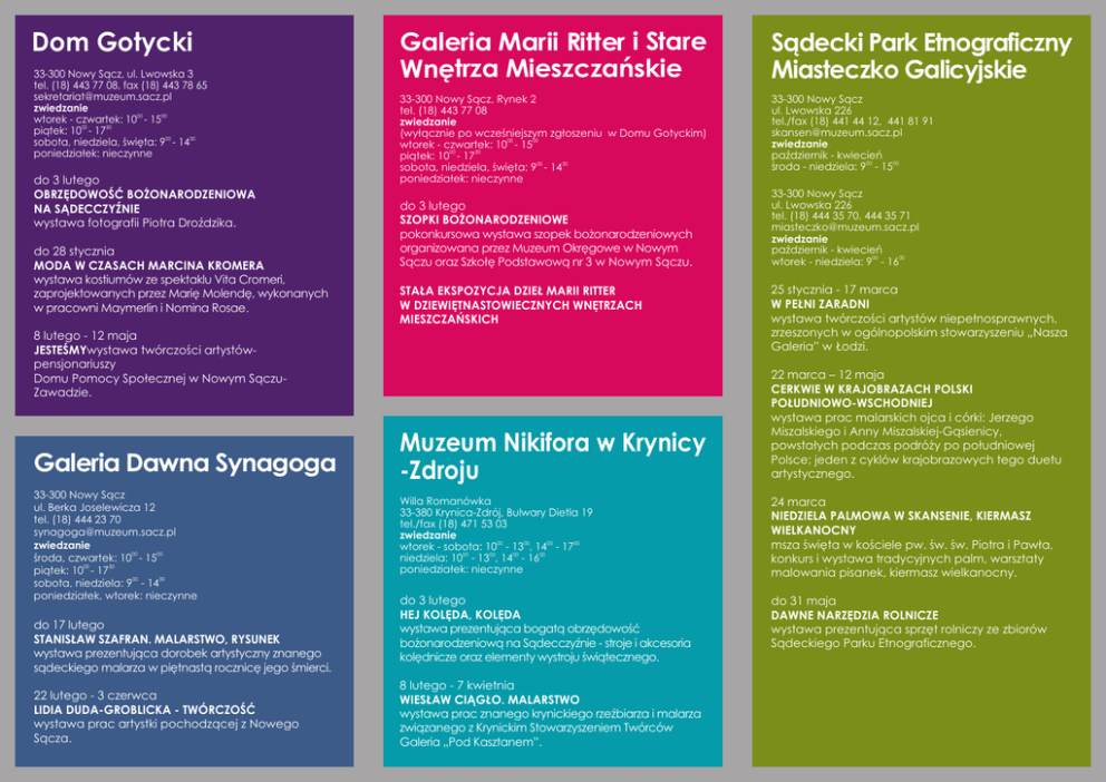 Dom Gotycki 33-300 Nowy Sącz, ul. Lwowska 3 tel. (18) 443 77 08, fax (18) 443 78 65 [email protected] zwiedzanie wtorek - czwartek: 1000 - 1500 piątek: 1000 - 1730 sobota, niedziela, święta: 900 - 1430 poniedziałek: nieczynne do 3 lutego OBRZĘDOWOŚĆ BOŻONARODZENIOWA NA SĄDECCZYŹNIE wystawa fotografii Piotra Droździka. do 28 stycznia MODA W CZASACH MARCINA KROMERA wystawa kostiumów ze spektaklu Vita Cromeri, zaprojektowanych przez Marię Molendę, wykonanych w pracowni Maymerlin i Nomina Rosae. Galeria Marii Ritter i Stare Wnętrza Mieszczańskie Sądecki Park Etnograficzny Miasteczko Galicyjskie 33-300 Nowy Sącz, Rynek 2 tel. (18) 443 77 08 zwiedzanie (wyłącznie po wcześniejszym zgłoszeniu w Domu Gotyckim) wtorek - czwartek: 1000 - 1500 piątek: 1000 - 1730 sobota, niedziela, święta: 900 - 1430 poniedziałek: nieczynne 33-300 Nowy Sącz ul. Lwowska 226 tel./fax (18) 441 44 12, 441 81 91 [email protected] zwiedzanie październik - kwiecień środa - niedziela: 900 - 1500 do 3 lutego SZOPKI BOŻONARODZENIOWE pokonkursowa wystawa szopek bożonarodzeniowych organizowana przez Muzeum Okręgowe w Nowym Sączu oraz Szkołę Podstawową nr 3 w Nowym Sączu. STAŁA EKSPOZYCJA DZIEŁ MARII RITTER W DZIEWIĘTNASTOWIECZNYCH WNĘTRZACH MIESZCZAŃSKICH 8 lutego - 12 maja JESTEŚMYwystawa twórczości artystówpensjonariuszy Domu Pomocy Społecznej w Nowym SączuZawadzie. Galeria Dawna Synagoga 33-300 Nowy Sącz ul. Berka Joselewicza 12 tel. (18) 444 23 70 [email protected] zwiedzanie środa, czwartek: 1000 - 1500 piątek: 1000 - 1730 sobota, niedziela: 900 - 1430 poniedziałek, wtorek: nieczynne do 17 lutego STANISŁAW SZAFRAN. MALARSTWO, RYSUNEK wystawa prezentująca dorobek artystyczny znanego sądeckiego malarza w piętnastą rocznicę jego śmierci. 22 lutego - 3 czerwca LIDIA DUDA-GROBLICKA - TWÓRCZOŚĆ wystawa prac artystki pochodzącej z Nowego Sącza. 33-300 Nowy Sącz ul. Lwowska 226 tel. (18) 444 35 70, 444 35 71 [email protected] zwiedzanie październik - kwiecień wtorek - niedziela: 900 - 1600 25 stycznia - 17 marca W PEŁNI ZARADNI wystawa twórczości artystów niepełnosprawnych, zrzeszonych w ogólnopolskim stowarzyszeniu „Nasza Galeria” w Łodzi. Muzeum Nikifora w Krynicy -Zdroju 22 marca – 12 maja CERKWIE W KRAJOBRAZACH POLSKI POŁUDNIOWO-WSCHODNIEJ wystawa prac malarskich ojca i córki: Jerzego Miszalskiego i Anny Miszalskiej-Gąsienicy, powstałych podczas podróży po południowej Polsce; jeden z cyklów krajobrazowych tego duetu artystycznego. Willa Romanówka 33-380 Krynica-Zdrój, Bulwary Dietla 19 tel./fax (18) 471 53 03 zwiedzanie wtorek - sobota: 1000 - 1300, 1400 - 1700 niedziela: 1000 - 1300, 1400 - 1600 poniedziałek: nieczynne 24 marca NIEDZIELA PALMOWA W SKANSENIE, KIERMASZ WIELKANOCNY msza święta w kościele pw. św. św. Piotra i Pawła, konkurs i wystawa tradycyjnych palm, warsztaty malowania pisanek, kiermasz wielkanocny. do 3 lutego HEJ KOLĘDA, KOLĘDA wystawa prezentująca bogatą obrzędowość bożonarodzeniową na Sądecczyźnie - stroje i akcesoria kolędnicze oraz elementy wystroju świątecznego. do 31 maja DAWNE NARZĘDZIA ROLNICZE wystawa prezentująca sprzęt rolniczy ze zbiorów Sądeckiego Parku Etnograficznego. 8 lutego - 7 kwietnia WIESŁAW CIĄGŁO. MALARSTWO wystawa prac znanego krynickiego rzeźbiarza i malarza związanego z Krynickim Stowarzyszeniem Twórców Galeria „Pod Kasztanem”. Muzeum Okręgowe w Nowym Sączu Muzeum Lachów Sądeckich im. Zofii i Stanisława Chrząstowskich w Podegrodziu 33-386 Podegrodzie, Gminny Ośrodek Kultury tel. (18) 445 90 33 zwiedzanie poniedziałek - piątek: 900-1500 sobota, niedziela: nieczynne EKSPOZYCJE STAŁE: www.muzeum.sacz.pl TRADYCYJNA KULTURA MATERIALNA LACHÓW SĄDECKICH: • współczesna sztuka ludowa • plastyka obrzędowa • podegrodzkie stroje ludowe FOTOGRAFIE WOJCIECHA MIGACZA Prezentacja prac wiejskiego fotografa z Gostwicy, dokumentującego kulturę i zwyczaje regionu lachowskiego na przełomie XIX i XX w. ARCHEOLOGIA PODEGRODZIA I OKOLIC NOWEGO SĄCZA Wystawa ilustrująca pradzieje regionu. KALENDARZ WYDARZEŃ POLECAMY W NASTĘPNYM KWARTALE: 1 maja (środa) MAJÓWKA 2013 - OFICJALNE OTWARCIE SEZONU W SĄDECKIM PARKU ETNOGRAFICZNYM I MIASTECZKU GALICYJSKIM koncert rozpoczynający sezon oraz towarzyszące mu zabawy, konkursy i zwiedzanie skansenu 18-19 maja (sobota, niedziela) MAŁOPOLSKIE DNI DZIEDZICTWA KULTUROWEGO I KIERMASZ STAROCI - Sądecki Park Etnograficzny i Miasteczko Galicyjskie 31 maja (piątek) DZIEŃ DZIECKA W SĄDECKIM PARKU ETNOGRAFICZNYM I MIASTECZKU GALICYJSKIM Organizator zastrzega sobie możliwość zmian w planie. 2013 styczeń • luty • marzec