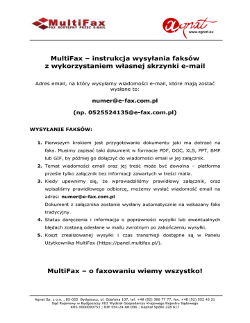 MultiFax – instrukcja wysyłania faksów z wykorzystaniem własnej skrzynki e-mail Adres email, na który wysyłamy wiadomości e-mail, które mają zostać wysłane to: [email protected] (np. [email protected]) WYSYŁANIE FAKSÓW: 1. Pierwszym krokiem jest przygotowanie dokumentu jaki ma dotrzeć na faks. Musimy zapisać taki dokument w formacie PDF, DOC, XLS, PPT, BMP lub GIF, by później go dołączyć do wiadomości email w jej załącznik. 2. Temat wiadomości email oraz jej treść moŜe być dowolna – platforma prześle tylko załącznik bez informacji zawartych w treści maila. 3. Kiedy upewnimy się, Ŝe wprowadziliśmy prawidłowy załącznik, oraz wpisaliśmy prawidłowego odbiorcę, moŜemy wysłać wiadomość email na adres: [email protected] Dokument z załącznika zostanie wysłany automatycznie na wskazany faks tradycyjny. 4. Status doręczenia i informacja o poprawności wysyłki lub ewentualnych błędach zostaną odesłane w mailu zwrotnym po zakończeniu wysyłki. 5. Koszt zrealizowanej wysyłki i czas transmisji dostępne są w Panelu UŜytkownika MultiFax (https://panel.multifax.pl/). MultiFax – o faxowaniu wiemy wszystko! Agnat Sp. z o.o. , 85-022 Bydgoszcz, ul. Gdańska 107, tel. +48 (52) 366 77 77, fax. +48 (52) 552 43 21 Sąd Rejonowy w Bydgoszczy XIII Wydział Gospodarczy Krajowego Rejestru Sądowego KRS 0000090753 ; NIP 554-24-68-096 ; Kapitał Spółki 228 617