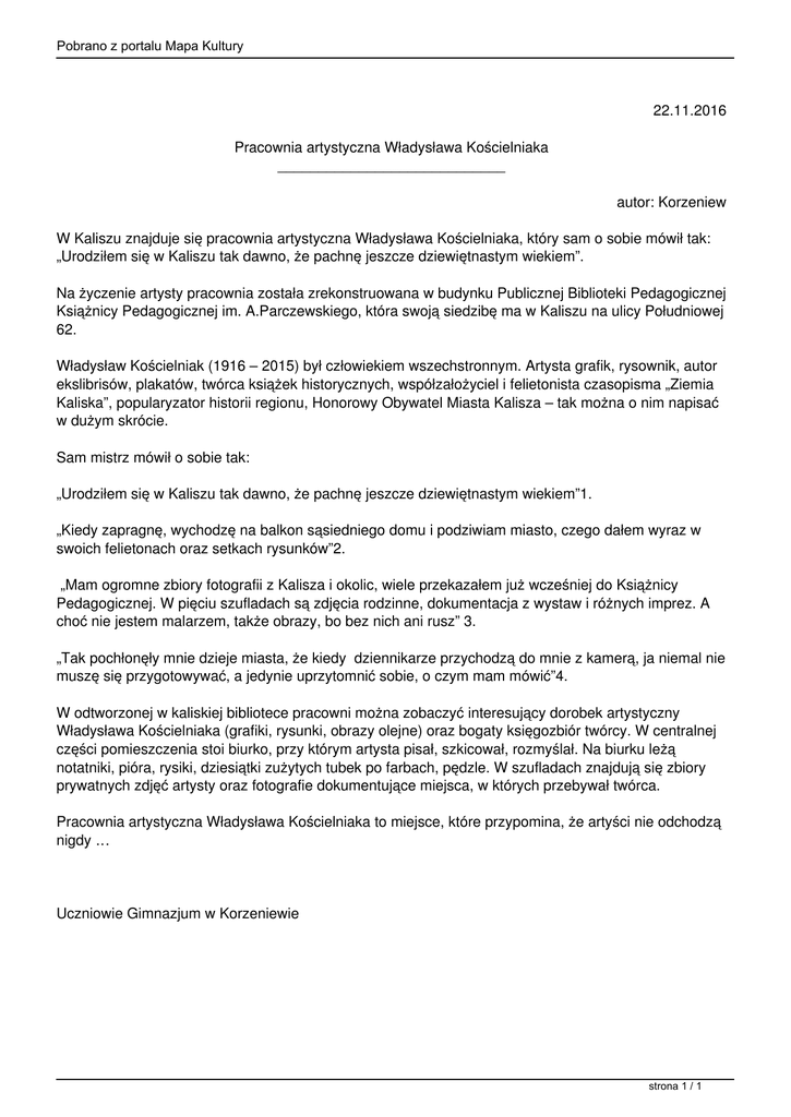 Pobrano z portalu Mapa Kultury 22.11.2016 Pracownia artystyczna Władysława Kościelniaka ____________________________ autor: Korzeniew W Kaliszu znajduje się pracownia artystyczna Władysława Kościelniaka, który sam o sobie mówił tak: „Urodziłem się w Kaliszu tak dawno, że pachnę jeszcze dziewiętnastym wiekiem”. Na życzenie artysty pracownia została zrekonstruowana w budynku Publicznej Biblioteki Pedagogicznej Książnicy Pedagogicznej im. A.Parczewskiego, która swoją siedzibę ma w Kaliszu na ulicy Południowej 62. Władysław Kościelniak (1916 – 2015) był człowiekiem wszechstronnym. Artysta grafik, rysownik, autor ekslibrisów, plakatów, twórca książek historycznych, współzałożyciel i felietonista czasopisma „Ziemia Kaliska”, popularyzator historii regionu, Honorowy Obywatel Miasta Kalisza – tak można o nim napisać w dużym skrócie. Sam mistrz mówił o sobie tak: „Urodziłem się w Kaliszu tak dawno, że pachnę jeszcze dziewiętnastym wiekiem”1. „Kiedy zapragnę, wychodzę na balkon sąsiedniego domu i podziwiam miasto, czego dałem wyraz w swoich felietonach oraz setkach rysunków”2. „Mam ogromne zbiory fotografii z Kalisza i okolic, wiele przekazałem już wcześniej do Książnicy Pedagogicznej. W pięciu szufladach są zdjęcia rodzinne, dokumentacja z wystaw i różnych imprez. A choć nie jestem malarzem, także obrazy, bo bez nich ani rusz” 3. „Tak pochłonęły mnie dzieje miasta, że kiedy dziennikarze przychodzą do mnie z kamerą, ja niemal nie muszę się przygotowywać, a jedynie uprzytomnić sobie, o czym mam mówić”4. W odtworzonej w kaliskiej bibliotece pracowni można zobaczyć interesujący dorobek artystyczny Władysława Kościelniaka (grafiki, rysunki, obrazy olejne) oraz bogaty księgozbiór twórcy. W centralnej części pomieszczenia stoi biurko, przy którym artysta pisał, szkicował, rozmyślał. Na biurku leżą notatniki, pióra, rysiki, dziesiątki zużytych tubek po farbach, pędzle. W szufladach znajdują się zbiory prywatnych zdjęć artysty oraz fotografie dokumentujące miejsca, w których przebywał twórca. Pracownia artystyczna Władysława Kościelniaka to miejsce, które przypomina, że artyści nie odchodzą nigdy … Uczniowie Gimnazjum w Korzeniewie strona 1 / 1