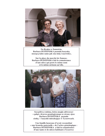 Na Rynku w Zamo ciu, Barbara DUDZINSKA poznała kuzynk nosz c takie same jak ona imi i nazwisko.. Sur la place du marché de Zamosc, Barbara DUDZINSKA fait la connaissance d’une nièce qui porte le même nom et le même prénom qu’elle. Szcz liwa rodzina, która mogła odtworzy « gał » drzewa genalogicznego ze strony ojca: Barbara DUDZI SKA poznała ciotk i kuzynki mieszkaj ce w Tyszowcach. Une famille heureuse d’avoir reconstitué « une branche paternelle » de l’arbre généalogique : Barbara DUDZINSKA a fait la connaissance d’une tante et de nièces habitant à Tyszowce