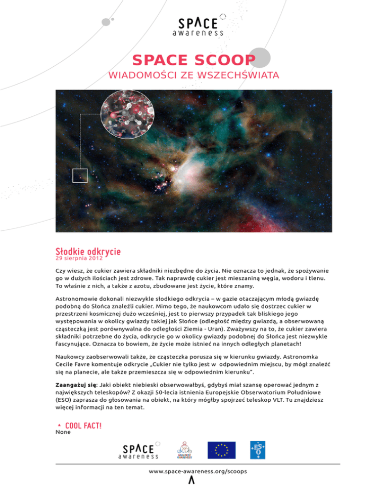 SPACE SCOOP WIADOMOŚCI ZE WSZECHŚWIATA Słodkie odkrycie 29 sierpnia 2012 Czy wiesz, że cukier zawiera składniki niezbędne do życia. Nie oznacza to jednak, że spożywanie go w dużych ilościach jest zdrowe. Tak naprawdę cukier jest mieszaniną węgla, wodoru i tlenu. To właśnie z nich, a także z azotu, zbudowane jest życie, które znamy. Astronomowie dokonali niezwykle słodkiego odkrycia – w gazie otaczającym młodą gwiazdę podobną do Słońca znaleźli cukier. Mimo tego, że naukowcom udało się dostrzec cukier w przestrzeni kosmicznej dużo wcześniej, jest to pierwszy przypadek tak bliskiego jego występowania w okolicy gwiazdy takiej jak Słońce (odległość między gwiazdą, a obserwowaną cząsteczką jest porównywalna do odległości Ziemia - Uran). Zważywszy na to, że cukier zawiera składniki potrzebne do życia, odkrycie go w okolicy gwiazdy podobnej do Słońca jest niezwykle fascynujące. Oznacza to bowiem, że życie może istnieć na innych odległych planetach! Naukowcy zaobserwowali także, że cząsteczka porusza się w kierunku gwiazdy. Astronomka Cecile Favre komentuje odkrycie „Cukier nie tylko jest w odpowiednim miejscu, by mógł znaleźć się na planecie, ale także przemieszcza się w odpowiednim kierunku”. Zaangażuj się: Jaki obiekt niebieski obserwowałbyś, gdybyś miał szansę operować jednym z największych teleskopów? Z okazji 50-lecia istnienia Europejskie Obserwatorium Południowe (ESO) zaprasza do głosowania na obiekt, na który mógłby spojrzeć teleskop VLT. Tu znajdziesz więcej informacji na ten temat. COOL FACT! None www.space-awareness.org/scoops