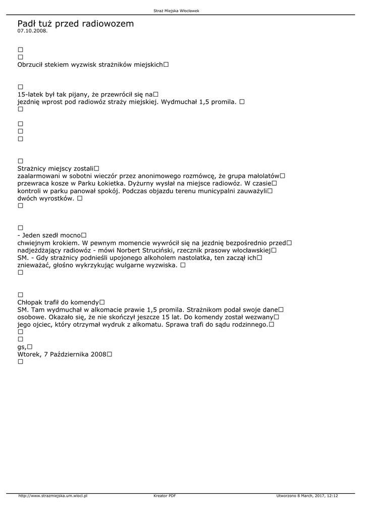 Straż Miejska Włocławek Padł tuż przed radiowozem 07.10.2008. Obrzucił stekiem wyzwisk strażników miejskich 15-latek był tak pijany, że przewrócił się na jezdnię wprost pod radiowóz straży miejskiej. Wydmuchał 1,5 promila. Strażnicy miejscy zostali zaalarmowani w sobotni wieczór przez anonimowego rozmówcę, że grupa małolatów przewraca kosze w Parku Łokietka. Dyżurny wysłał na miejsce radiowóz. W czasie kontroli w parku panował spokój. Podczas objazdu terenu municypalni zauważyli dwóch wyrostków. - Jeden szedł mocno chwiejnym krokiem. W pewnym momencie wywrócił się na jezdnię bezpośrednio przed nadjeżdżający radiowóz - mówi Norbert Struciński, rzecznik prasowy włocławskiej SM. - Gdy strażnicy podnieśli upojonego alkoholem nastolatka, ten zaczął ich znieważać, głośno wykrzykując wulgarne wyzwiska. Chłopak trafił do komendy SM. Tam wydmuchał w alkomacie prawie 1,5 promila. Strażnikom podał swoje dane osobowe. Okazało się, że nie skończył jeszcze 15 lat. Do komendy został wezwany jego ojciec, który otrzymał wydruk z alkomatu. Sprawa trafi do sądu rodzinnego. gs, Wtorek, 7 Października 2008 http://www.strazmiejska.um.wlocl.pl Kreator PDF Utworzono 8 March, 2017, 12:12