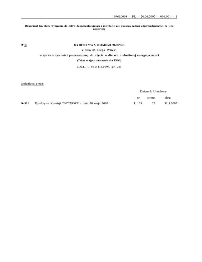 1996L0008 — PL — 20.06.2007 — 001.001 — 1 Dokument ten służy wyłącznie do celów dokumentacyjnych i instytucje nie ponoszą żadnej odpowiedzialności za jego zawartość ►B DYREKTYWA KOMISJI 96/8/WE z dnia 26 lutego 1996 r. w sprawie żywności przeznaczonej do użycia w dietach o obniżonej energetyczności (Tekst mający znaczenie dla EOG) (Dz.U. L 55 z 6.3.1996, str. 22) zmieniona przez: Dziennik Urzędowy nr ►M1 Dyrektywa Komisji 2007/29/WE z dnia 30 maja 2007 r. L 139 strona 22 data 31.5.2007 1996L0008 — PL — 20.06.2007 — 001.001 — 2 ▼B DYREKTYWA KOMISJI 96/8/WE z dnia 26 lutego 1996 r. w sprawie żywności przeznaczonej do użycia w dietach o obniżonej energetyczności (Tekst mający znaczenie dla EOG) KOMISJA WSPÓLNOT EUROPEJSKICH, uwzględniając Traktat ustanawiający Wspólnotę Europejską, uwzględniając dyrektywę Rady 89/398/EWG z dnia 3 maja 1989 r. w sprawie zbliżenia ustawodawstw Państw Członkowskich odnoszących się do środków spożywczych specjalnego przeznaczenia żywieniowego (1), w szczególności jej art. 4, a także mając na uwadze, co następuje: środki wspólnotowe przewidziane niniejszą dyrektywą nie wykraczają poza to, co jest niezbędne do realizacji celów już przewidzianych w dyrektywie 89/398/EWG; produkty objęte niniejszą dyrektywą są różnorodne i zazwyczaj wyróżnione jako te, które przeznaczone są do całkowitego lub częściowego zastąpienia całodziennej diety; produkty te powinny mieć taki skład, który pozwoli pokryć, w zależności od przypadku, dzienne zapotrzebowanie pokarmowe na podstawowe składniki odżywcze lub znaczną część tego zapotrzebowania osób, dla których są przeznaczone; stworzono ostatnio wiele produktów w celu zastąpienia przekąsek, jak również w celu dostarczenia organizmowi pewnych ilości wybranych podstawowych makro- i mikroelementów; podstawowy skład tych produktów zostanie ustalony w późniejszym terminie; ponadto wartość energetyczna produktów objętych niniejszą dyrektywą musi być ograniczona; wartość energetyczna niektórych produktów przeznaczonych do całkowitego lub częściowego zastąpienia całodziennej diety jest bardzo niska; szczególne zasady zostaną przyjęte dla tych produktów o niskiej wartości energetycznej w późniejszym terminie; niniejsza dyrektywa odzwierciedla aktualny stan wiedzy dotyczący tych produktów; wszelkie zmiany umożliwiające innowacje oparte na postępie naukowym i technicznym zostaną uchwalone zgodnie z procedurą ustanowioną w art. 13 dyrektywy 89/398/EWG; zgodnie z art. 4 ust. 2 dyrektywy 89/398/EWG przepisy odnoszące się do substancji o szczególnym przeznaczeniu odżywczym używanych przy wytwarzaniu produktów powinny zostać ustanowione w oddzielnej dyrektywie Komisji; przepisy odnoszące się do używania dodatków przy wytwarzaniu produktów powinny być ustanowione w odpowiednich dyrektywach Rady; zgodnie z art. 7 dyrektywy 89/398/EWG produkty objęte niniejszą dyrektywą podlegają ogólnym zasadom ustanowionym w dyrektywie Rady 79/112/EWG z dnia 18 grudnia 1978 r. w sprawie zbliżenia ustawodawstw Państw Członkowskich odnoszących się do etykietowania, prezentacji i reklamowania środków spożywczych przeznaczonych na sprzedaż konsumentowi końcowemu (2), ostatnio zmienionej dyrektywą Komisji 93/102/WE (3); niniejsza dyrektywa, gdzie właściwe, przyjmuje i rozszerza uzupełnienia do i wyjątki od tych ogólnych zasad; (1) Dz.U. L 186 z 30.6.1989, str. 27. (2) Dz.U. L 33 z 8.2.1979, str. 1. (3) Dz.U. L 291 z 29.11.1993, str. 14. 1996L0008 — PL — 20.06.2007 — 001.001 — 3 ▼B w szczególności charakter i przeznaczenie produktów objętych niniejszą dyrektywą wymaga podania na etykiecie ich wartości energetycznej oraz najważniejszych składników odżywczych, które zawierają; zgodnie z art. 4 dyrektywy 89/398/EWG zasięgnięto opinii Komitetu Naukowego ds. Żywności w sprawie przepisów mogących mieć znaczenie dla zdrowia publicznego; środki przewidziane w niniejszej dyrektywie są zgodne z opinią Stałego Komitetu ds. Środków Spożywczych, PRZYJMUJE NINIEJSZĄ DYREKTYWĘ: Artykuł 1 1. Niniejsza dyrektywa jest „dyrektywą szczegółową” w rozumieniu art. 4 dyrektywy 89/398/EWG. Ustala ona wymagania dotyczące składu i etykietowania żywności specjalnego przeznaczenia żywieniowego do użycia w dietach o ograniczonej zawartości energii w celu redukcji masy ciała i przedstawianych jako takie. 2. Żywność przeznaczona do użycia w dietach o ograniczonej zawartości energii w celu redukcji masy ciała to żywność specjalnie przygotowana, która użyta zgodnie z instrukcją producenta zastępuje całkowicie lub częściowo całodzienną dietę. Żywność ta dzieli się na dwie kategorie: a) produkty przedstawiane jako zamienniki całodziennej diety; b) produkty przedstawiane jako zamienniki jednego posiłku lub większej liczby posiłków w ciągu dnia. Artykuł 2 Państwa Członkowskie zapewniają, aby produkty określone w art. 1 zostały wprowadzone do obrotu we Wspólnocie jedynie wówczas, gdy są zgodne z przepisami ustanowionymi w niniejszej dyrektywie. Artykuł 3 Skład żywności objętej niniejszą dyrektywą musi być zgodny z kryteriami dotyczącymi składu wymienionymi w załączniku I. Artykuł 4 Wszystkie składniki tworzące produkty określone w art. 1 ust. 2 lit. a), muszą być wprowadzane do obrotu w jednym wspólnym opakowaniu. Artykuł 5 1. Nazwa, pod którą produkt jest wprowadzany do obrotu, brzmi: a) dla produktów objętych art. 1 ust. 2 lit. a), „Całkowite zastąpienie diety w celu kontroli masy ciała”; b) dla produktów objętych art. 1 ust. 2 lit. b), „Zastąpienie posiłku w celu kontroli masy ciała”. 2. Etykiety wymienionych produktów muszą zawierać, poza informacjami przewidzianymi w art. 3 dyrektywy Rady 79/112/EWG następujące obowiązkowe dane szczegółowe: a) wartość dostępnej energii wyrażoną w kJ