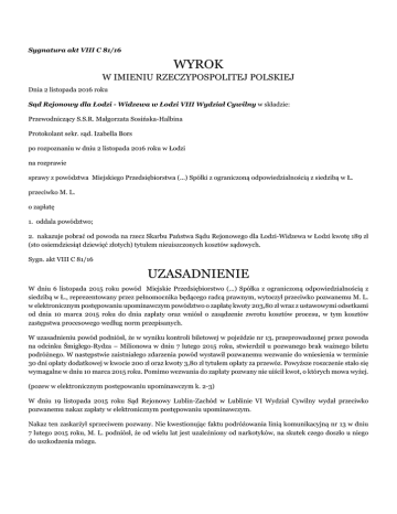 Sygnatura akt VIII C 81/16 WYROK W IMIENIU RZECZYPOSPOLITEJ POLSKIEJ Dnia 2 listopada 2016 roku Sąd Rejonowy dla Łodzi - Widzewa w Łodzi VIII Wydział Cywilny w składzie: Przewodniczący S.S.R. Małgorzata Sosińska-Halbina Protokolant sekr. sąd. Izabella Bors po rozpoznaniu w dniu 2 listopada 2016 roku w Łodzi na rozprawie sprawy z powództwa Miejskiego Przedsiębiorstwa (...) Spółki z ograniczoną odpowiedzialnością z siedzibą w Ł. przeciwko M. L. o zapłatę 1. oddala powództwo; 2. nakazuje pobrać od powoda na rzecz Skarbu Państwa Sądu Rejonowego dla Łodzi-Widzewa w Łodzi kwotę 189 zł (sto osiemdziesiąt dziewięć złotych) tytułem nieuiszczonych kosztów sądowych. Sygn. akt VIII C 81/16 UZASADNIENIE W dniu 6 listopada 2015 roku powód Miejskie Przedsiębiorstwo (...) Spółka z ograniczoną odpowiedzialnością z siedzibą w Ł., reprezentowany przez pełnomocnika będącego radcą prawnym, wytoczył przeciwko pozwanemu M. L. w elektronicznym postępowaniu upominawczym powództwo o zapłatę kwoty 203,80 zł wraz z ustawowymi odsetkami od dnia 10 marca 2015 roku do dnia zapłaty oraz wniósł o zasądzenie zwrotu kosztów procesu, w tym kosztów zastępstwa procesowego według norm przepisanych. W uzasadnieniu powód podniósł, że w wyniku kontroli biletowej w pojeździe nr 13, przeprowadzonej przez powoda na odcinku Śmigłego-Rydza – Milionowa w dniu 7 lutego 2015 roku, stwierdził u pozwanego brak ważnego biletu podróżnego. W następstwie zaistniałego zdarzenia powód wystawił pozwanemu wezwanie do wniesienia w terminie 30 dni opłaty dodatkowej w kwocie 200 zł oraz kwoty 3,80 zł tytułem opłaty za przewóz. Powyższe roszczenie stało się wymagalne w dniu 10 marca 2015 roku. Pomimo wezwania do zapłaty pozwany nie uiścił kwot, o których mowa wyżej. (pozew w elektronicznym postępowaniu upominawczym k. 2-3) W dniu 19 listopada 2015 roku Sąd Rejonowy Lublin-Zachód w Lublinie VI Wydział Cywilny wydał przeciwko pozwanemu nakaz zapłaty w elektronicznym postępowaniu upominawczym. Nakaz ten zaskarżył sprzeciwem pozwany. Nie kwestionując faktu podróżowania linią komunikacyjną nr 13 w dniu 7 lutego 2015 roku, M. L. podniósł, że od wielu lat jest uzależniony od narkotyków, na skutek czego doszło u niego do uszkodzenia mózgu. Postanowieniem z dnia 3 grudnia 2015 roku Sąd Rejonowy Lublin-Zachód w Lublinie stwierdził skuteczne wniesienie sprzeciwu i utratę mocy nakazu zapłaty w całości oraz przekazał sprawę do rozpoznania tutejszemu Sądowi. (nakaz zapłaty k. 4, sprzeciw k. 4v.-5, postanowienie k. 10v.) W piśmie procesowym z dnia 2 luty 2016 roku strona powodowa, uzupełniając pozew po przekazaniu do tutejszego Sądu, podtrzymała w całości żądanie pozwu. (pismo procesowe pełnomocnika powoda k. 14) W odpowiedzi na sprzeciw powód podtrzymał żądanie pozwu. (odpowiedź na sprzeciw k. 25-27) Na rozprawie w dniu 13 kwietnia 2016 roku pełnomocnik powoda nie stawił się. Ustanowiony przez pozwanego niezawodowy pełnomocnik wniósł o oddalenie powództwa w całości. Nie negując faktu podróżowania przez pozwanego bez biletu wskazał, że pozwany ma zaburzenia świadomości i nie zawsze jest świadomy tego co robi, nawet jak wsiada do środka komunikacji miejskiej. Dodał, że pozwany ma orzeczony II stopień niepełnosprawności z powodu uszkodzenia mózgu, cierpi ponadto na zapalenie wątroby typu B i C. (protokół rozprawy k. 33-34) Postanowieniem z dnia 28 kwietna 2016 roku pozwany został zwolniony od kosztów sądowych w całości. (postanowienie k. 42) W toku dalszego postępowania stanowiska stron nie uległy zmianie, przy czym na rozprawie w dniu 2 listopada 2016 roku pełnomocnicy stron nie stawili się. (pismo procesowe powoda k. 37-41, protokół rozprawy k. 60-61) Sąd Rejonowy ustalił następujący stan faktyczny: W dniu 7 lutego 2015 roku pozwany M. L. zawarł z powodem umowę przewozu podróżując tramwajem linii 13, należącym do taboru (...) Spółki z o.o. w Ł., która wykonywała zadania zlecone przez Gminę Ł. w zakresie lokalnego transportu zbiorowego. W trakcie podróży pozwany został skontrolowany przez kontrolera biletów nr (...), który po stwierdzeniu, że pozwany nie posiada biletu, wystawił na niego wezwanie do wniesienia opłaty dodatkowej w wysokości 200 zł oraz opłaty za podróż w wysokości 3,80 zł, zgodnie z właściwą uchwałą Rady Miejskiej w Ł. oraz przepisami porządkowymi lokalnego transportu zbiorowego w Ł.. Wskazane opłaty podlegały uiszczeniu na rzecz powoda w terminie 30 dni. (kserokopia wezwania do wniesienia opłaty dodatkowej k. 20, okoliczności bezsporne) Pismem z dnia 13 kwietnia 2015 roku powód wezwał pozwanego do zapłaty kwoty 211,53 zł, pod rygorem skierowania sprawy na drogę postępowania sądowego, które to wezwanie okazało się jednak bezskuteczne. (ostateczne wezwanie do zapłaty k. 21, okoliczności bezsporne) Pozwany M. L. ujawnia organiczne zaburzenia osobowości spowodowane toksycznym uszkodzeniem ośrodkowego układu nerwowego. Zaburzenia dotyczą wyrażania potrzeb, emocji i impulsów. Ujawniane przez pozwanego zaburzenia procesów poznawczych dotyczą planowania, przewidywania prawdopodobnych następstw indywidualnych i społecznych. W związku z wieloletnim uzależnieniem od środków psychoaktywnych, pozwany był wielokrotnie hospitalizowany na oddziale detoksykacyjnym (...) Psychiatrycznego ZOZ w Ł.. M. L. posiada orzeczenie o umiarkowanym stopniu niepełnosprawności, m.in. z powodu choroby psychicznej (symbol przyczyny niepełnosprawności 02-P), przy czym stopień ten datuje się od dnia 2 kwietnia 2014 roku. W dacie zdarzenia pozwany znajdował się w stanie wyłączającym świadome albo swobodne powzięcie decyzji i wyrażenie woli, na skutek czego nie był zdolny do zawarcia umowy przewozu. (opinia sądowo-psychiatryczna k. 53-54, orzeczenie o stopniu niepełnosprawności k. 5v.-6, dokumentacja medyczna k. 6v.-7, k.